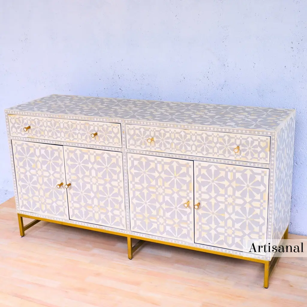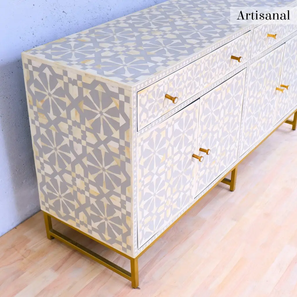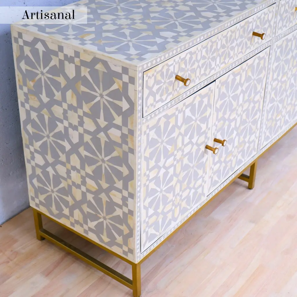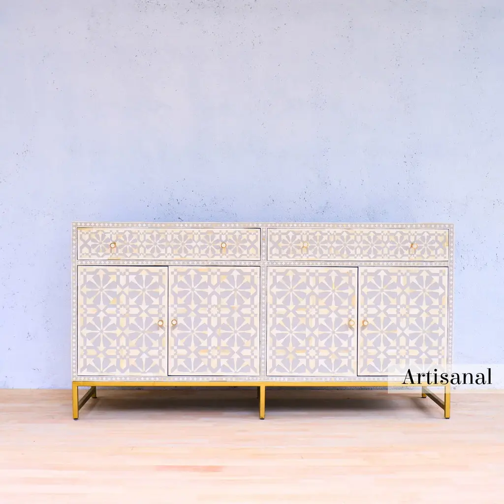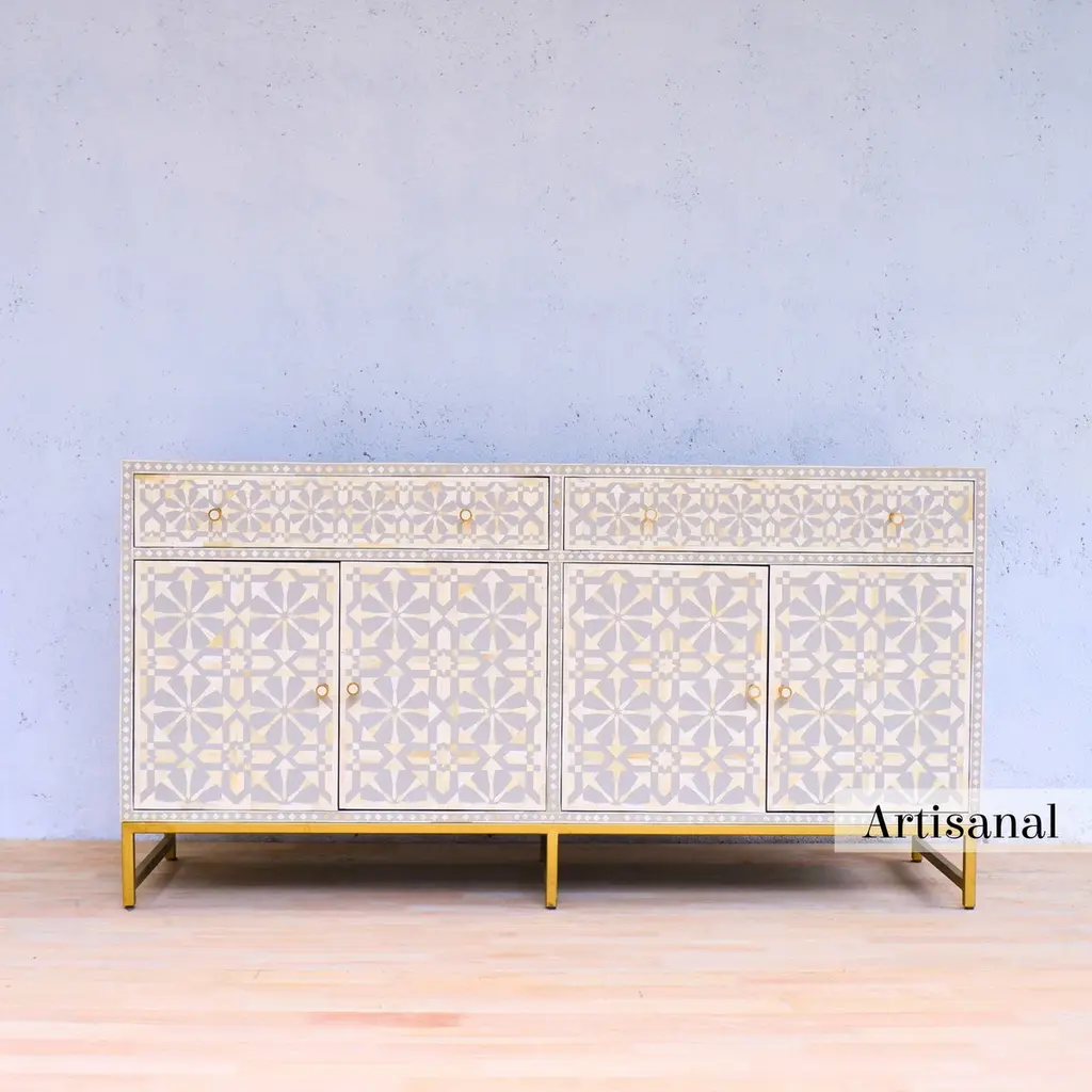 Elevate your home with Artisanal's exquisite grey inlay sideboard — a stunning addition that seamlessly blends timeless craftsmanship with modern sophistication.Adorned with intricate moroccan zellige, this sideboard showcases the artistry of traditional bone inlay, honouring the ancient craft of decorated furniture. Finished with sleek brass finish metal legs and knobs, it exudes a contemporary charm while retaining its classic allure.How It’s Made:Handcrafted with meticulous care, each piece is a true masterpiece, created through a traditional inlay process. It features over 2,000 small pieces of bone, carefully shaped into leaf or custom patterns. Each piece is precisely glued onto the surface to form the intricate design, followed by the application of color to enhance its beauty.Handcrafted in India by the artisans of Artisanal.For added safety during transit, we pack the knobs separately, ensuring your sideboard arrives in pristine condition.Indulge in luxury and elevate your space with our bone inlay sideboard —a masterpiece that exudes elegance and sophistication, making it the perfect centerpiece for any dining room.At Artisanal, our mission is to revive and preserve India’s traditional arts by blending age-old techniques with contemporary design. Every piece we create is a testament to this philosophy, merging the beauty of the past with today’s functionality and aesthetics.For the past six years, with a team of skilled artisans and innovative designers, we’ve crafted every item in-house to ensure the highest quality and attention to detail. Our timeless pieces are designed not only for today but to be cherished for generations.