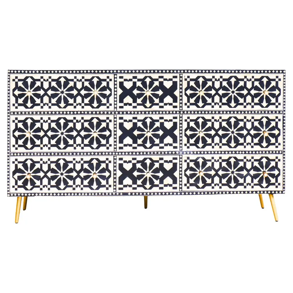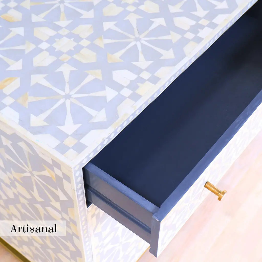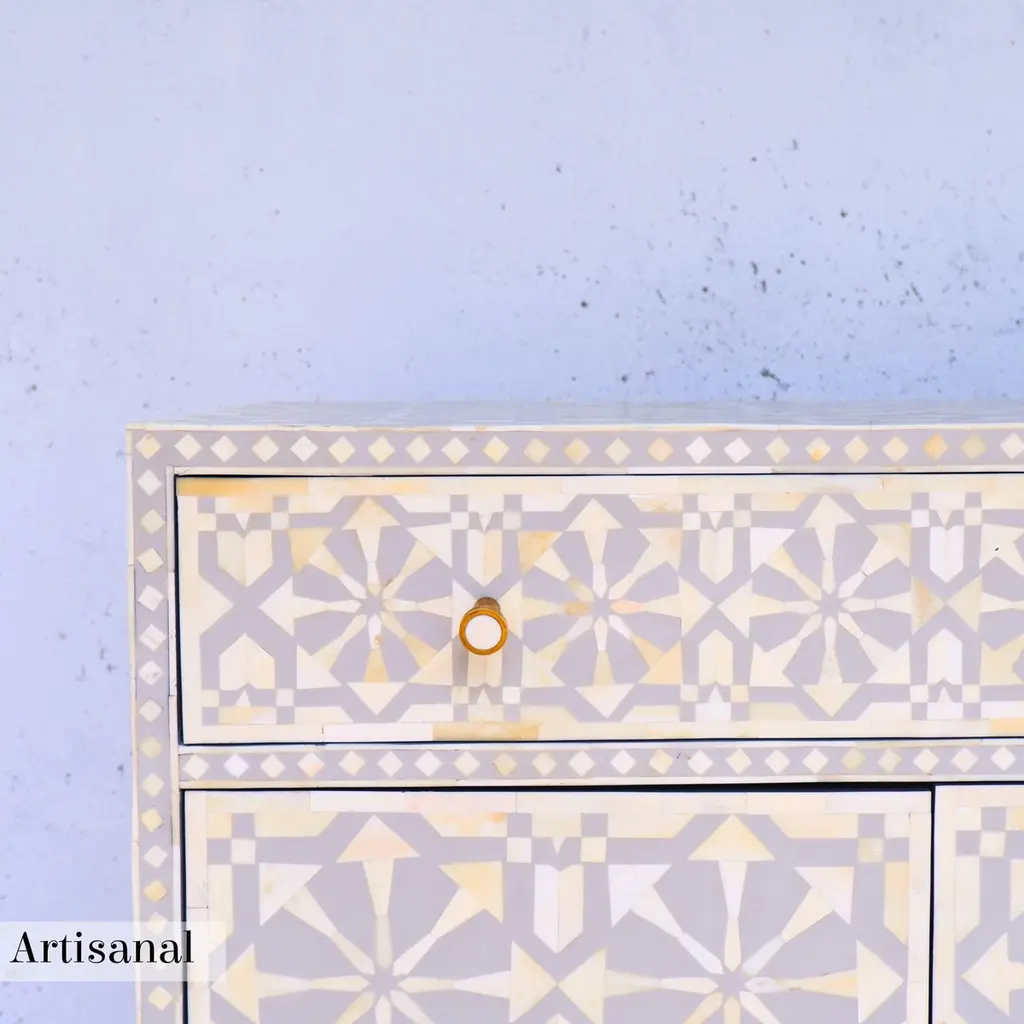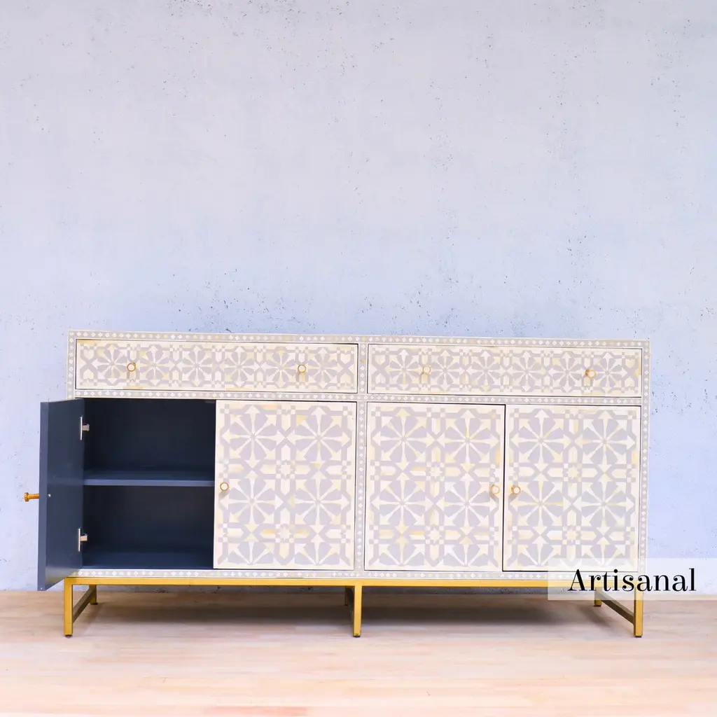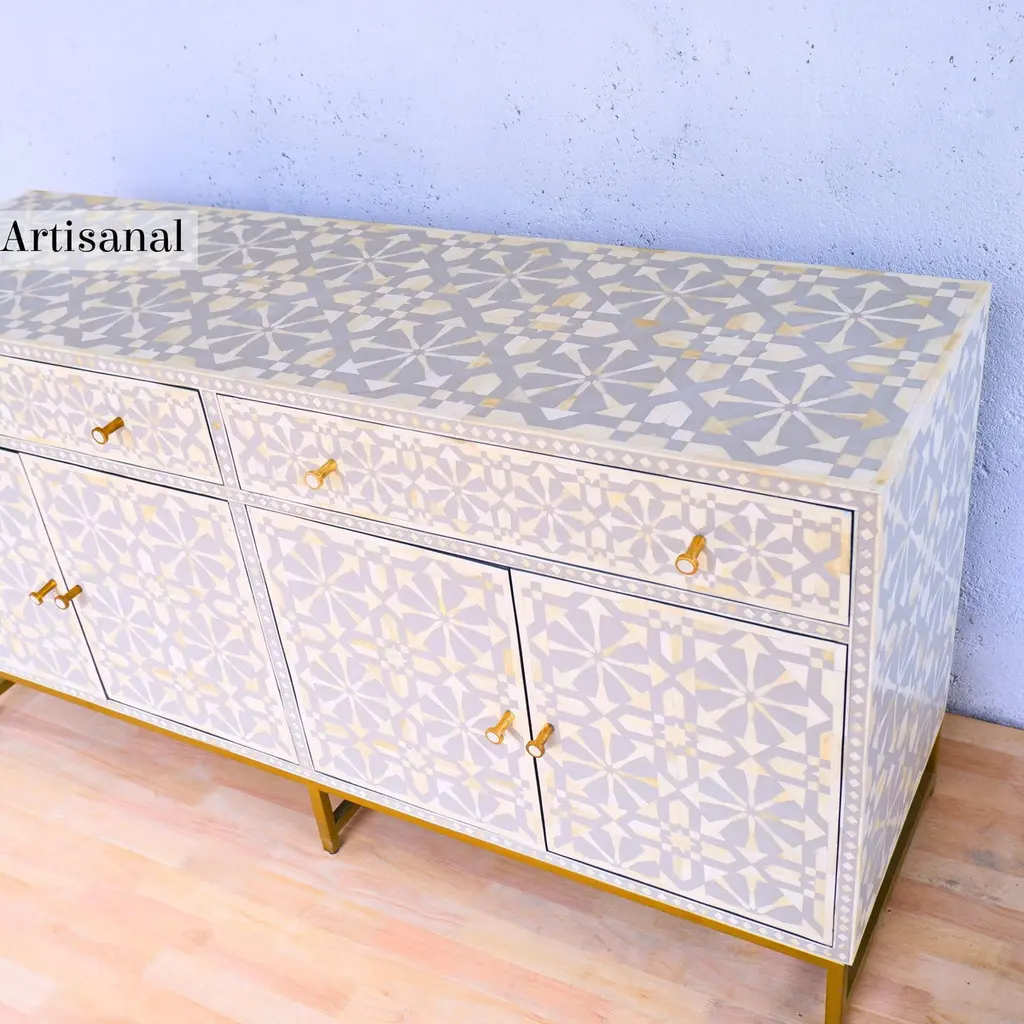 Elevate your home with Artisanal's exquisite grey inlay sideboard — a stunning addition that seamlessly blends timeless craftsmanship with modern sophistication.Adorned with intricate moroccan zellige, this sideboard showcases the artistry of traditional bone inlay, honouring the ancient craft of decorated furniture. Finished with sleek brass finish metal legs and knobs, it exudes a contemporary charm while retaining its classic allure.How It’s Made:Handcrafted with meticulous care, each piece is a true masterpiece, created through a traditional inlay process. It features over 2,000 small pieces of bone, carefully shaped into leaf or custom patterns. Each piece is precisely glued onto the surface to form the intricate design, followed by the application of color to enhance its beauty.Handcrafted in India by the artisans of Artisanal.For added safety during transit, we pack the knobs separately, ensuring your sideboard arrives in pristine condition.Indulge in luxury and elevate your space with our bone inlay sideboard —a masterpiece that exudes elegance and sophistication, making it the perfect centerpiece for any dining room.At Artisanal, our mission is to revive and preserve India’s traditional arts by blending age-old techniques with contemporary design. Every piece we create is a testament to this philosophy, merging the beauty of the past with today’s functionality and aesthetics.For the past six years, with a team of skilled artisans and innovative designers, we’ve crafted every item in-house to ensure the highest quality and attention to detail. Our timeless pieces are designed not only for today but to be cherished for generations.
