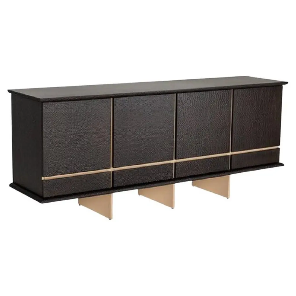 32"H X 76.5"W X 18"D Finished in gold-cerused black, this modern sideboard is set on an arching steel base. There are four doors, each with a single piece of faux crocodile hide. The faux crocodile is finished in a variegated black with distressed gold cerusing. The front inset and metal base are in dark Aztec gold. Push-latches are fitted throughout, and adjustable shelves complete the interior.