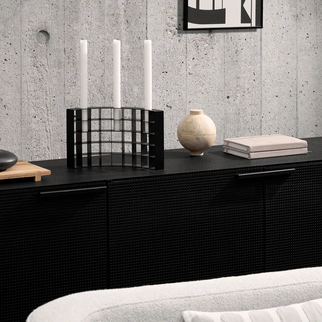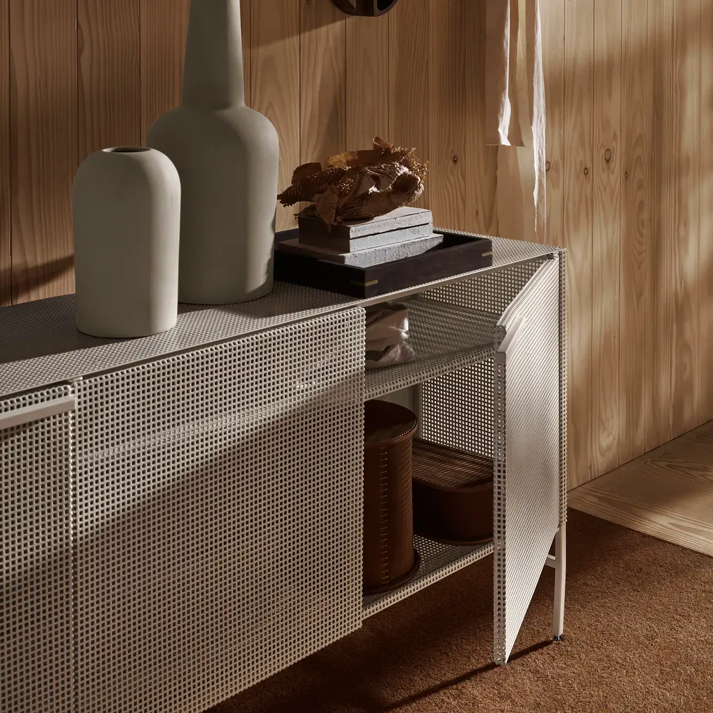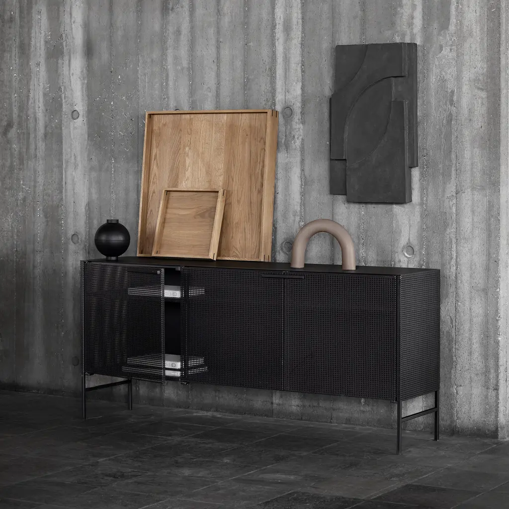 A modern sideboard that is as stylish as it is practical, the Kristina Dam Studio Grid Sideboard has a minimalist appearance to look fantastic anywhere. Versatile furniture at its best, this design can be used to store office supplies and stationery in a home workspace or as a modern buffet cabinet for tableware and glassware. Either way, the Grid Sideboard enhances any room’s design scheme with an understated elegance. Made from powder-coated steel, the sideboard features perforated panels on the sides, front, and top. As a result, this modern sideboard buffet has an airy look, even in the black version. As for the interior, it offers plenty of room for items like books, plates, clothing, or desk and office accessories thanks to two fixed shelves. Finally, the Kristina Dam Studio Grid Sideboard features three doors that open smoothly and close securely thanks to a magnetic lock.