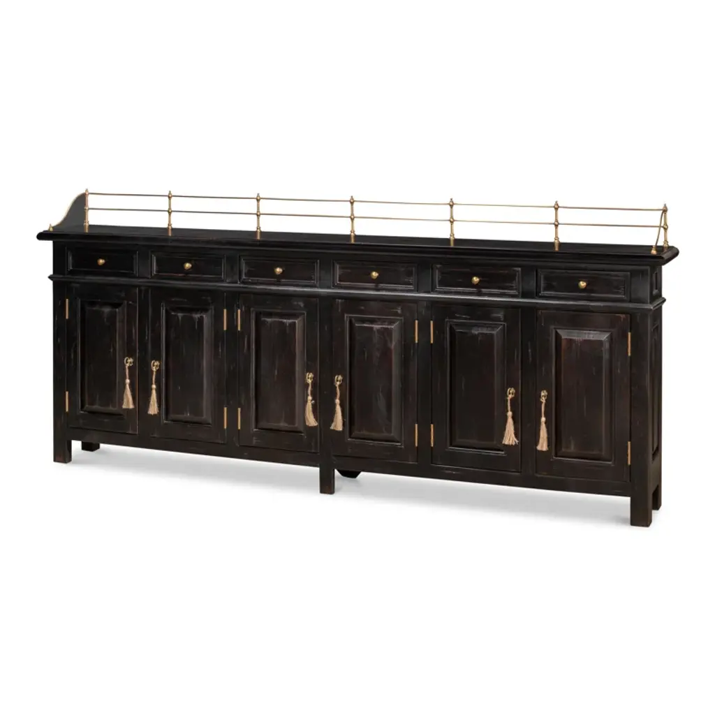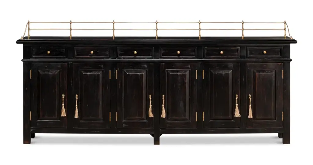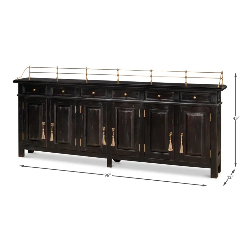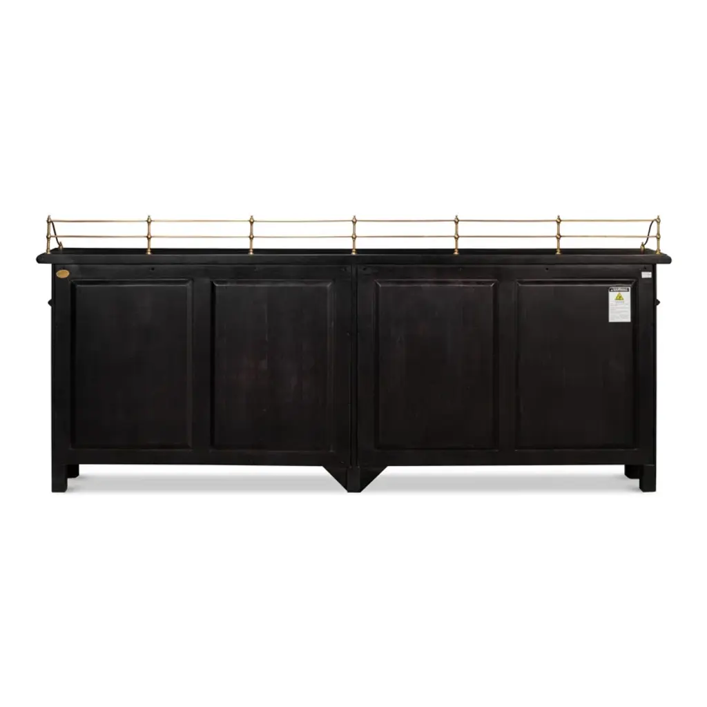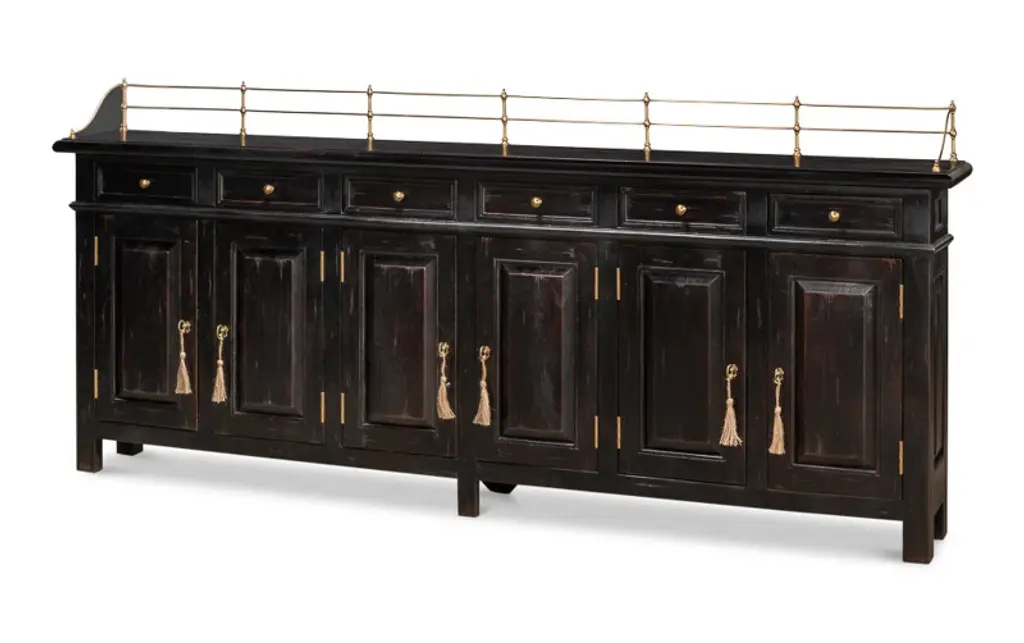 Remember when they said black and gold were going to be trending? We've done it for years. We think you will love this narrow 12" deep sideboard with the brass galley. Six doors and sides have raised panel details.