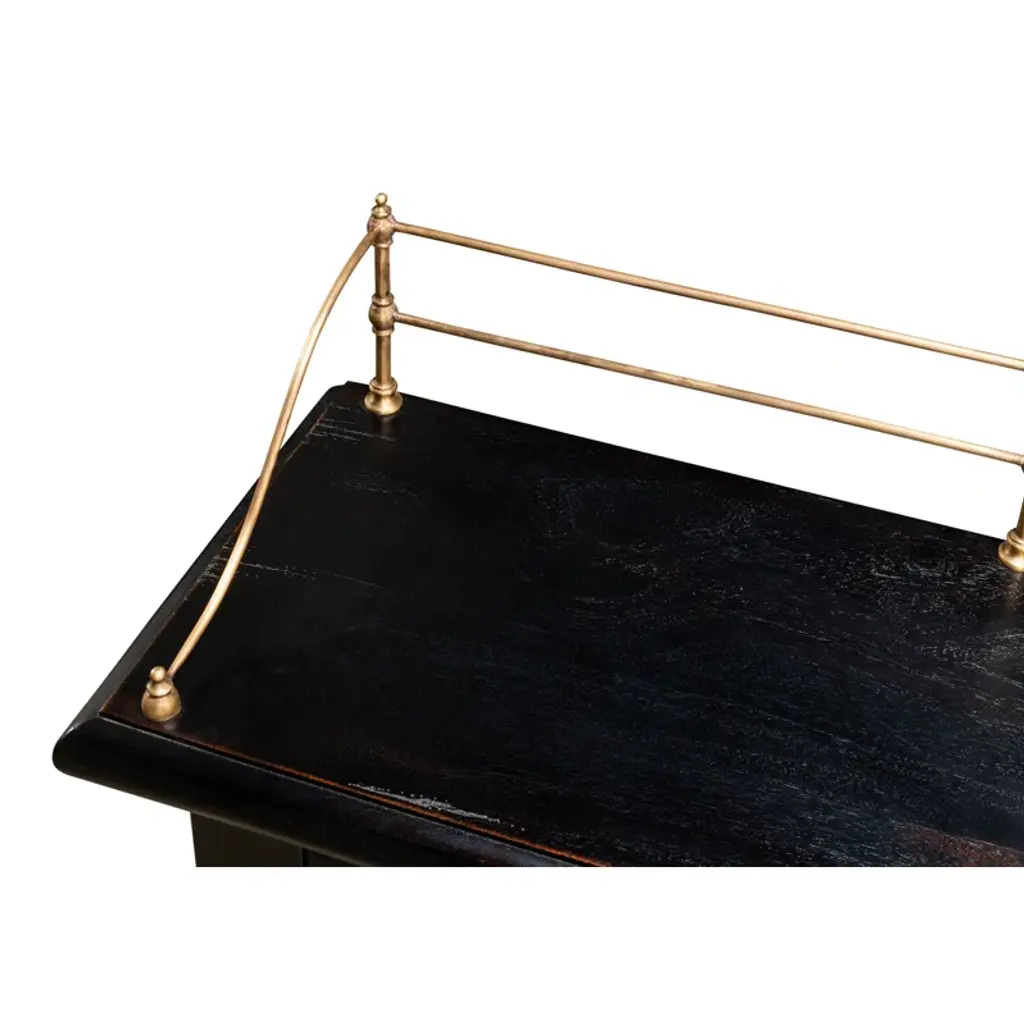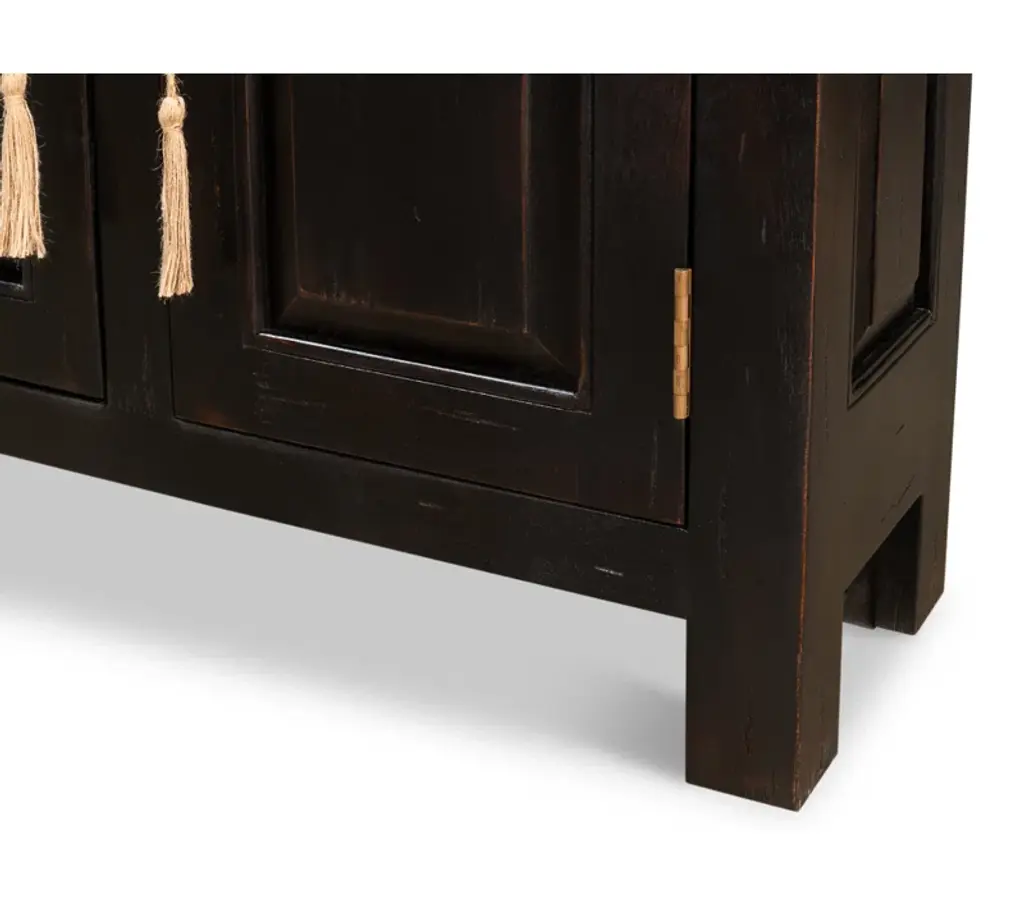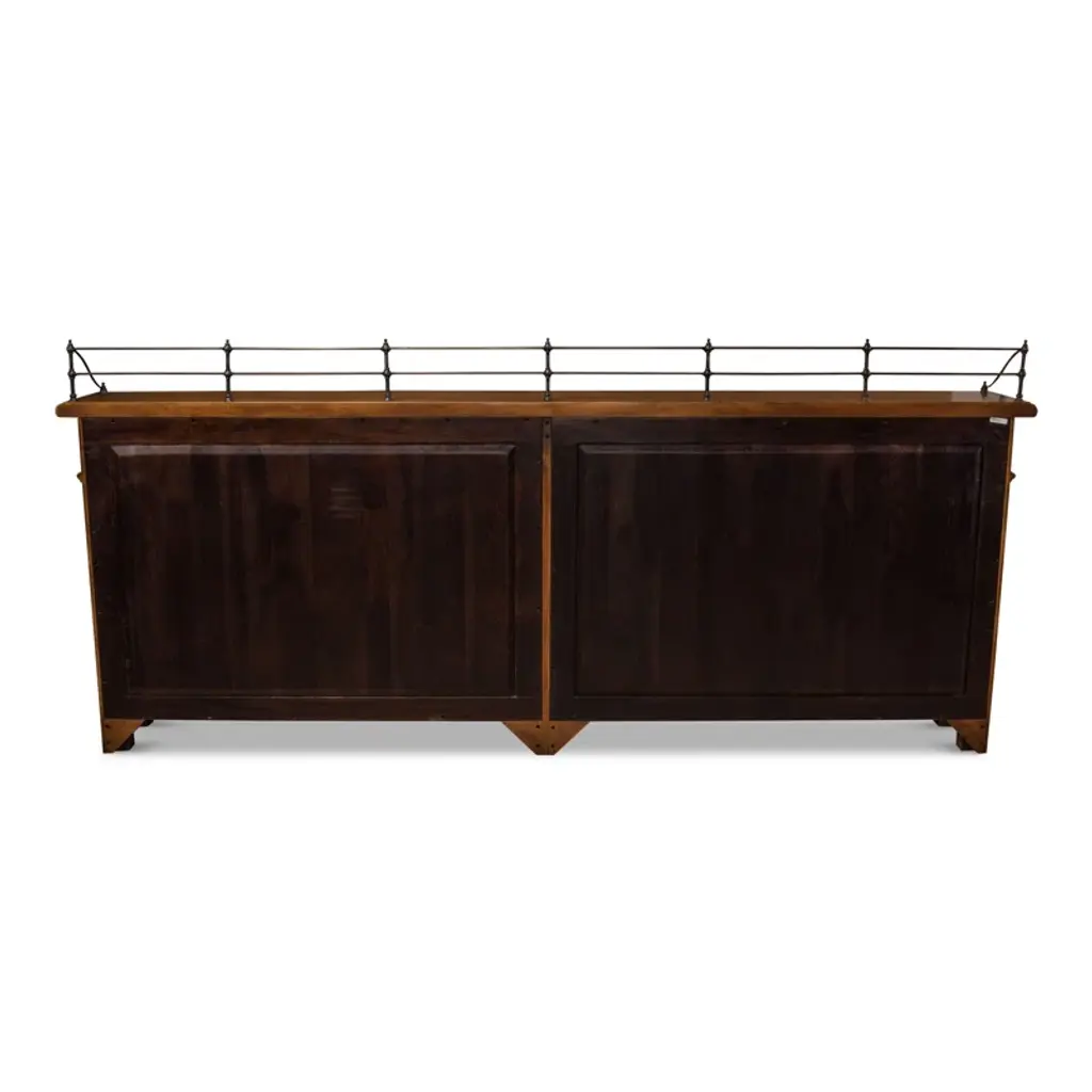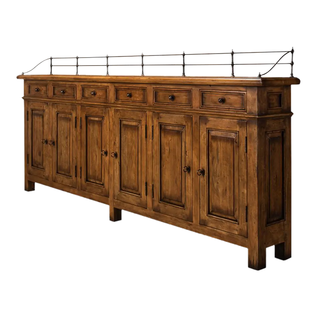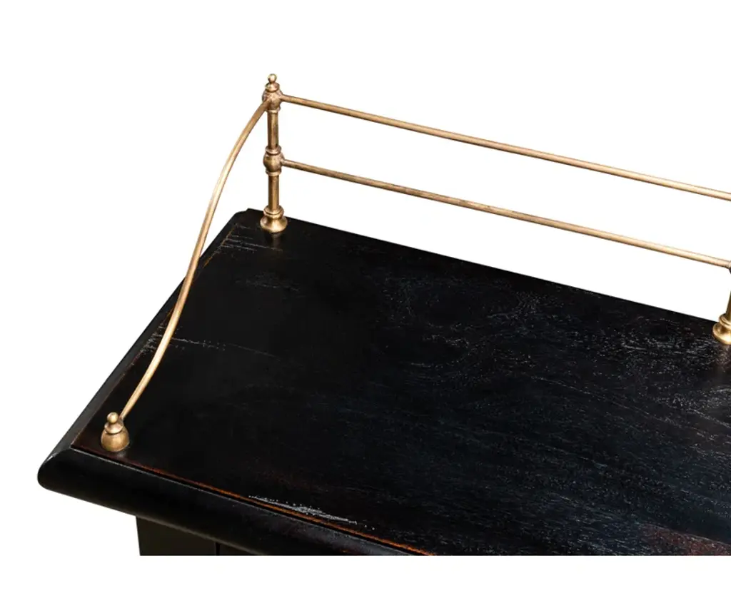 Remember when they said black and gold were going to be trending? We've done it for years. We think you will love this narrow 12" deep sideboard with the brass galley. Six doors and sides have raised panel details.