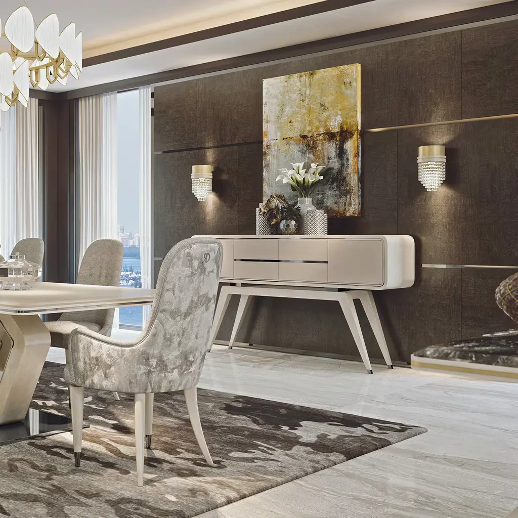 Blending mid-century modern shapes with fresh finishes, the Hanami Sideboard is a stunning addition to a contemporary living space. On solid wood legs with a dramatic flare, the sideboard features rounded corners, providing a unique contrast. Completing the sideboard are two side doors and four central drawers. Completely customizable with different veneers and lacquers.