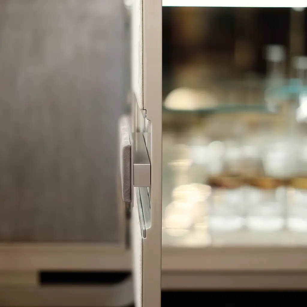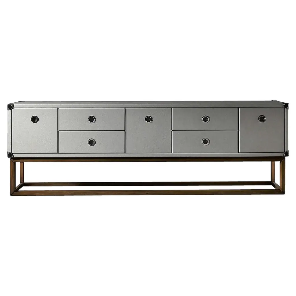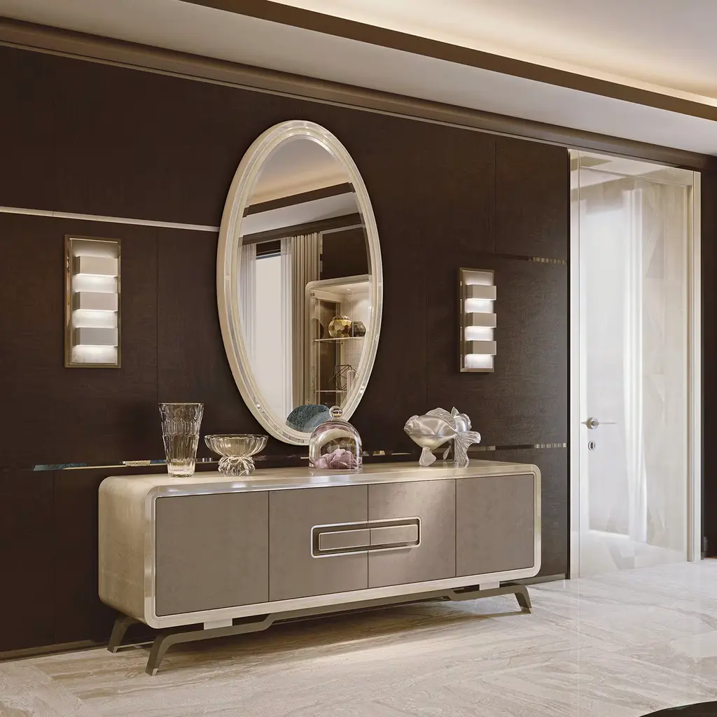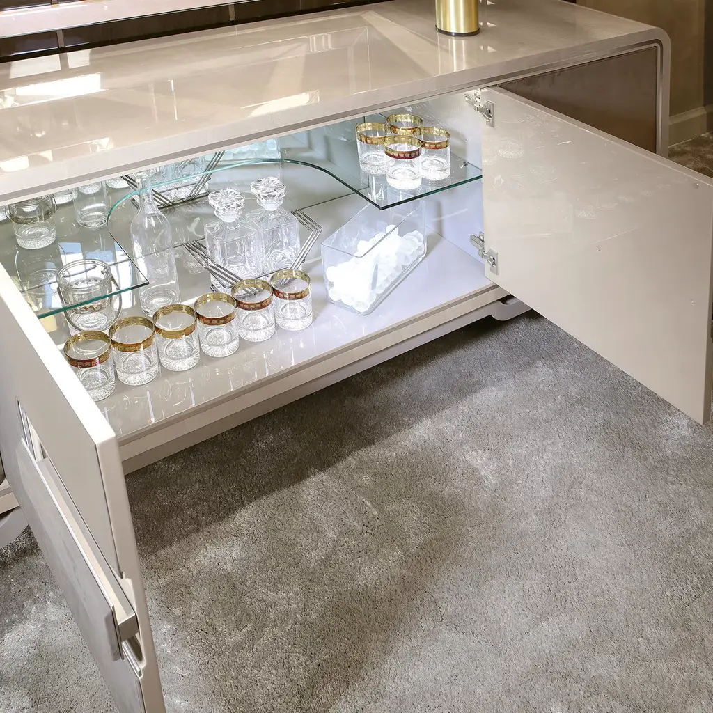 This wooden sideboard combines a polyester Sycamore Frisé veneer with a high-gloss Visone lacquered finish, topped with satin palladium metal accents. Its four doors are upholstered in stitched nubuck: the two outer doors feature innovative push-pull systems, whilst the inner doors are equipped with soft-close mechanisms and tonal nubuck handles. Complete with an inside soft-close drawer and a concealed mirror.
