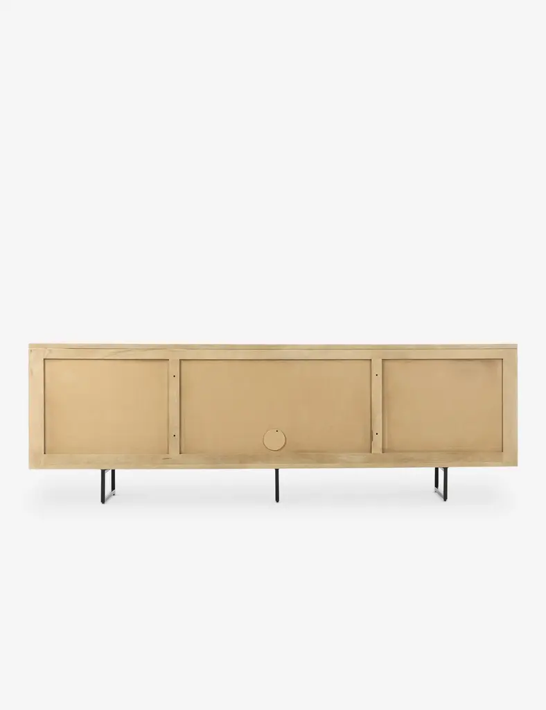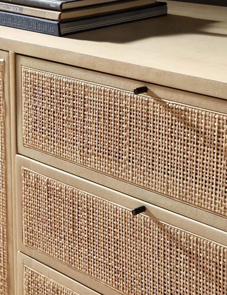 Woven cane drawer and door fronts add organic warmth and visual texture to the Hannah sideboard. Small, circular pulls lend a touch of tailored elegance, while an angular gunmetal base brings a crisp, modern finish. This wide sideboard cabinet offers generous storage and a naturally elevated look for your dining room or living space.