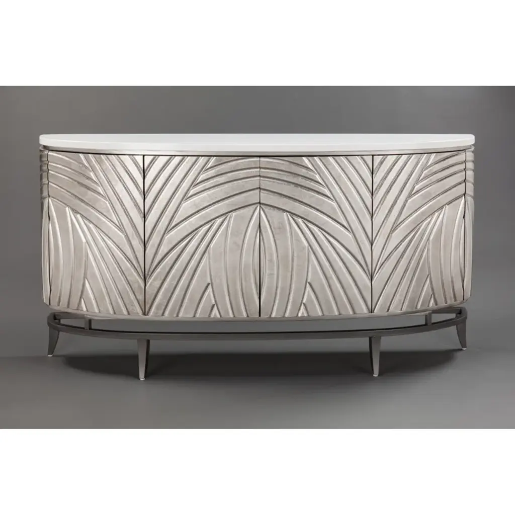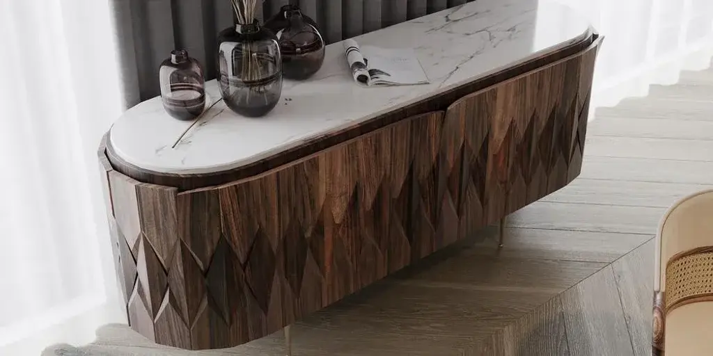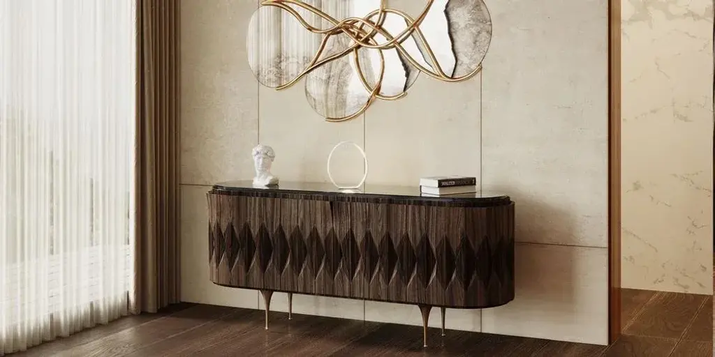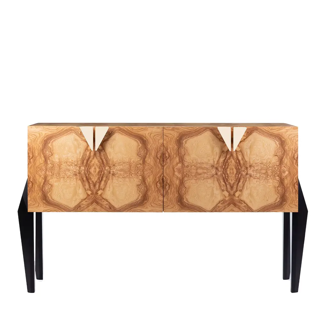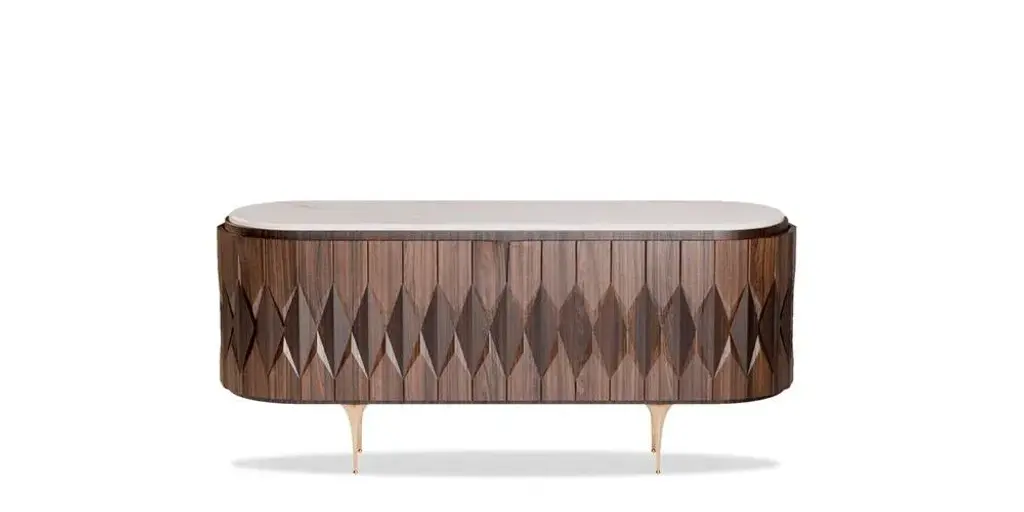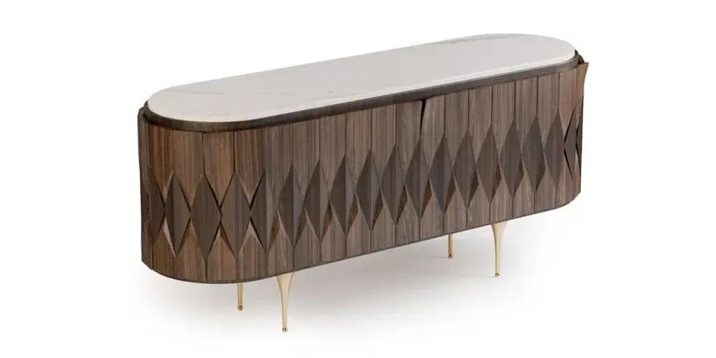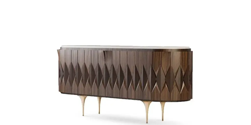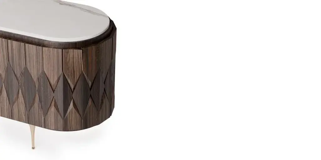 Handmade from the finest materials, with a sense of luxury and aesthetics achieved only by our designers, the Harlequin sideboard is an essential piece of pure elegance and style for your dining room. Top in White Estremoz marble. Body in ash wood (solid and veneer) in matt, with normal and darkened finish. Drawers & interior: special effect in Golden Nickel. Legs in Brass metal effect with gloss finish. Labeled by Maker