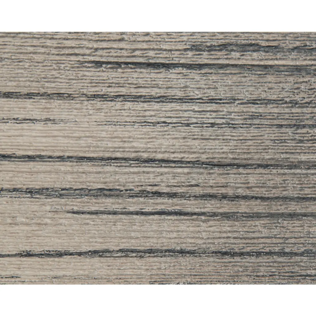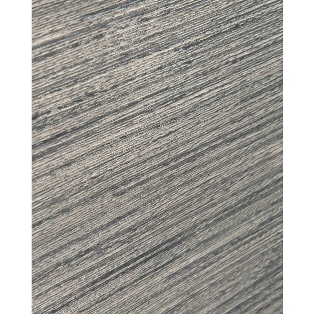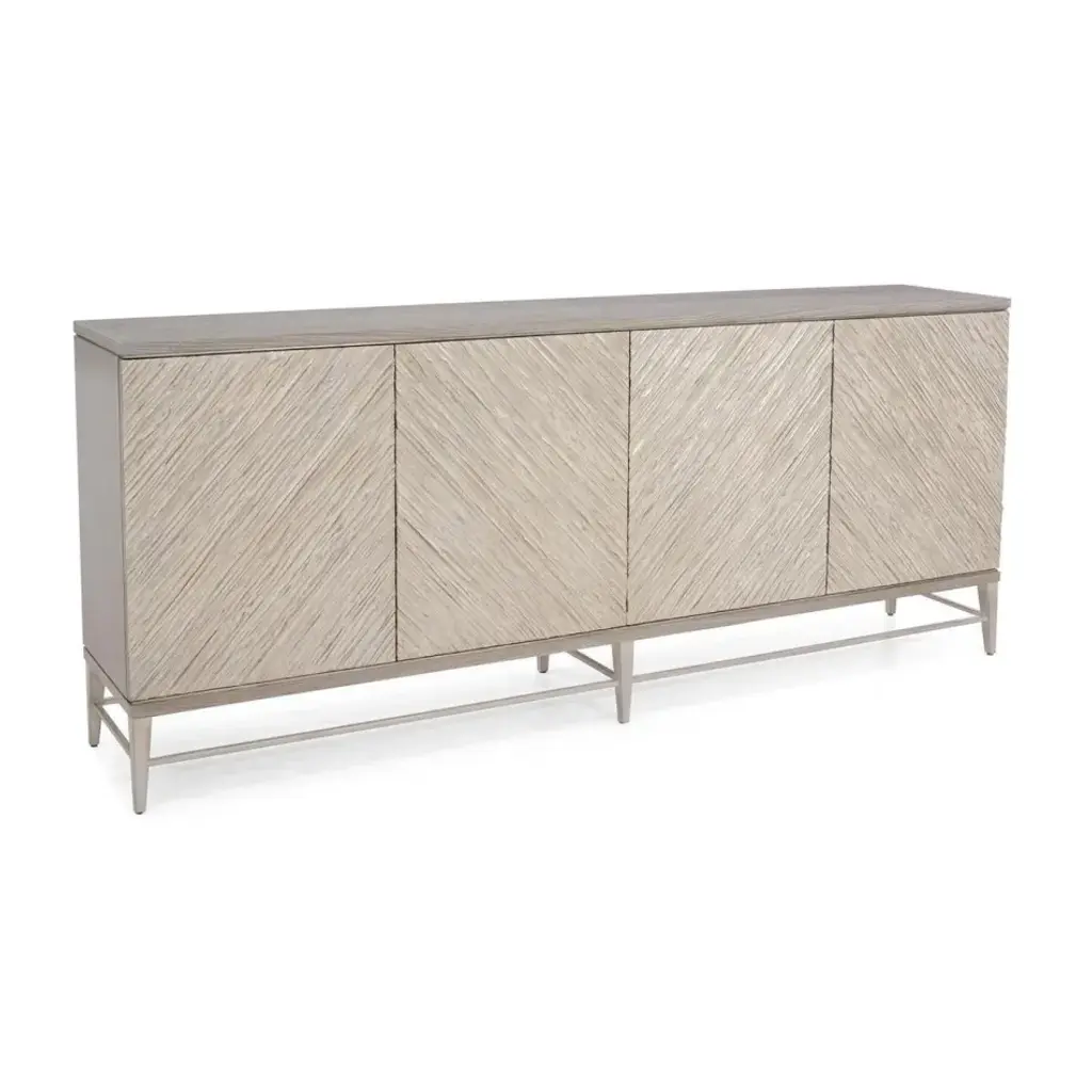 A four-door, three-drawer sideboard in oak in a grey driftwood finish is mounted on a steel base in silver white. The doors and drawers are inlaid with a stringlike texture, and the entire front is finished in a continuous pattern of
