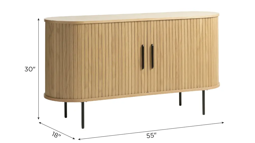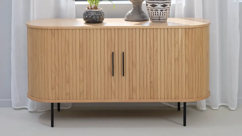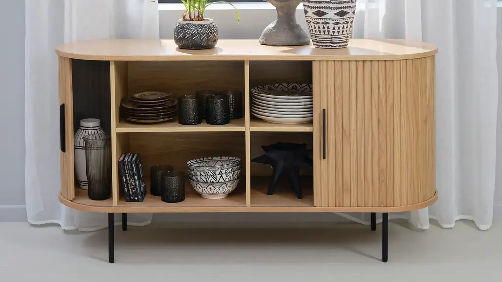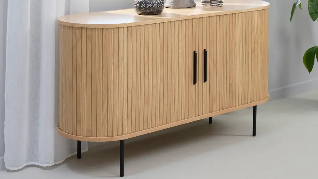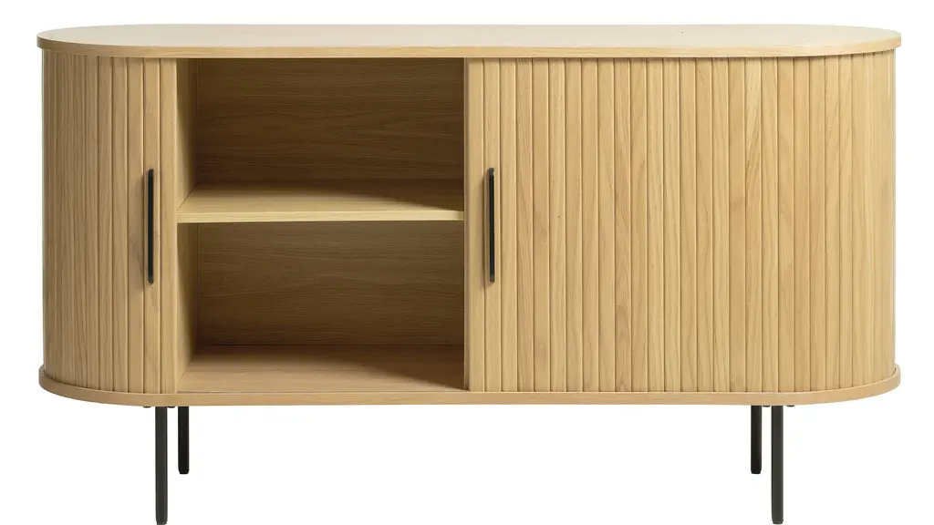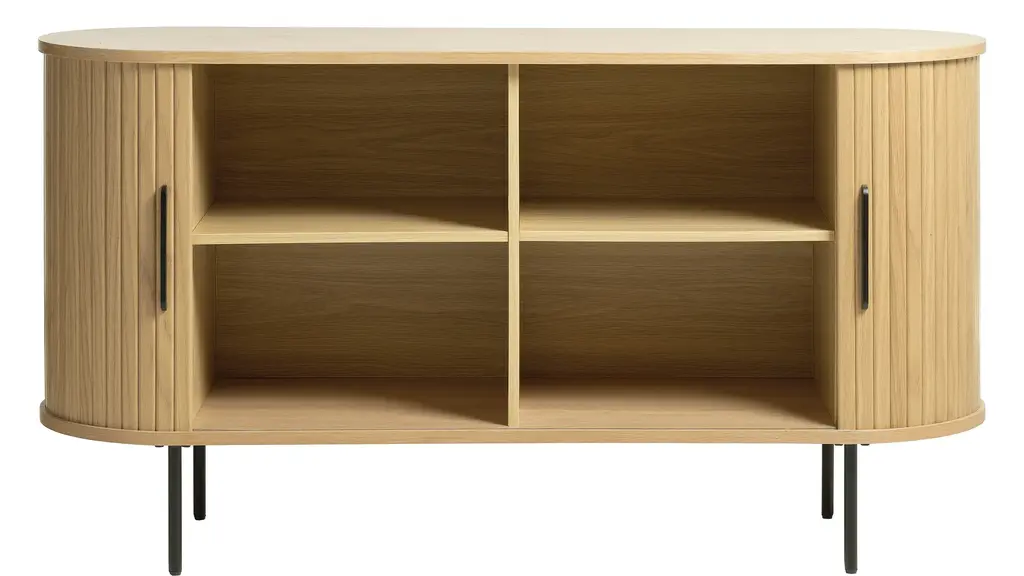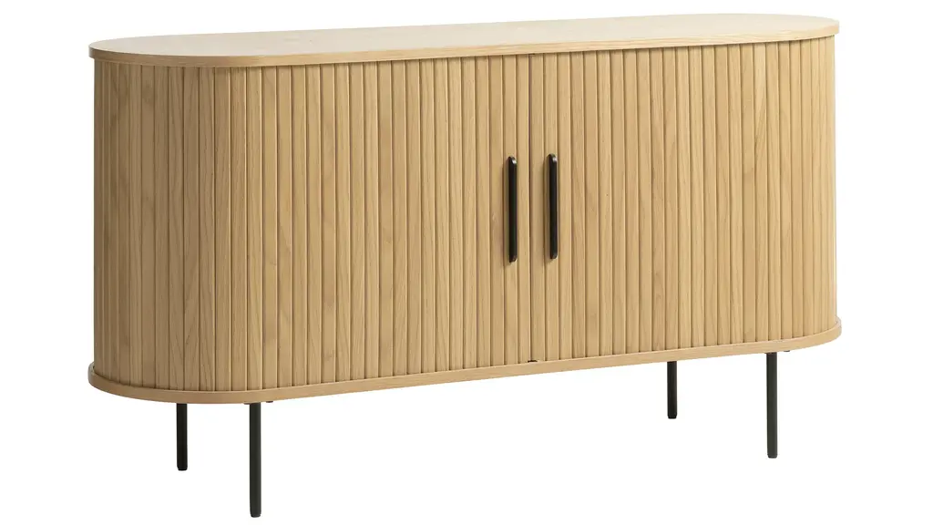 Combining the retro allure of mid-century design with industrial characteristics for a modern touch, the Hattie Sideboard w/Sliding Doors is sure to sit naturally within many existing interior styles. Made from engineered wood, this cabinet has a certain charm. Sliding slatted paneling on the main body of this piece further elevates its modern appeal, whilst lending this cabinet its unmistakable character.
