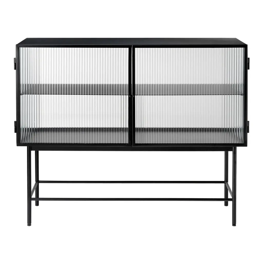 Perfect for concealing clutter in a busy hallway or as an elegant storage solution for a home office, bathroom or dining room, the sleek metal frame of our Haze Sideboard is coated with an elegant cashmere color that blends seamlessly into any interior style. Reeded glass walls and doors continue the sophisticated expression, blurring the cupboard's contents from prying eyes.