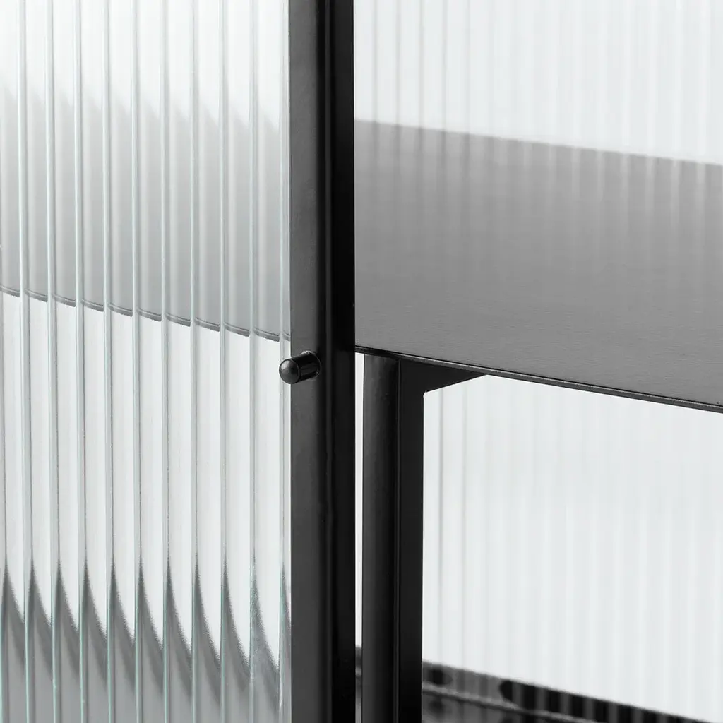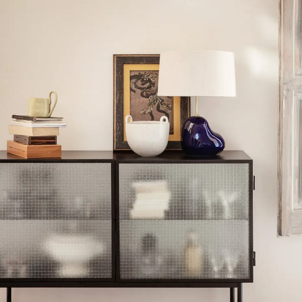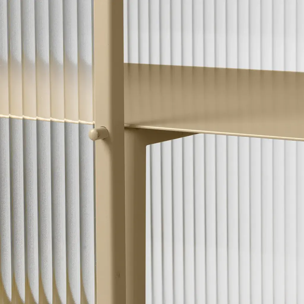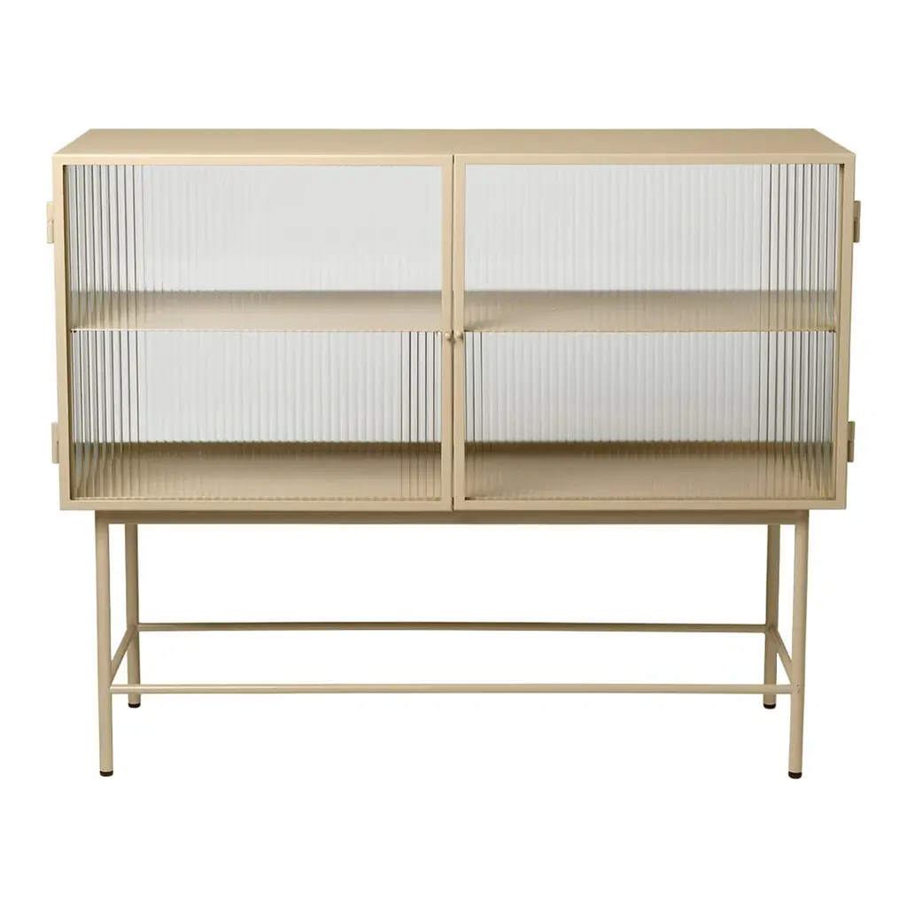 Perfect for concealing clutter in a busy hallway or as an elegant storage solution for a home office, bathroom or dining room, the sleek metal frame of our Haze Sideboard is coated with an elegant cashmere color that blends seamlessly into any interior style. Reeded glass walls and doors continue the sophisticated expression, blurring the cupboard’s contents from prying eyes.
