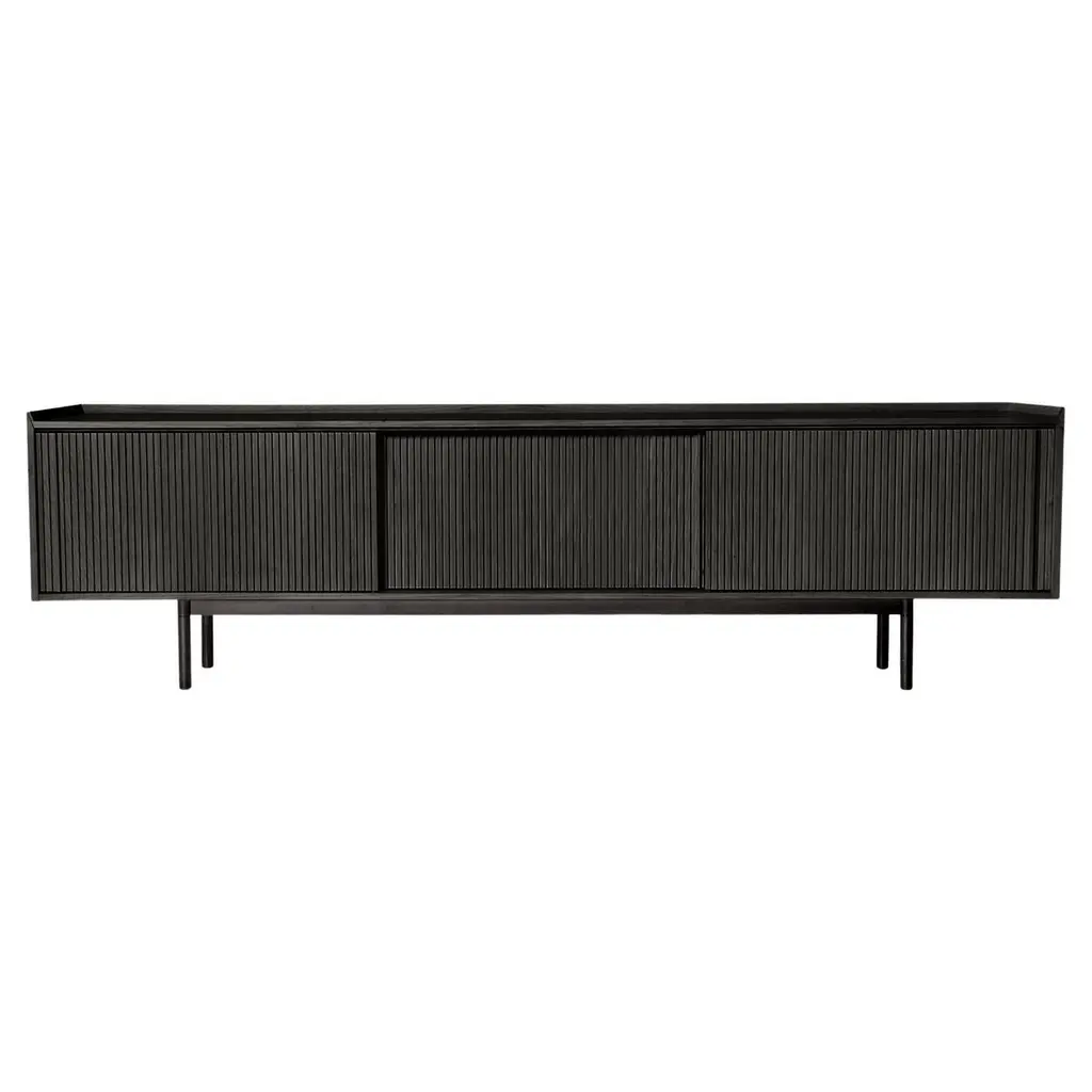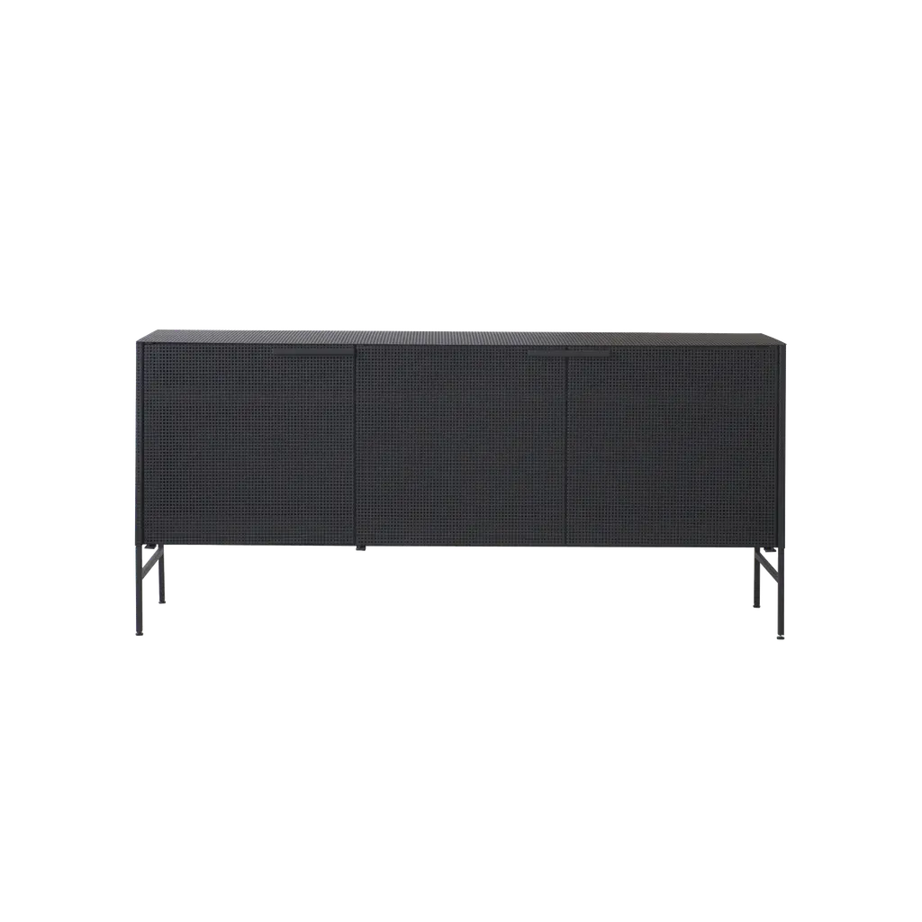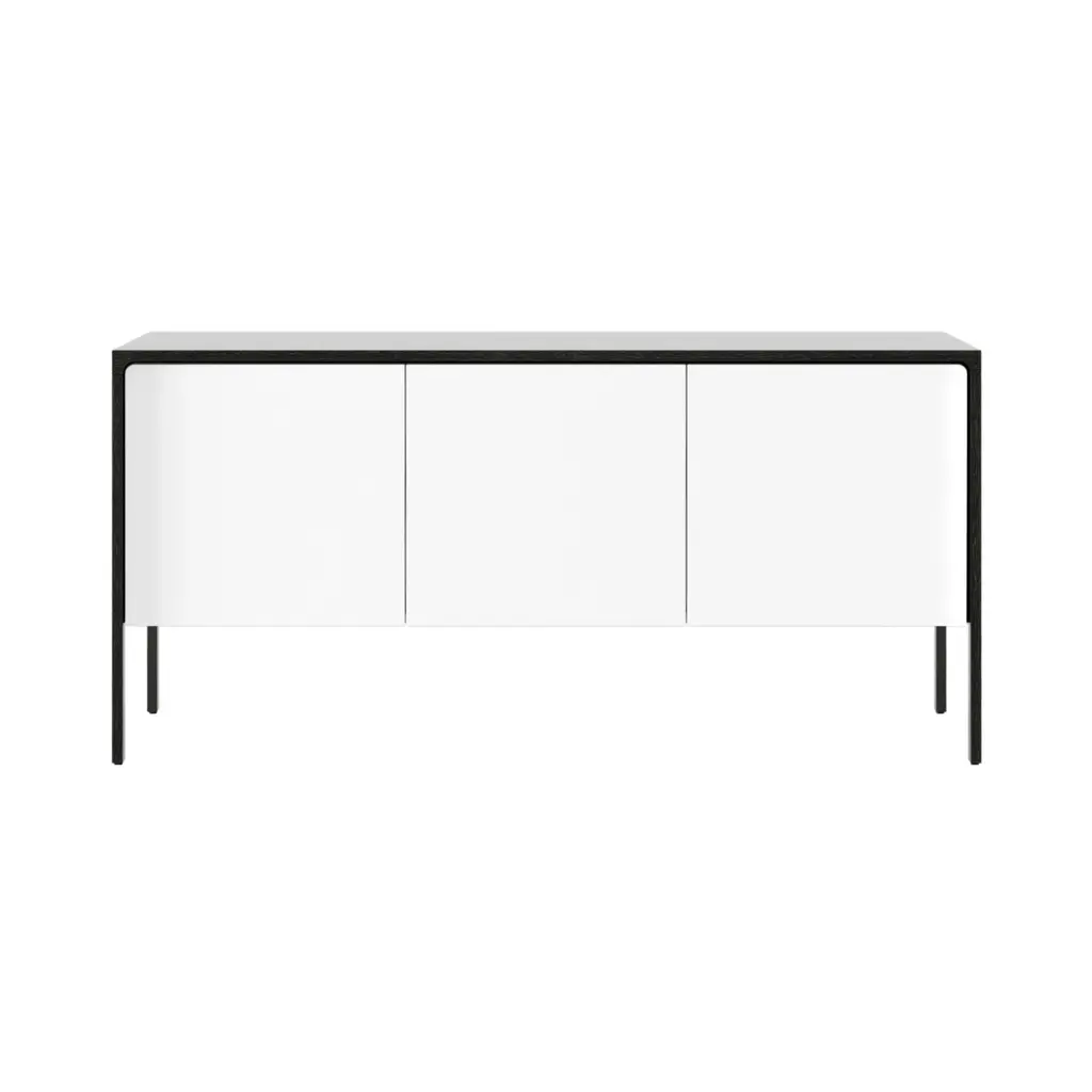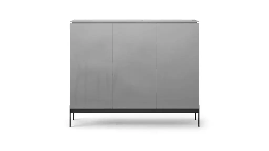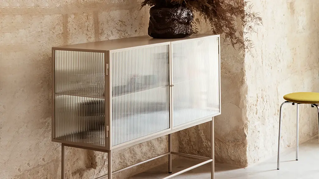 Opposites attract with the Haze series, crafted from sleek, powder-coated metal, and corrugated glass. Perfect for concealing clutter in a busy hallway or as an elegant storage solution for a home office, bathroom, or dining room, the sleek metal frame of our Haze Sideboard is coated with an elegant cashmere color that blends seamlessly into any interior style. Reeded glass walls and doors continue the sophisticated expression, blurring the cupboard’s contents from prying eyes. Designed and produced by the Copenhagen-based studio Ferm Living.