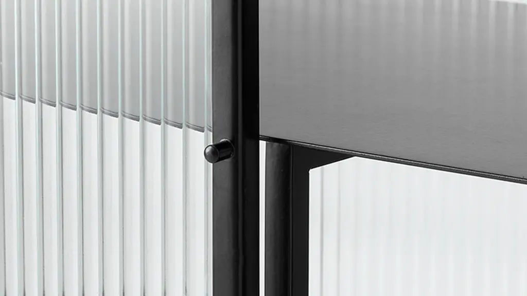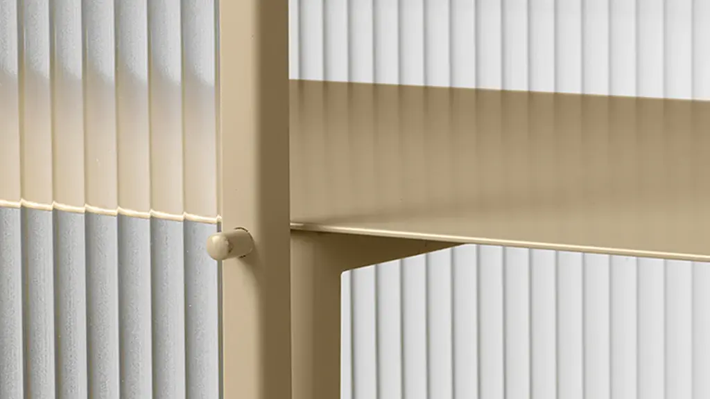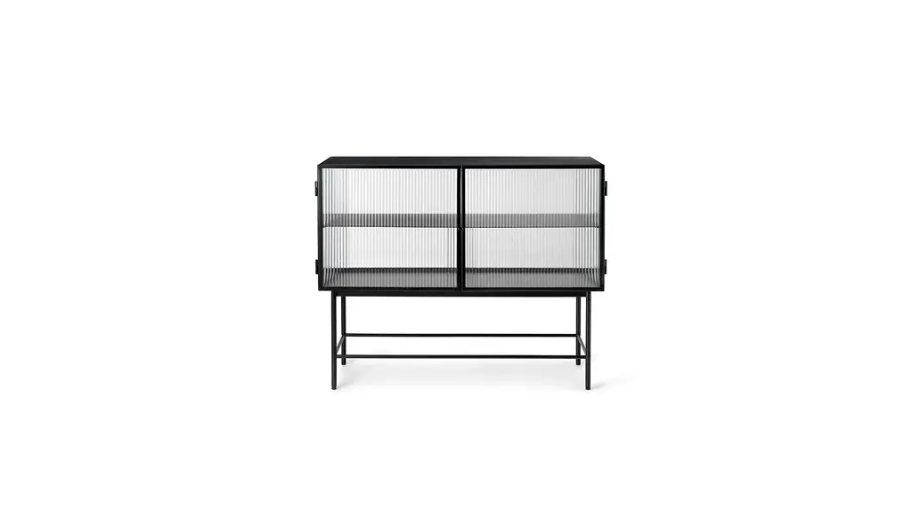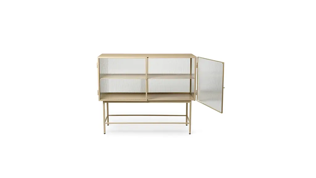 Opposites attract with the Haze series, crafted from sleek, powder-coated metal, and corrugated glass. Perfect for concealing clutter in a busy hallway or as an elegant storage solution for a home office, bathroom, or dining room, the sleek metal frame of our Haze Sideboard is coated with an elegant cashmere color that blends seamlessly into any interior style. Reeded glass walls and doors continue the sophisticated expression, blurring the cupboard’s contents from prying eyes. Designed and produced by the Copenhagen-based studio Ferm Living.