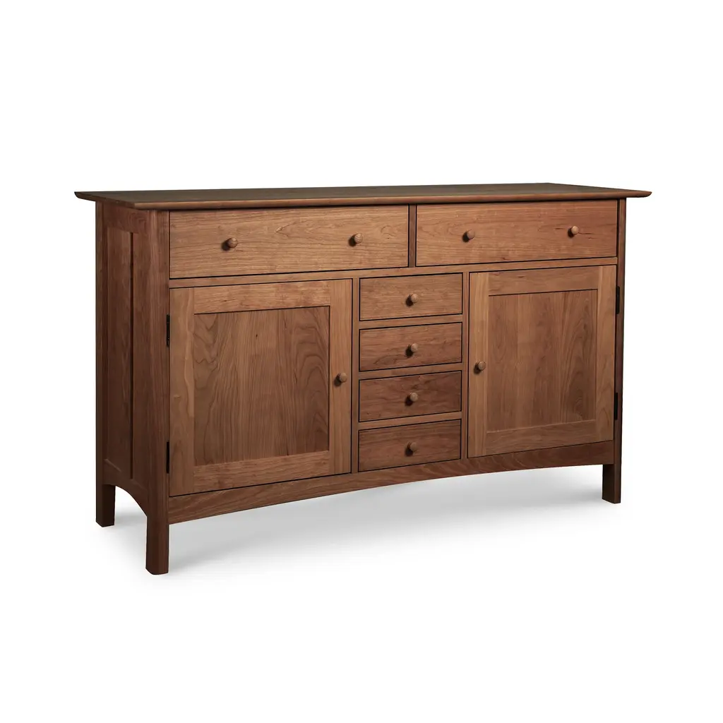 Our Heartwood Shaker Sideboard is handcrafted in Vermont using premium natural solid hardwoods. Featuring a six drawer/two door configuration, this designer sideboard provides an abundance of storage space for both dining room and kitchen. Beautifully rounded corners offer a soften appearance that flawlessly complements the natural characteristics of the oil finished wood. With its timeless styling and durable construction, this piece is the perfect addition for the modern home.Base price represents sideboard in natural cherryShown in natural cherryMatching furniture available in our Heartwood Shaker Furniture Collection