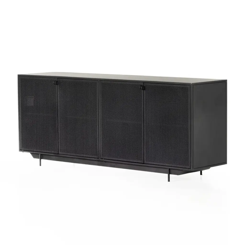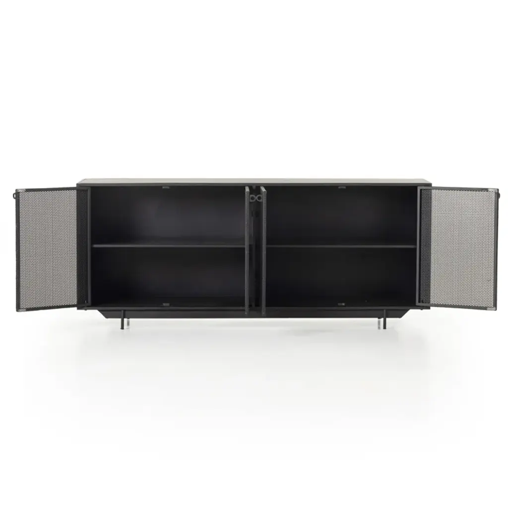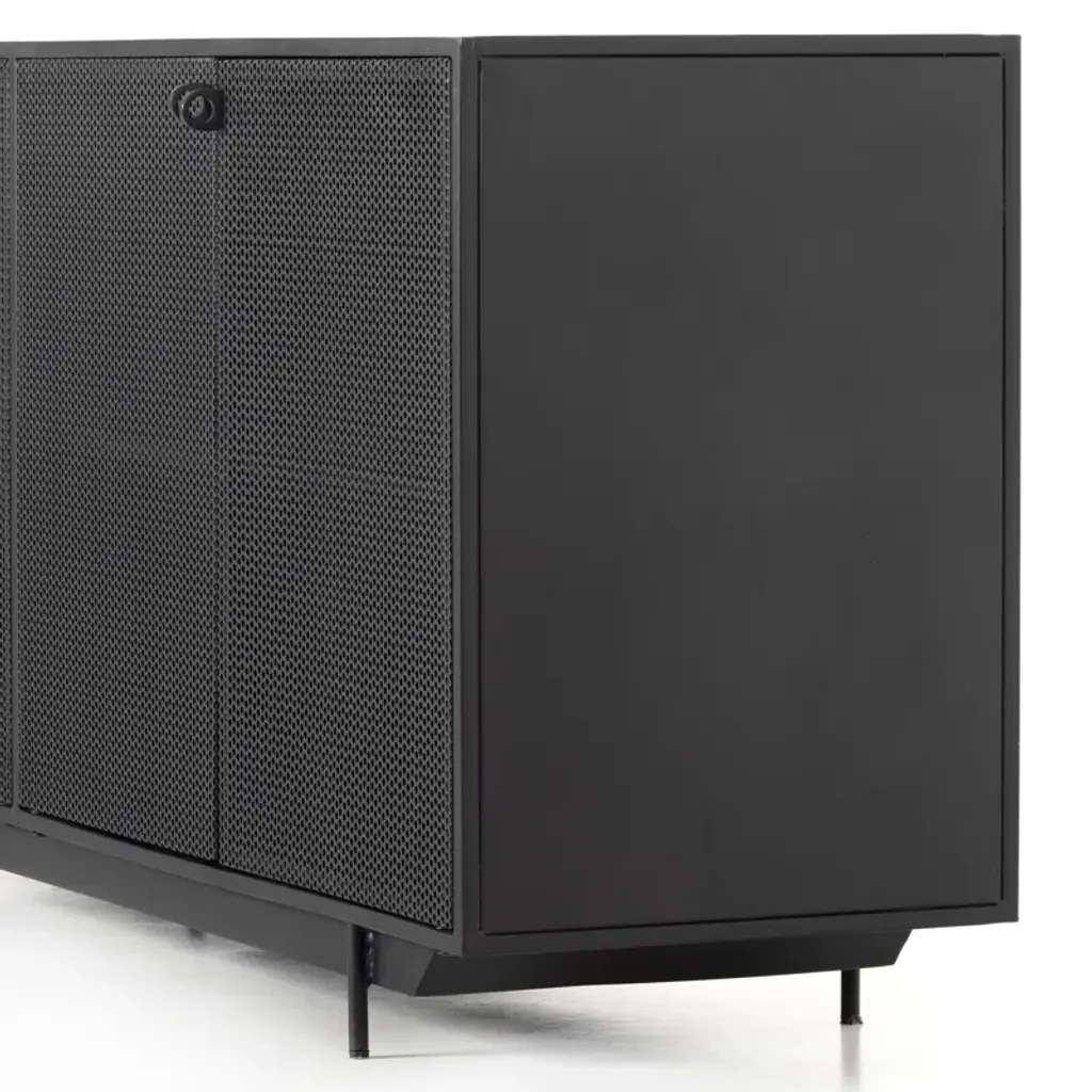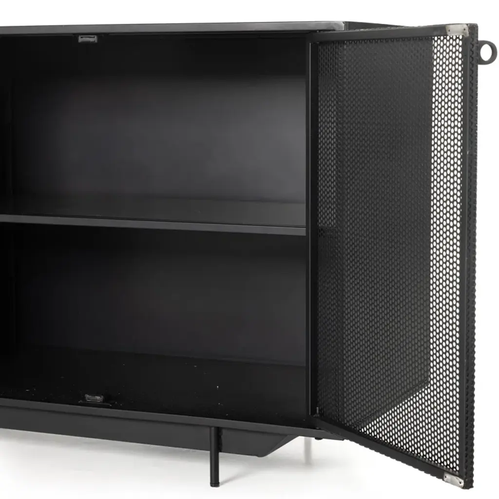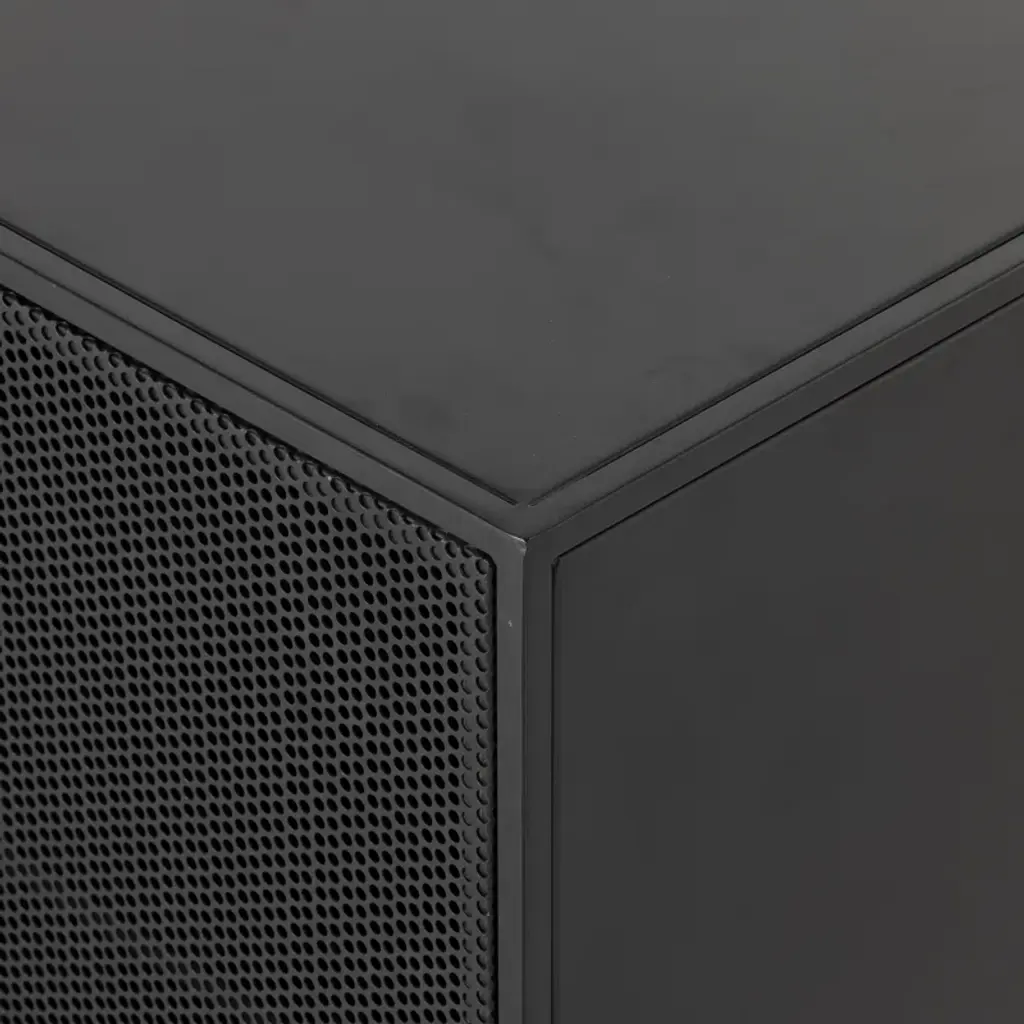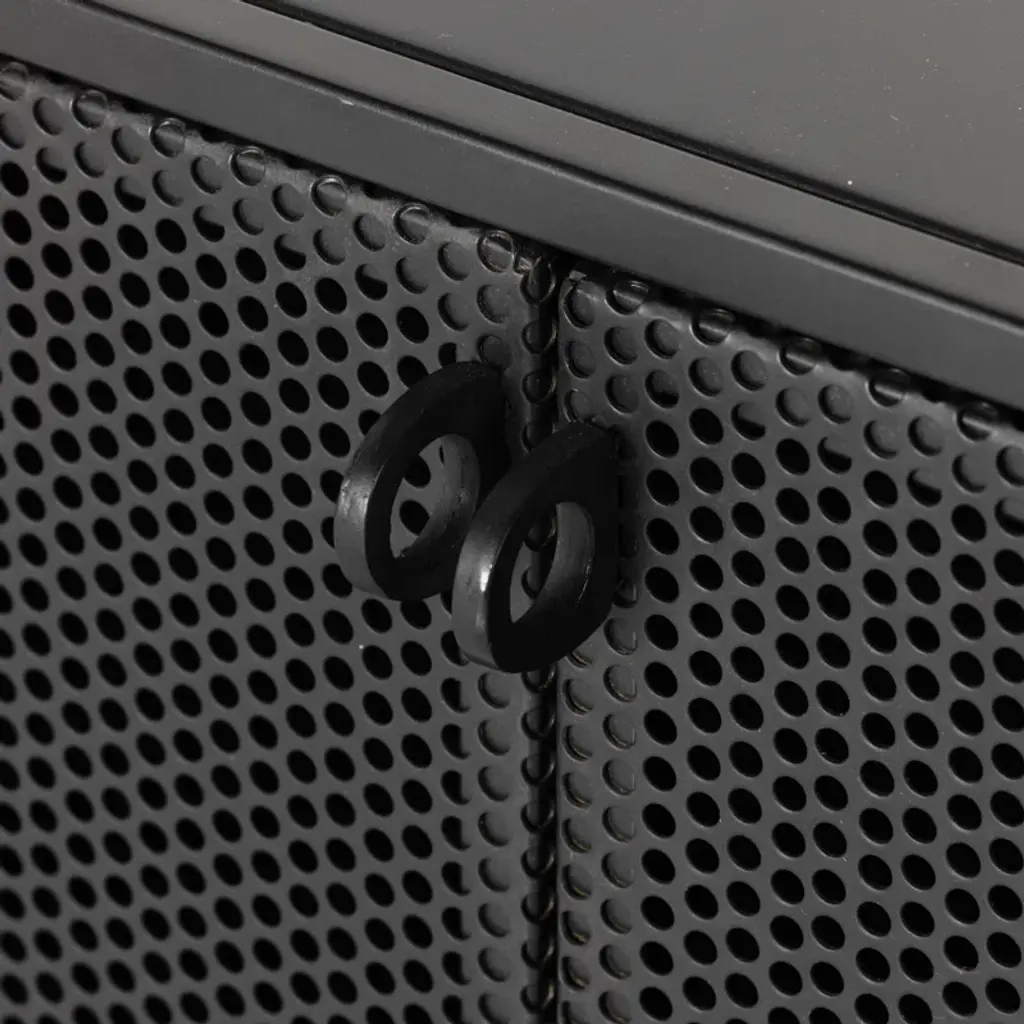 A texture-rich take on streamlined shaping. Mid-century form undergoes a modern refresh via cutting-edge materials and trend-forward finishes. Angular iron framing welcomes front-open cabinetry of perforated brass, as ring-style hardware add a unique finishing touch.