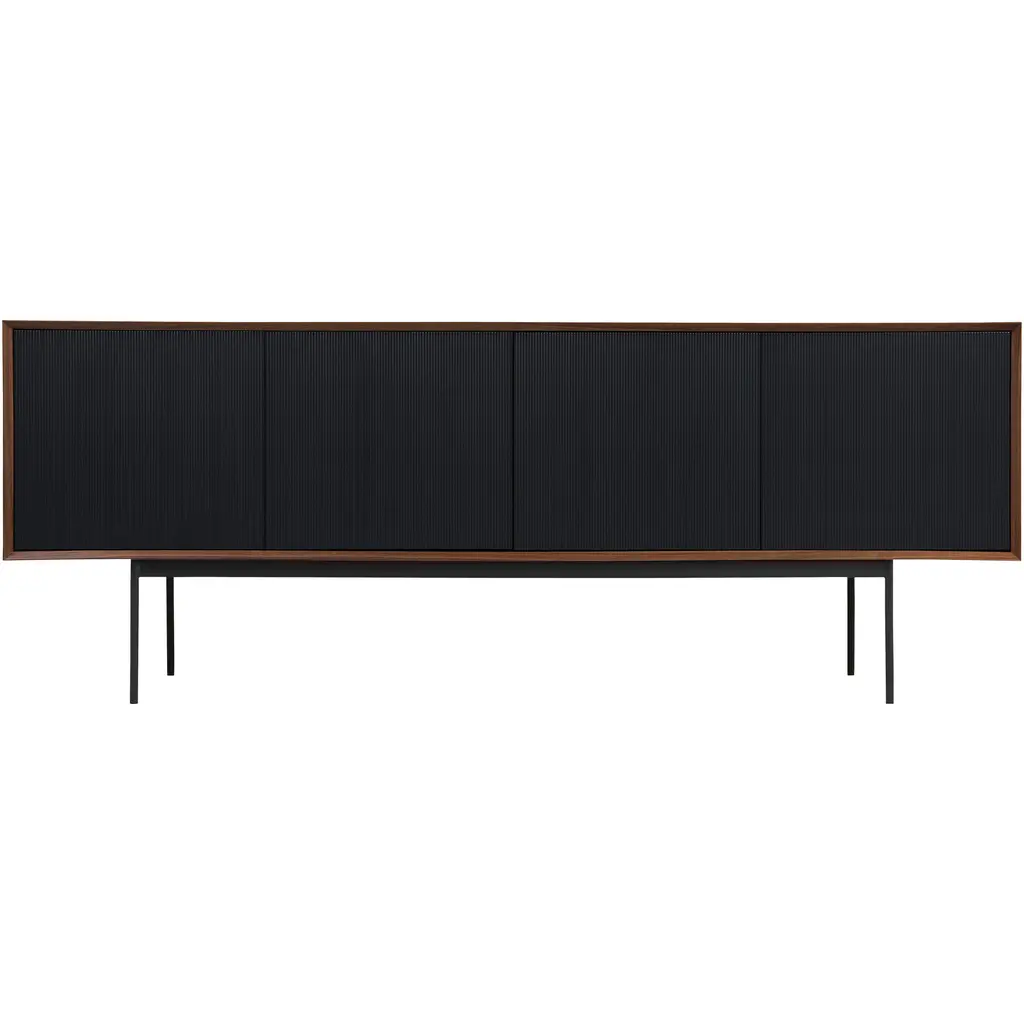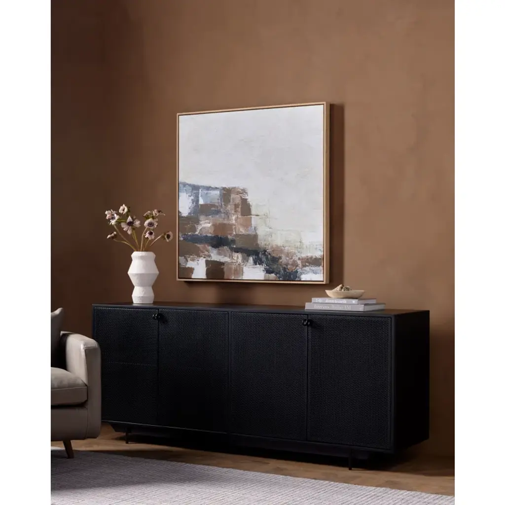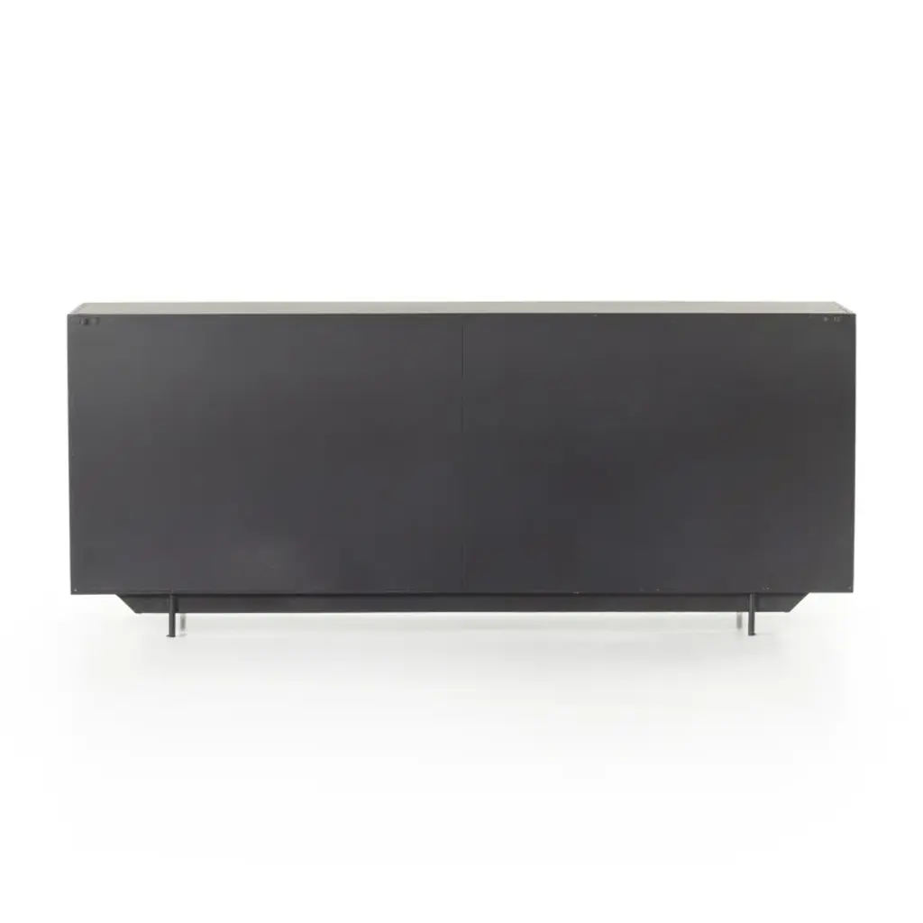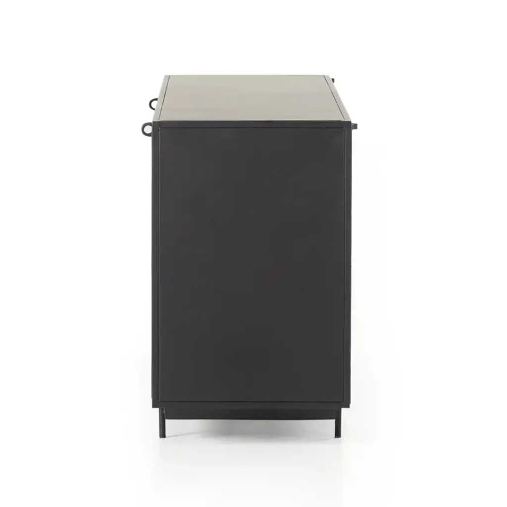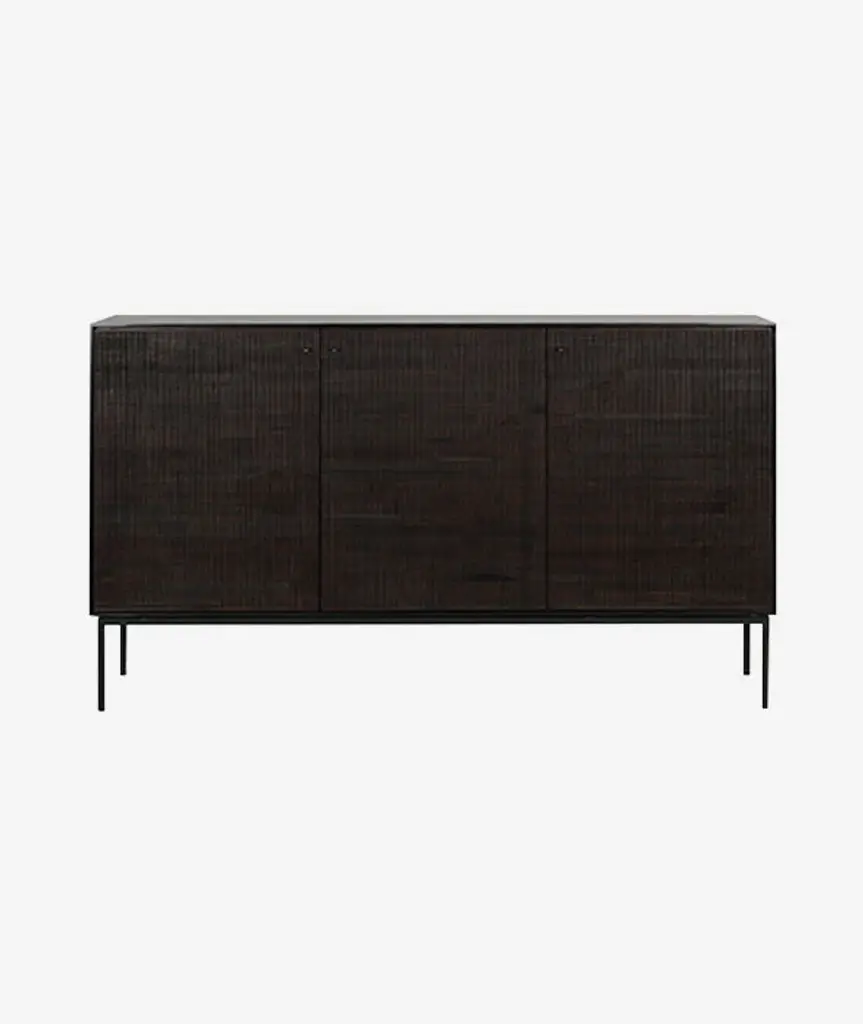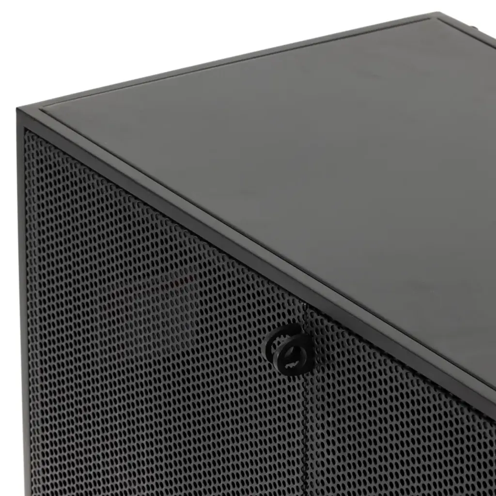 A texture-rich take on streamlined shaping. Mid-century form undergoes a modern refresh via cutting-edge materials and trend-forward finishes. Angular iron framing welcomes front-open cabinetry of perforated brass, as ring-style hardware add a unique finishing touch.