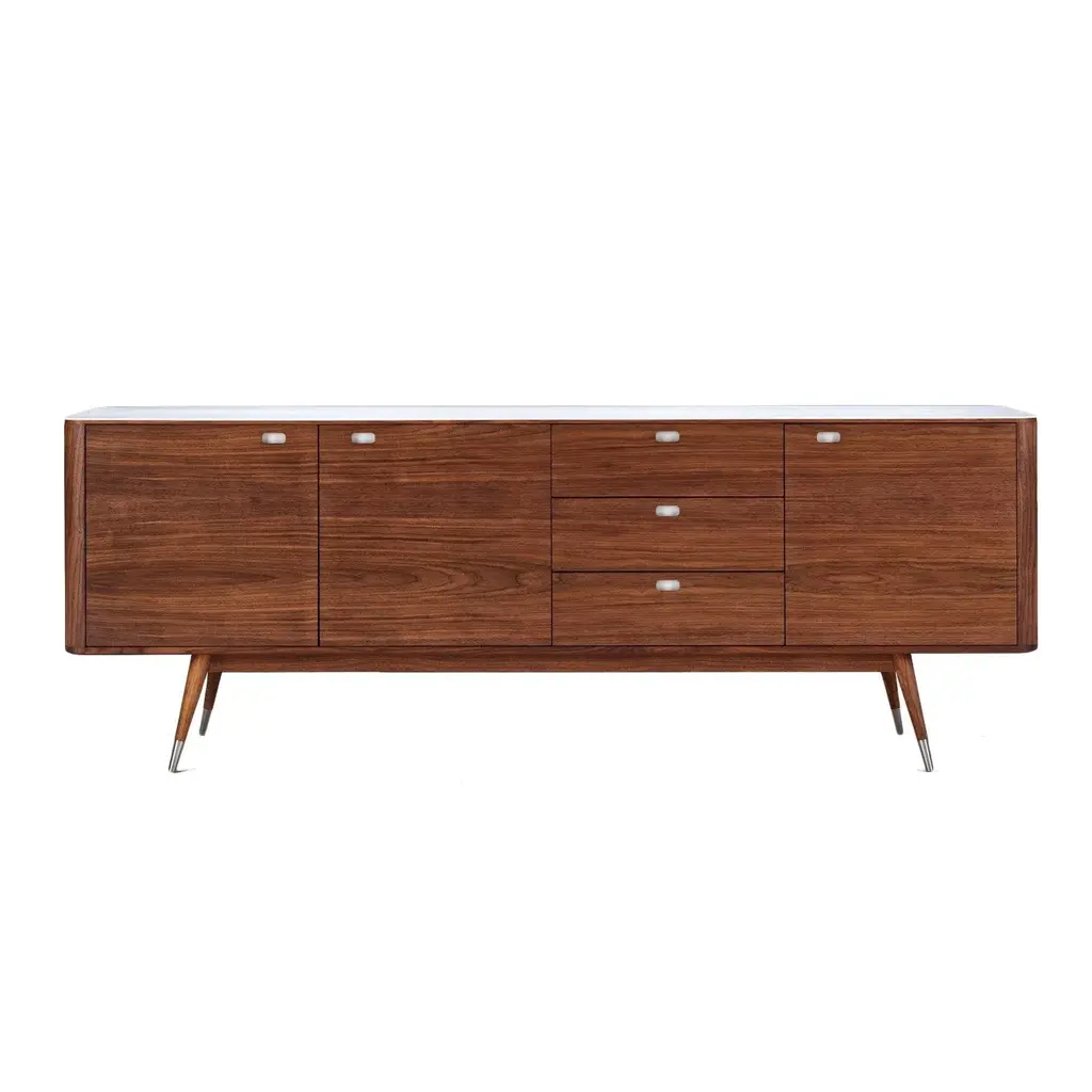 The Hendrick Sideboard is the solution for all of your entertaining needs. Two large tambour doors slide open to reveal three drawers and ample space for bar essentials, media accouterments, games and more. The space-saving tambour doors, made of narrow slats, slide open for easy access to your stored items, while adjustable shelving allows for you to customize your storage space to meet your needs. Solid brass pulls and leg caps contrast beautifully with the American poplar wood.