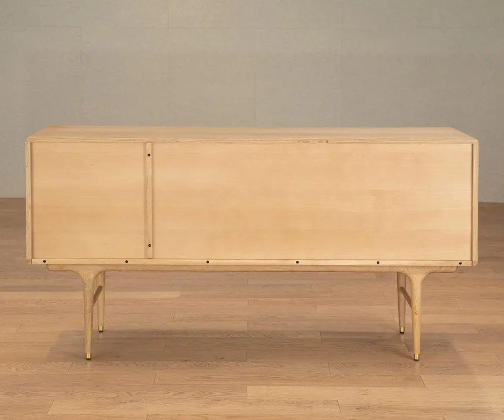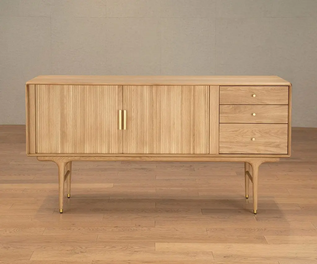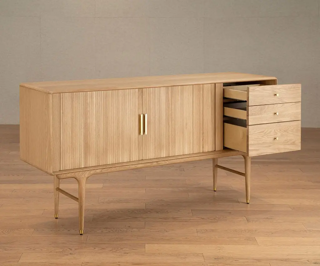 The Hendrick Sideboard in durable, solid white oak is designed with a classic mid-century aesthetic that works seamlessly with nearly any decor style. Two space-saving tambour doors slide open effortlessly to reveal three drawers and ample space for bar essentials, media accouterments, games and more. Plus, adjustable shelving can be arranged to suit your specific needs, and brass pulls and leg caps complete the look. Mix and match it with other pieces in the Hendrick Collection to create a stylish, complementary set.