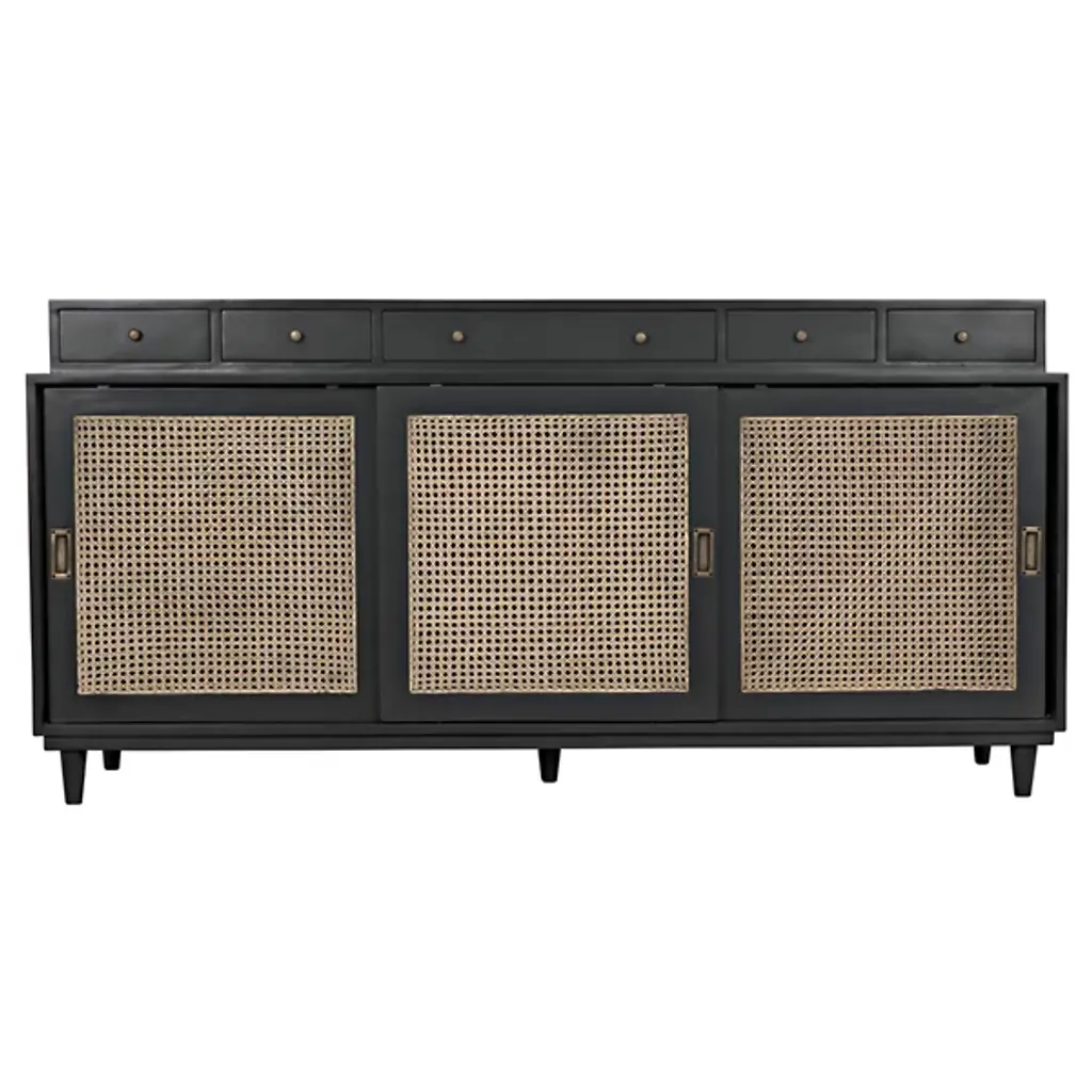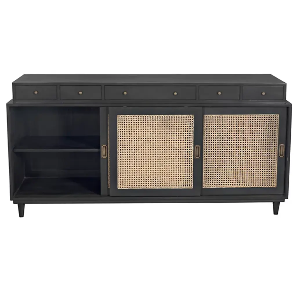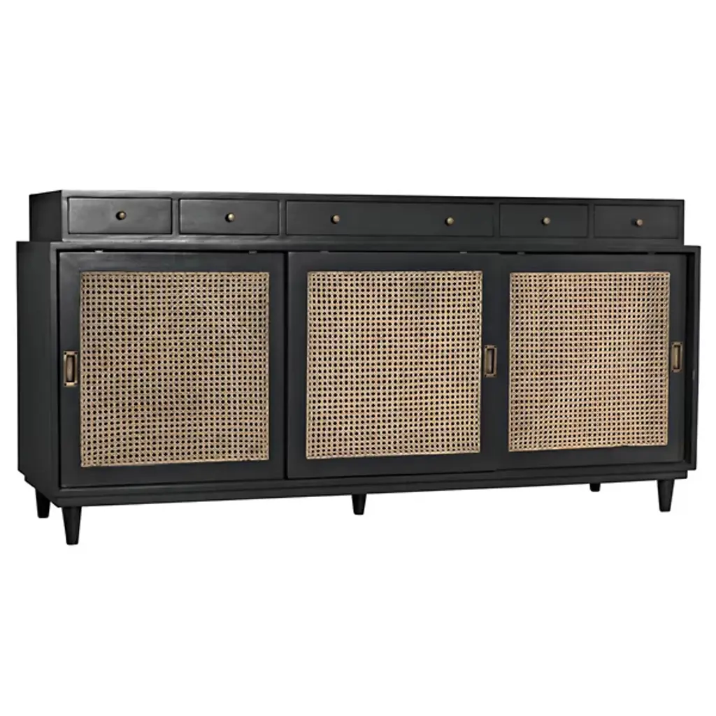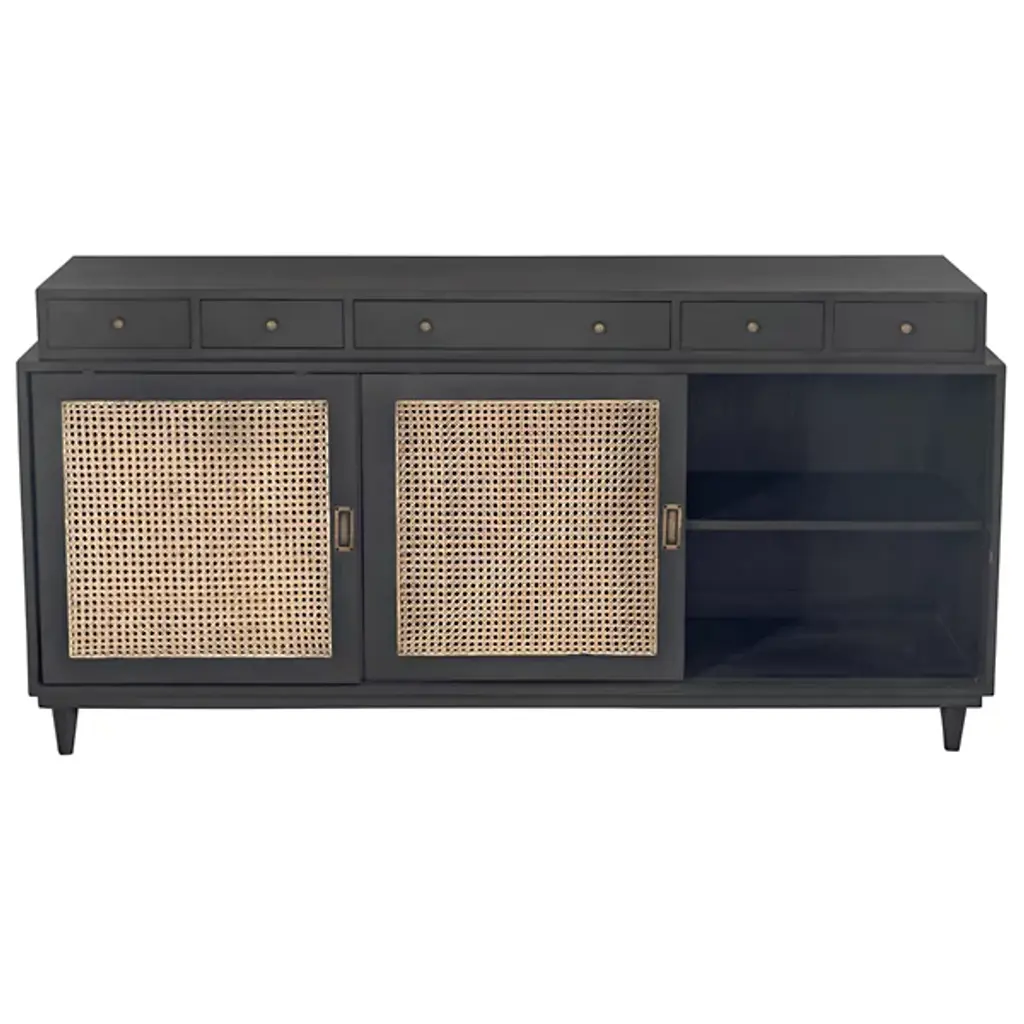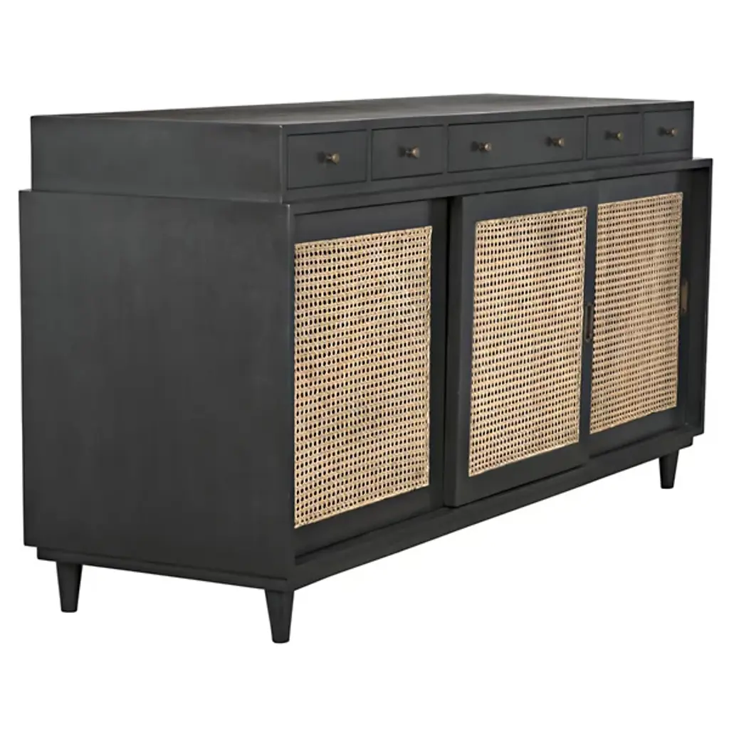 The Hermosa Sideboard from Noir combines mahogany construction with woven cane door panels that add textural contrast to the rich wood frame. Five stepped drawers cascade down one side, while three caned cupboards provide concealed storage below. Tapered legs lift the piece off the ground, creating an airy feel despite its generous proportions. Brass hardware punctuates the dark mahogany with warm metallic accents throughout. The mix of open and closed storage makes this sideboard particularly useful in entryways or dining rooms where you need both display space and hidden organization for linens or tableware.