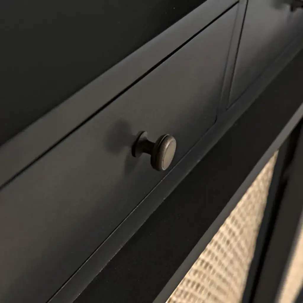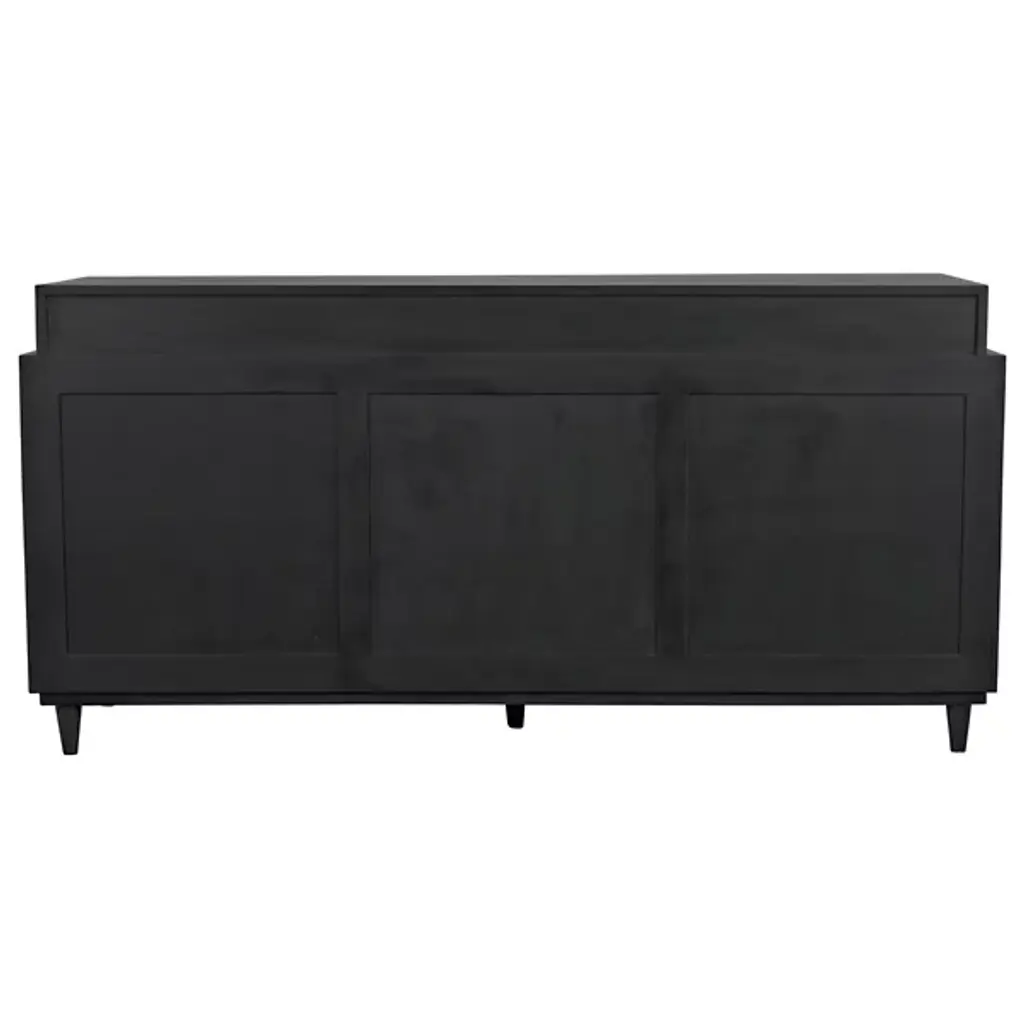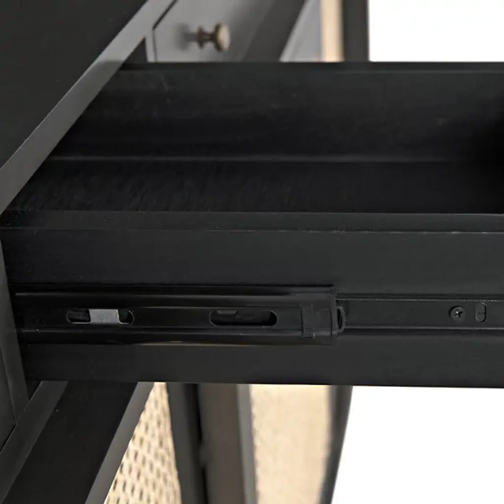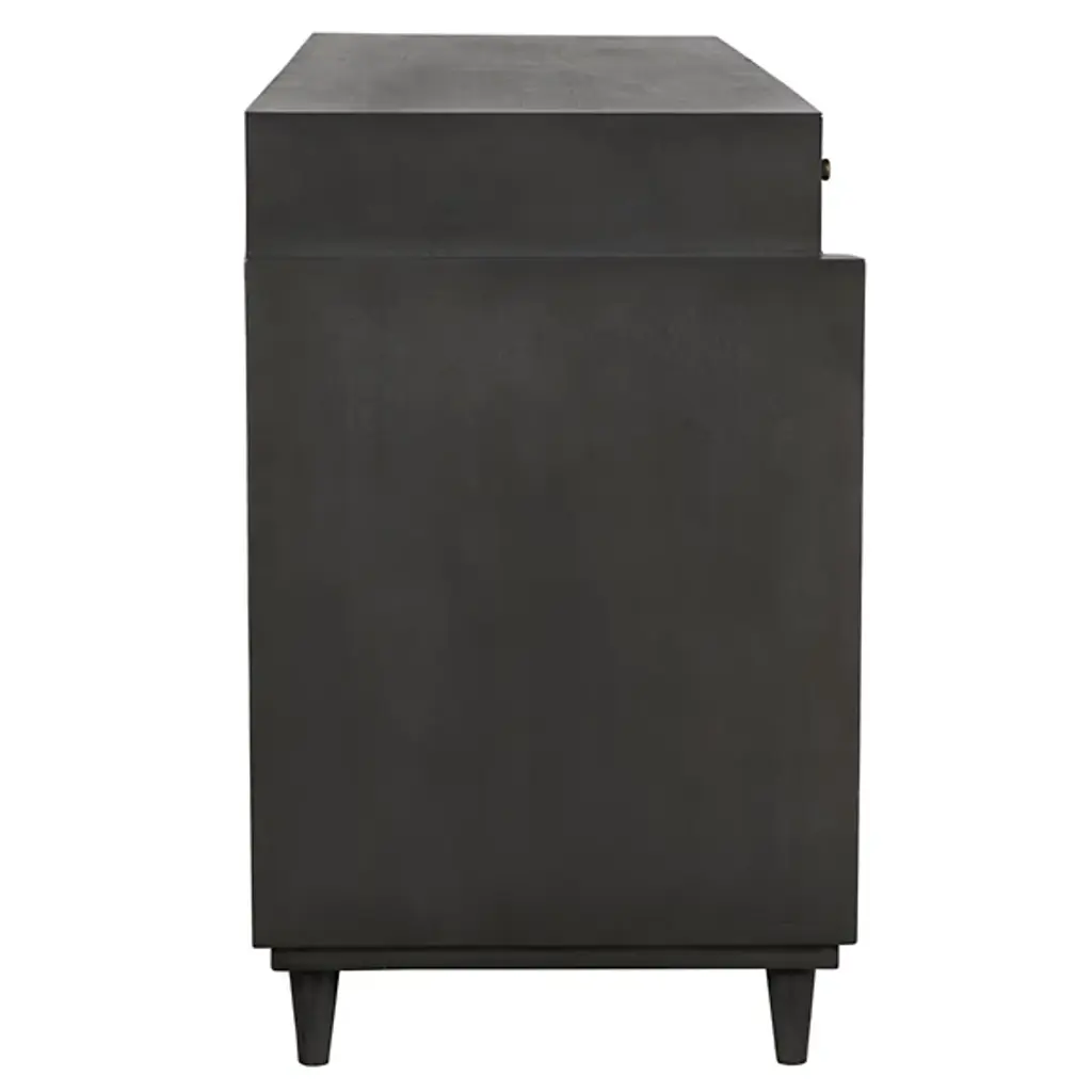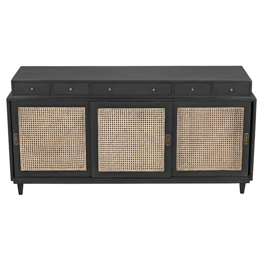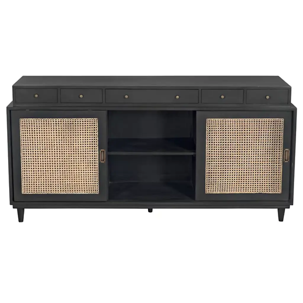 The Hermosa Sideboard from Noir combines mahogany construction with woven cane door panels that add textural contrast to the rich wood frame. Five stepped drawers cascade down one side, while three caned cupboards provide concealed storage below. Tapered legs lift the piece off the ground, creating an airy feel despite its generous proportions. Brass hardware punctuates the dark mahogany with warm metallic accents throughout. The mix of open and closed storage makes this sideboard particularly useful in entryways or dining rooms where you need both display space and hidden organization for linens or tableware.