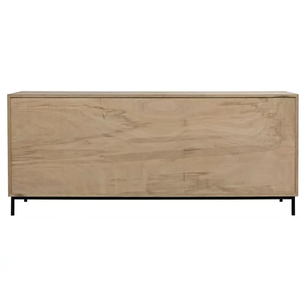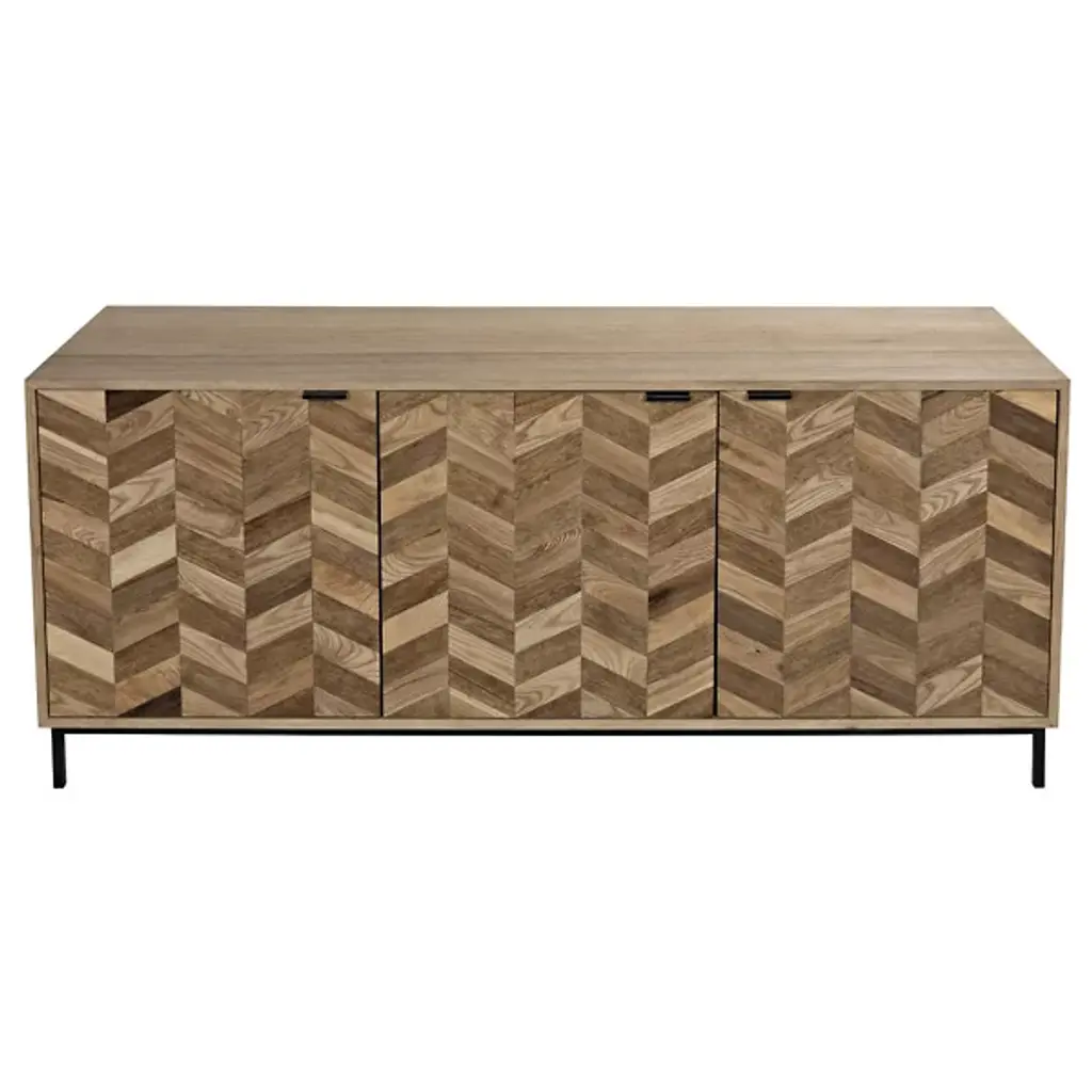 The Herringbone Sideboard from Noir features alternating walnut strips arranged in chevron patterns across three cabinet doors. Light and dark wood tones create movement and depth as the grain direction shifts with each piece of the puzzle-like surface. A slim metal base elevates the wooden cabinet, providing contrast between industrial and organic materials. The herringbone pattern requires precise craftsmanship to flow from one door to the next. Three interior compartments offer practical storage, while the patterned exterior serves as functional art.