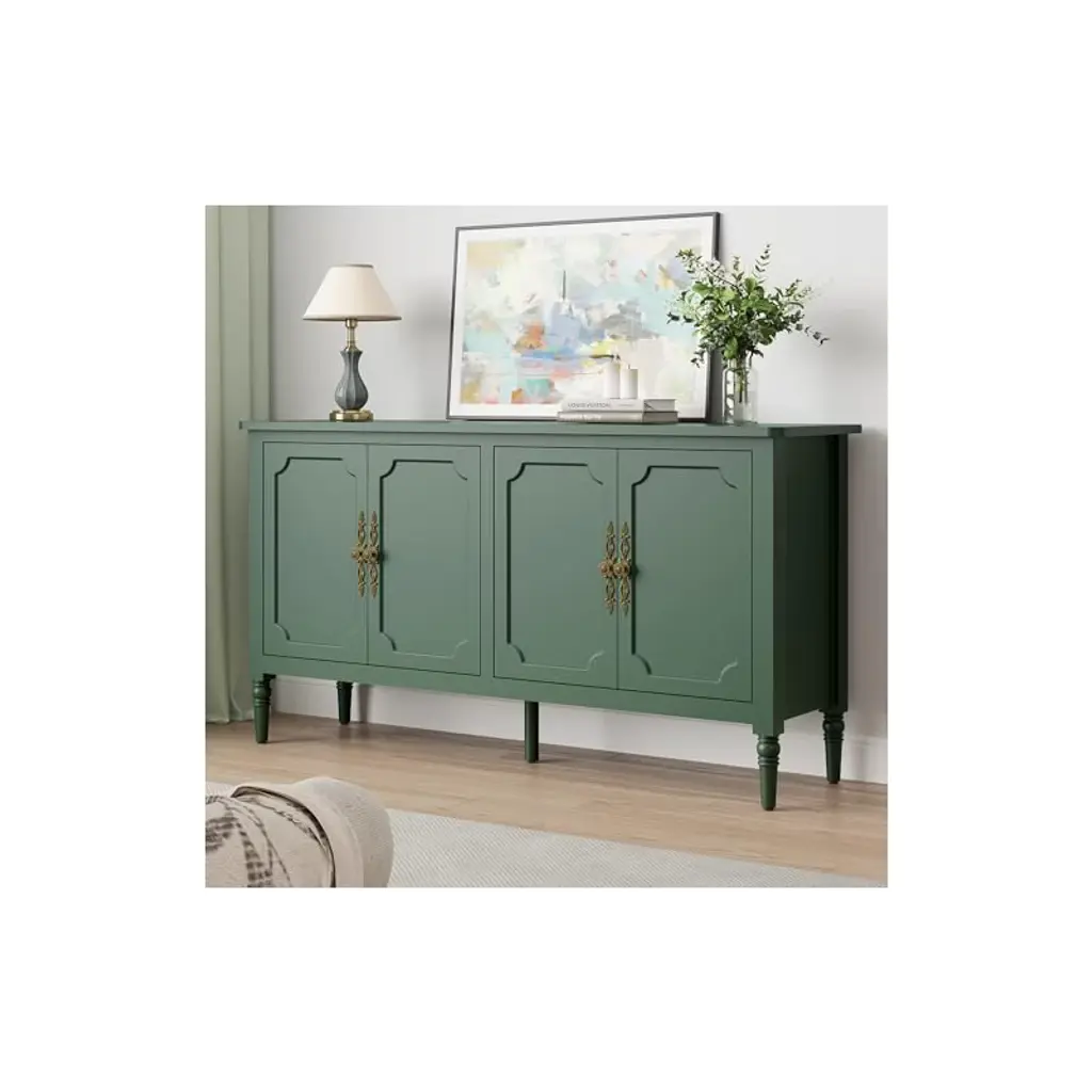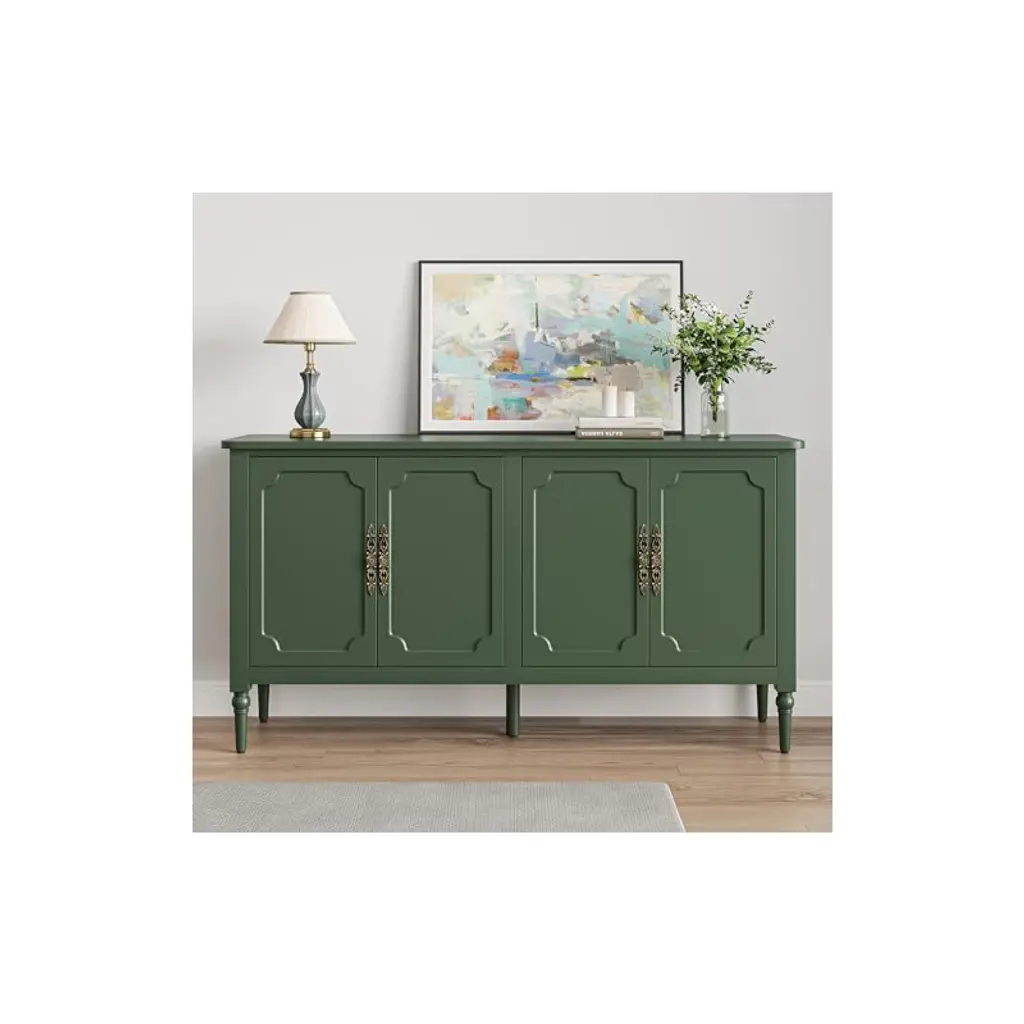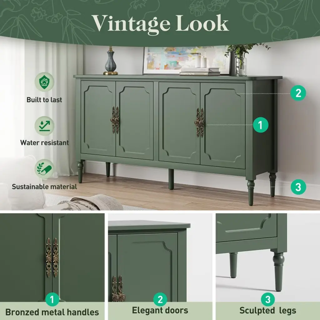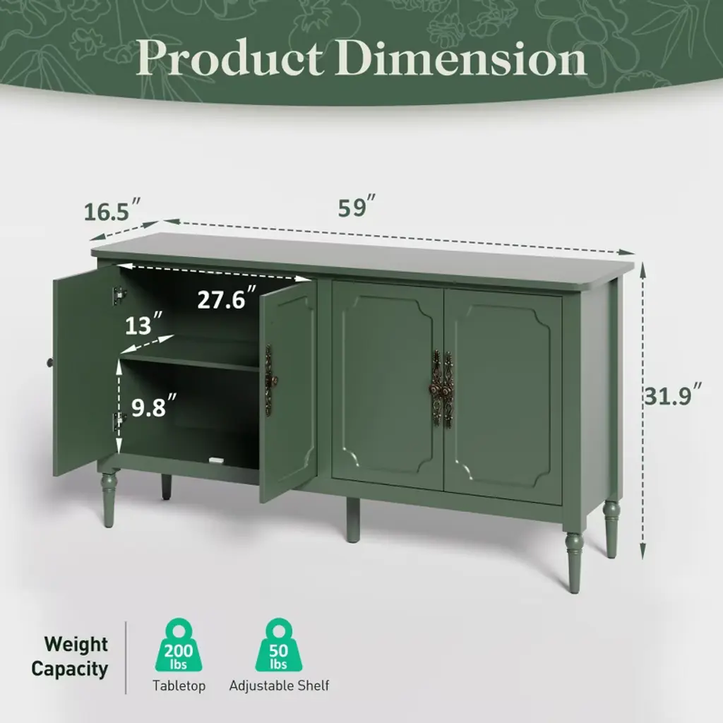 A vintage and elegant storage cabinet, paired with various furnishings, will bring a fresh new decorative style to your home. A touch of green, inspired by nature, breaks the monotony of black and white colors, presenting a medieval style before you. Practicality is another major advantage, with a wider tabletop that can accommodate various decorations such as flowers, photos, paintings, as well as kitchen items like cups, coffee makers, and microwaves. The four compartments provide powerful storage functionality, suitable for long-term use as a storage cabinet, dining cabinet, tv stand. The raised cabinet legs featureanti-slip design, serving to prevent moisture and facilitate daily cleaning. The coffee bar cabinet comes with detailed instructions and installation tools, so you can easily assemble a beautiful storage cabinet by following the instructions. Specification: Product Name:Storage Cabinet with 4 Doors Product Color: Black Dimension: 58" x 16" x 31" Material: P2-grade MDF Board Top Plate Load Capacity: 200 lbs Shelf Load Capacity: 50 lbs