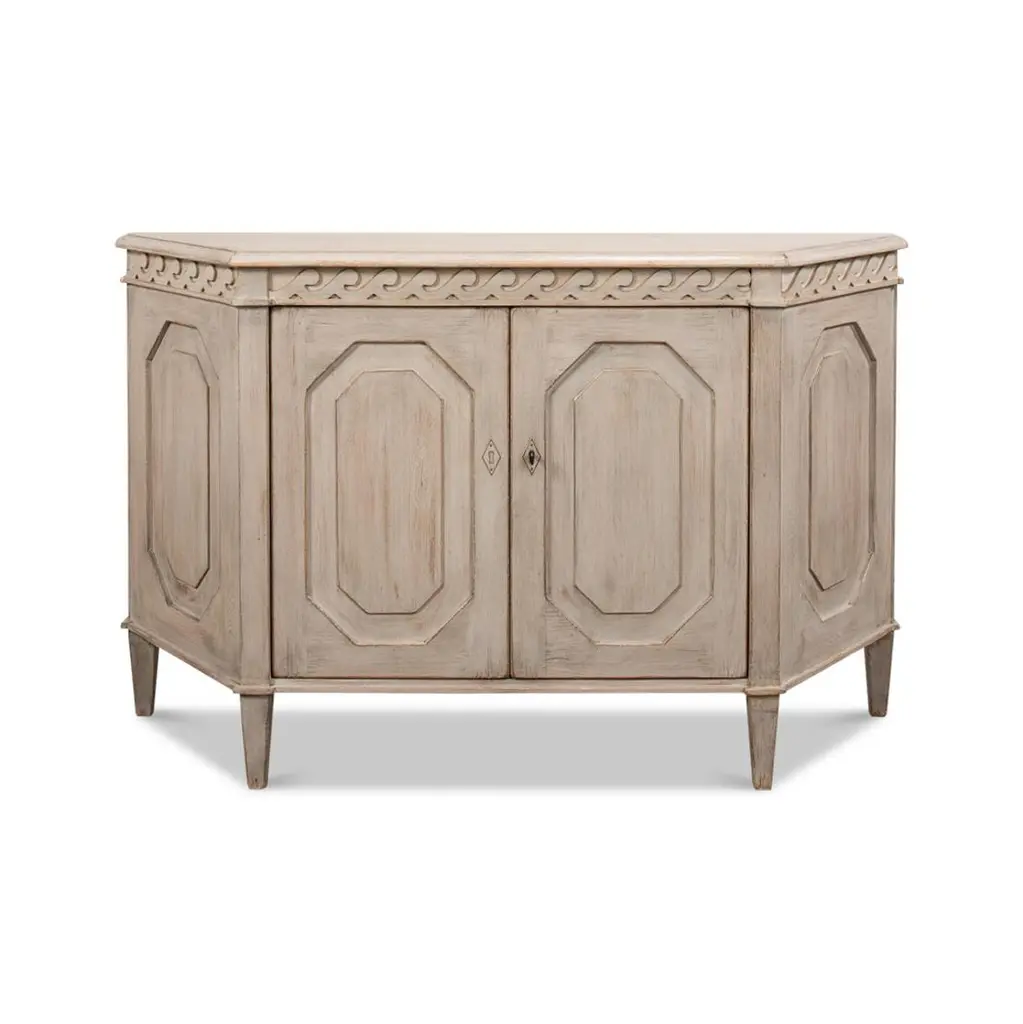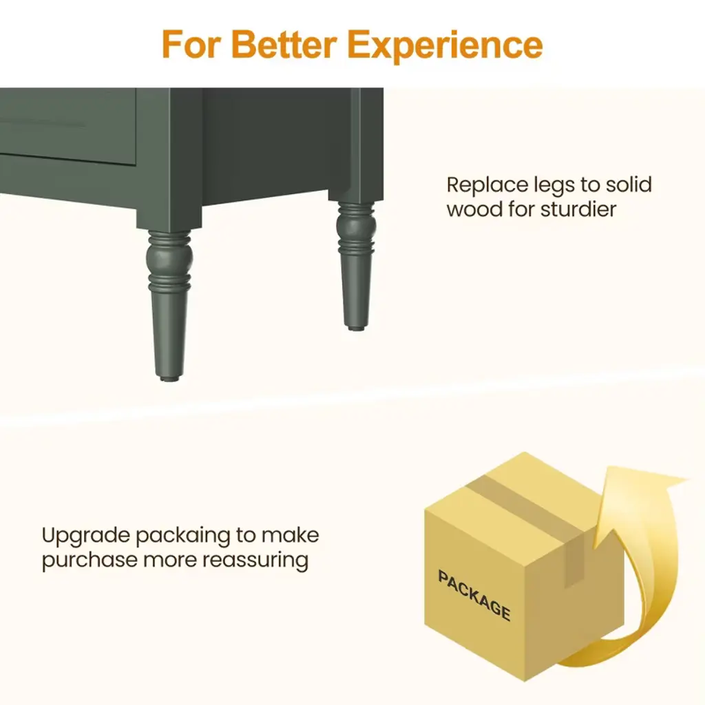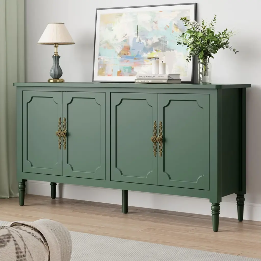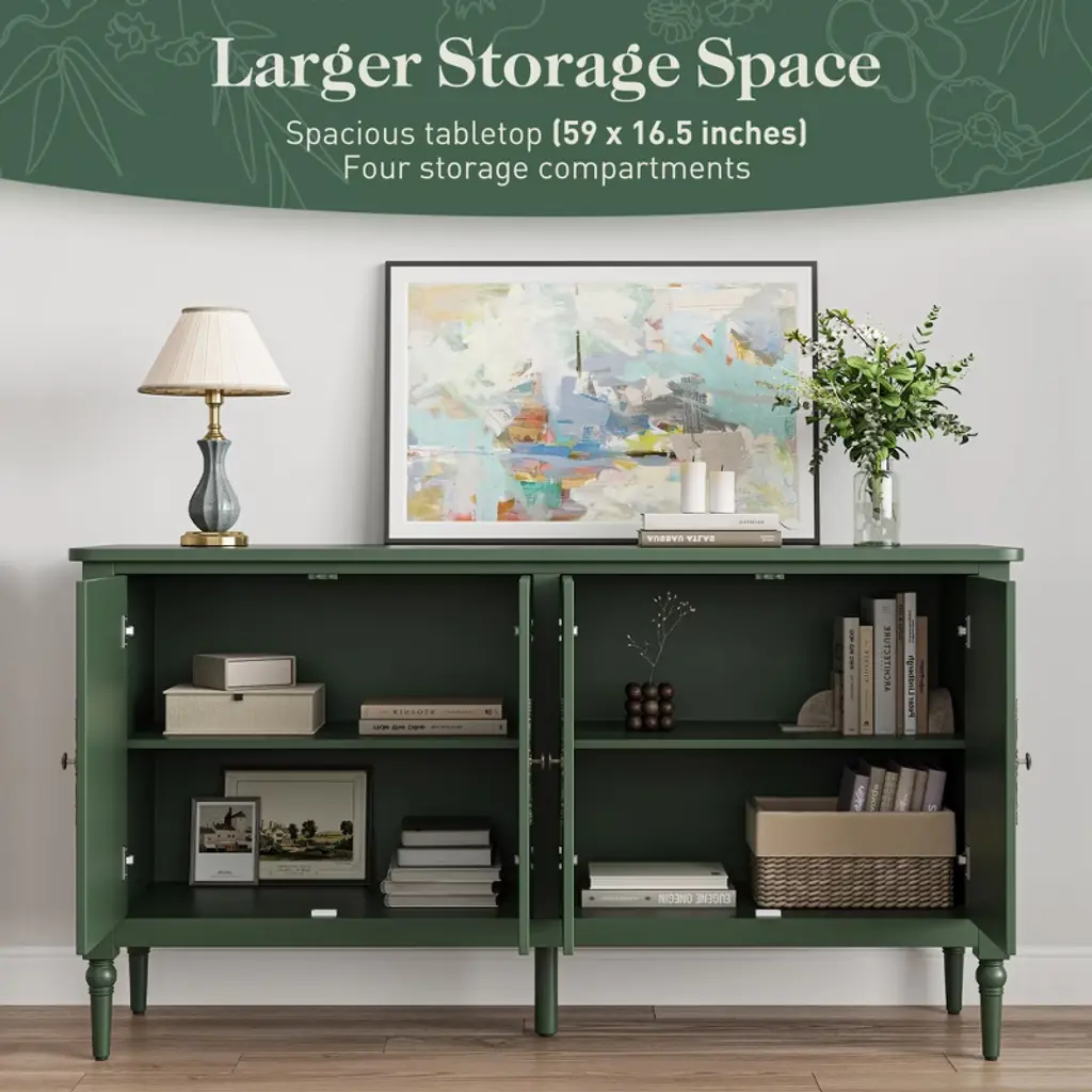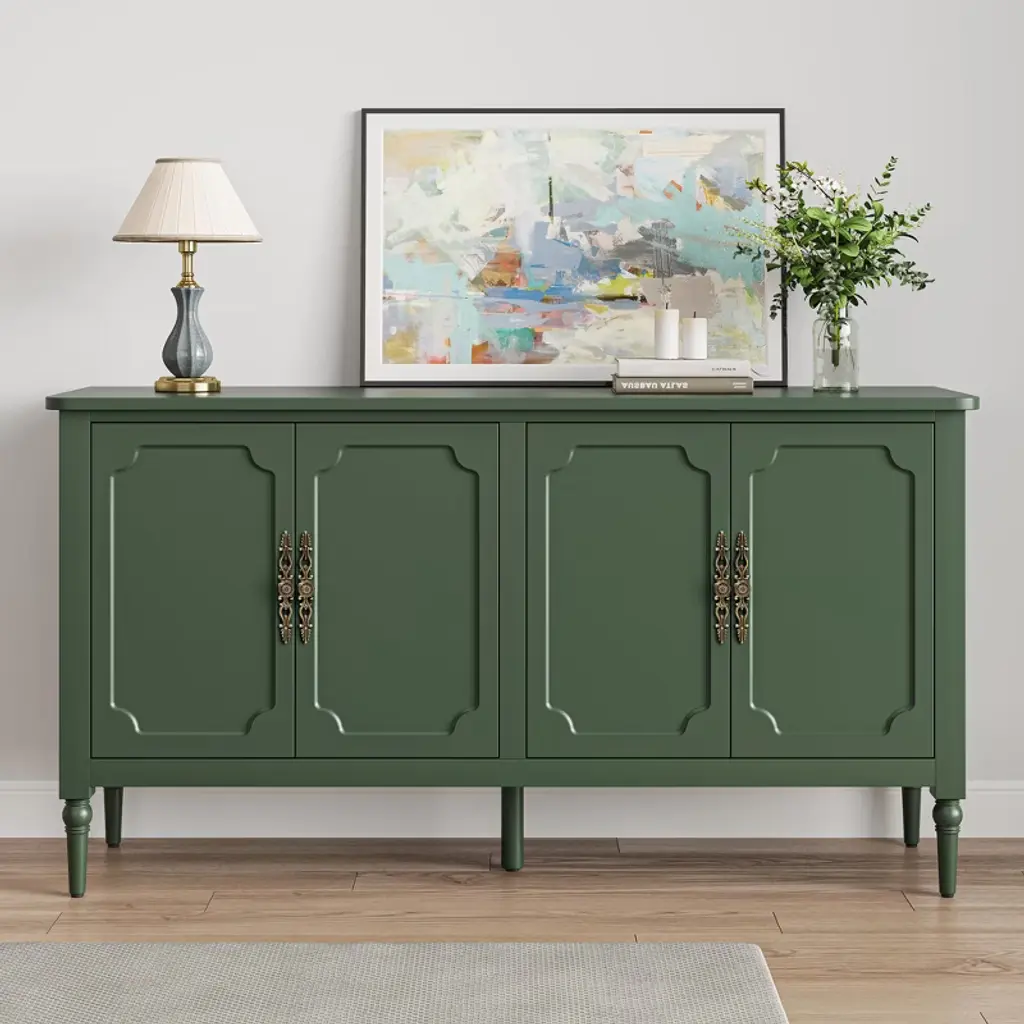 A vintage and elegant storage cabinet, paired with various furnishings, will bring a fresh new decorative style to your home. A touch of green, inspired by nature, breaks the monotony of black and white colors, presenting a medieval style before you. Practicality is another major advantage, with a wider tabletop that can accommodate various decorations such as flowers, photos, paintings, as well as kitchen items like cups, coffee makers, and microwaves. The four compartments provide powerful storage functionality, suitable for long-term use as a storage cabinet, dining cabinet, tv stand. The raised cabinet legs featureanti-slip design, serving to prevent moisture and facilitate daily cleaning. The coffee bar cabinet comes with detailed instructions and installation tools, so you can easily assemble a beautiful storage cabinet by following the instructions. Specification: Product Name:Storage Cabinet with 4 Doors Product Color: Black Dimension: 58" x 16" x 31" Material: P2-grade MDF Board Top Plate Load Capacity: 200 lbs Shelf Load Capacity: 50 lbs