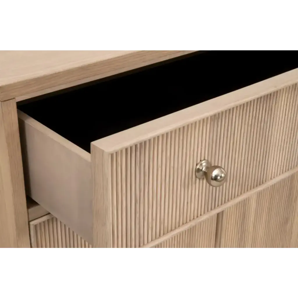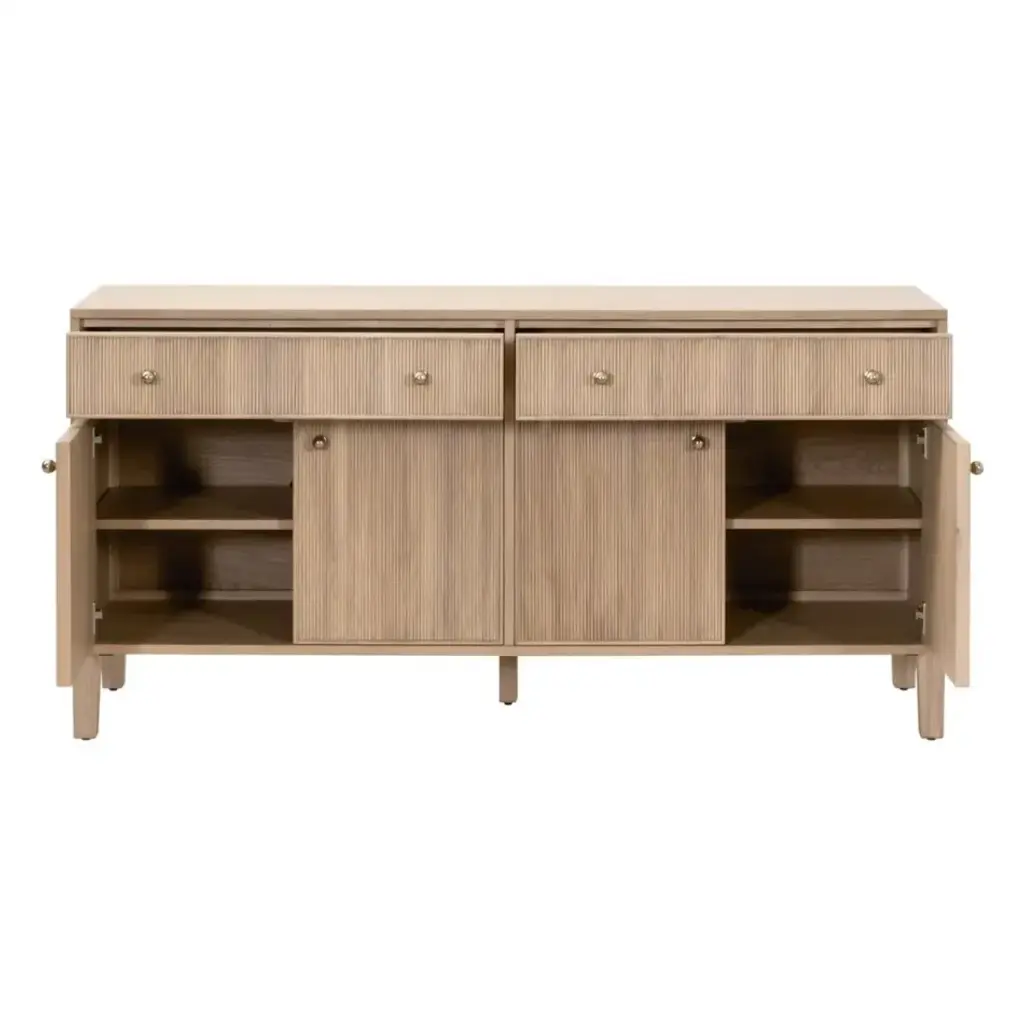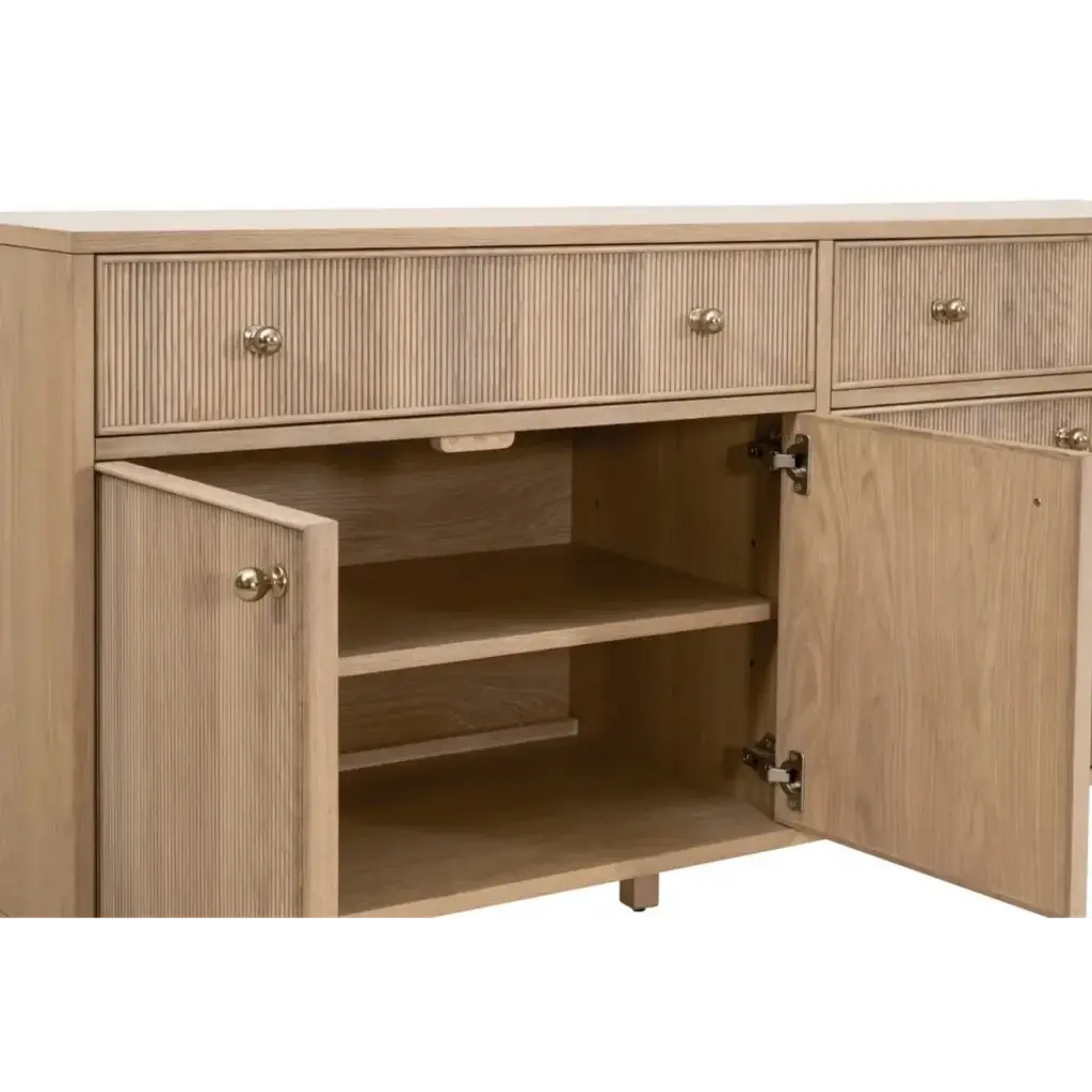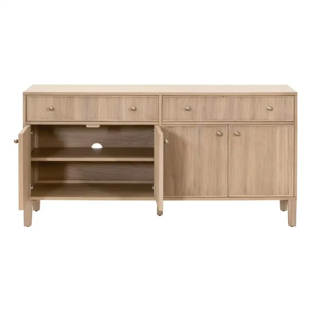 The Highland Media Sideboard by Essentials For Living blends timeless transitional design with functional storage solutions. Measuring 63" wide, 18" deep, and 31.5" high, it features a sturdy solid oak wood and oak veneer frame in a natural oak finish. The fluted wood drawer and cabinet fronts add dimension and texture for a unique design. Each drawer and door are equipped with solid polished brass iron knobs. The felt-lined drawers glide smoothly on soft-close metal tracks, while two spacious cabinets, each with adjustable shelves and cord management holes, provide versatile storage for media or other essentials. Dovetail joinery and KD leg construction ensure lasting durability and stability, making this sideboard both stylish and practical.