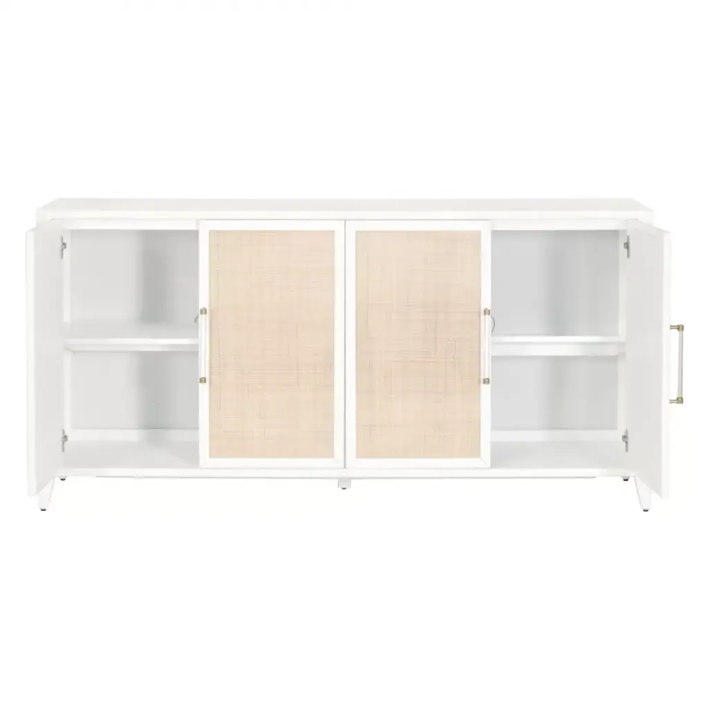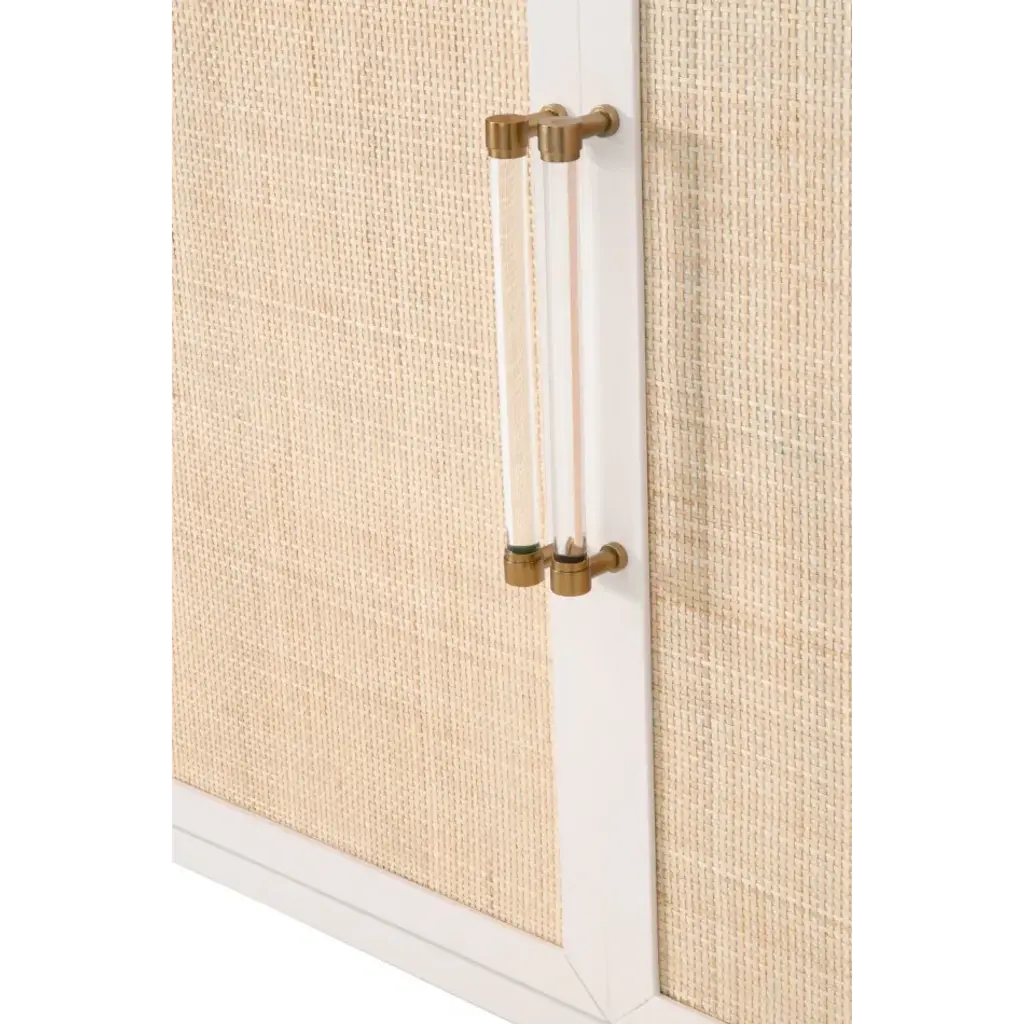 Transitional style media sideboard in matte white featuring natural rattan door front inlay with brass and acrylic decorative hardware.