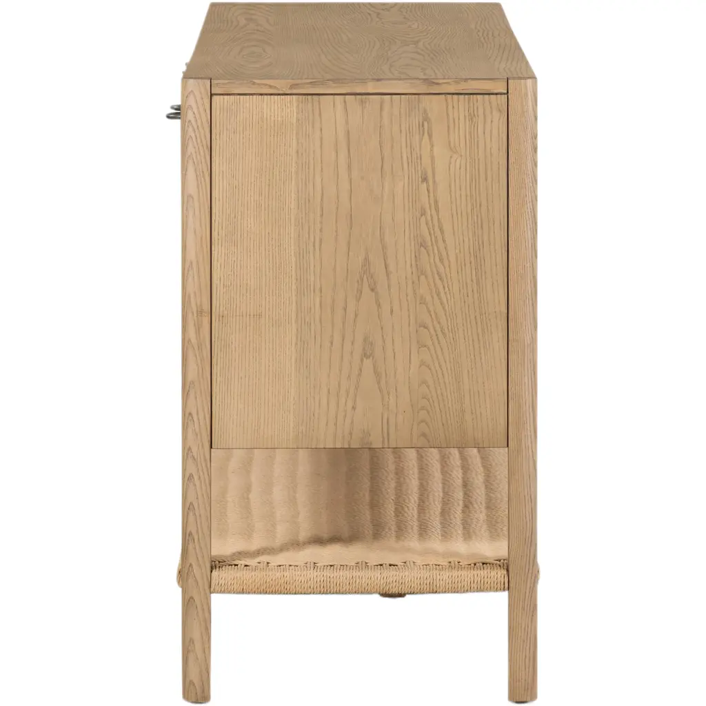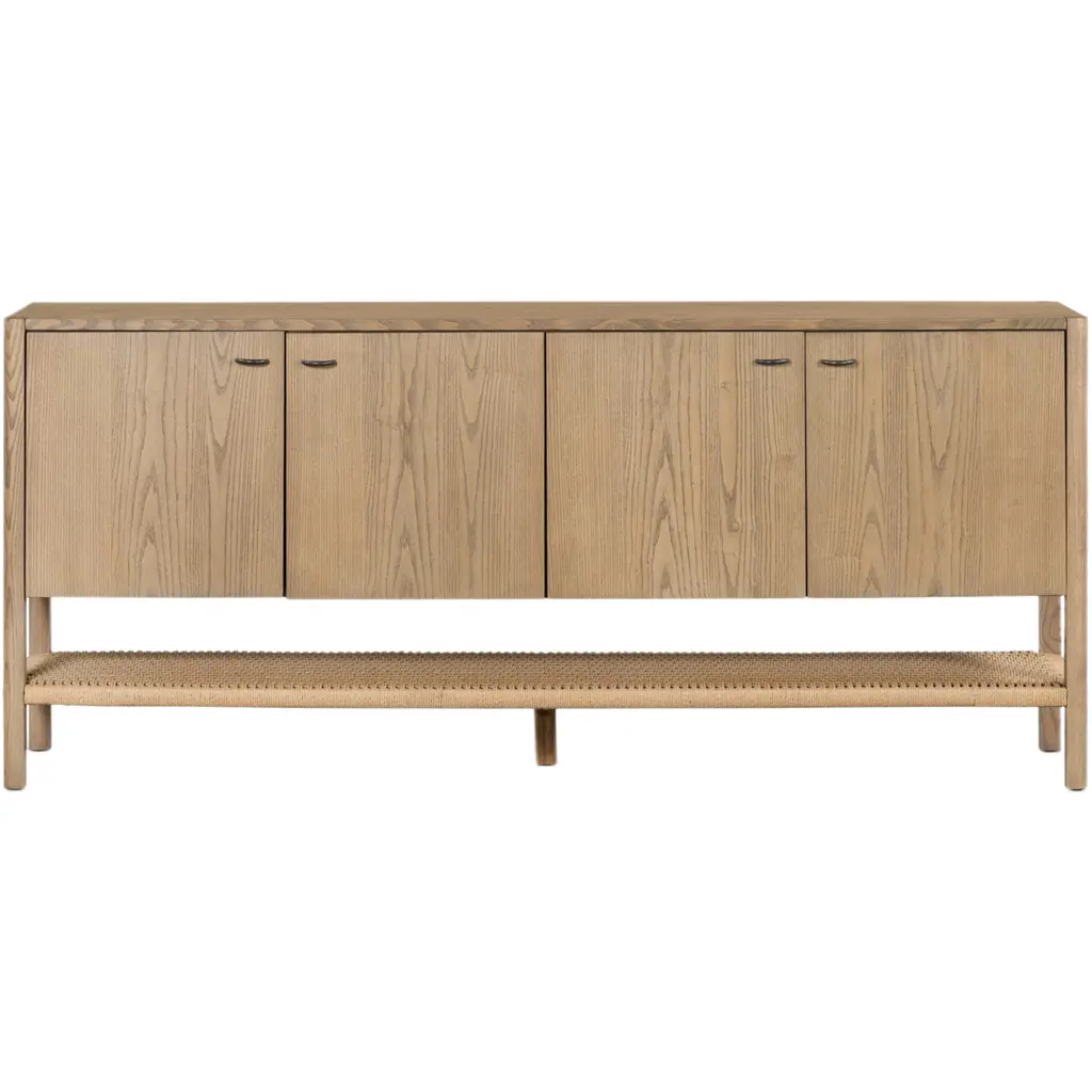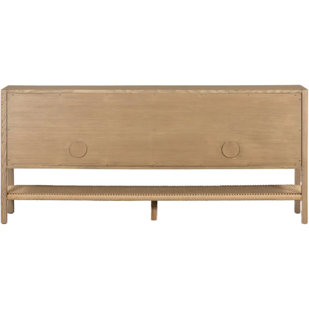 The Holly Sideboard embodies a simple yet refined aesthetic, drawing inspiration from Danish design. Crafted with meticulous attention to detail, this sideboard features a sophisticated combination of materials that exude elegance. The iron hardware, finished in a sleek gunmetal, complements the overall design, while the stretcher-style shelving, made from woven paper cord, adds a textural finishing touch. This piece seamlessly blends functionality with style, making it a versatile addition to any space.