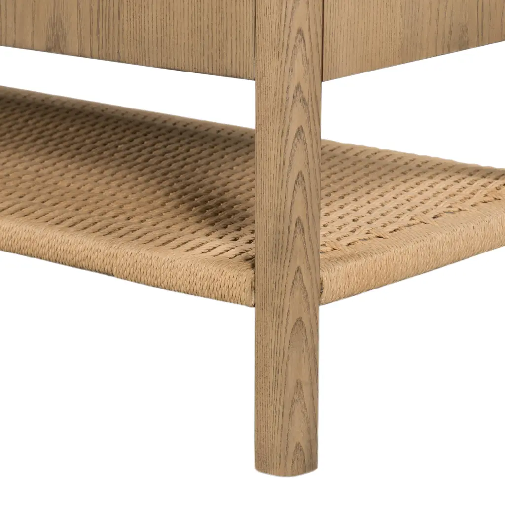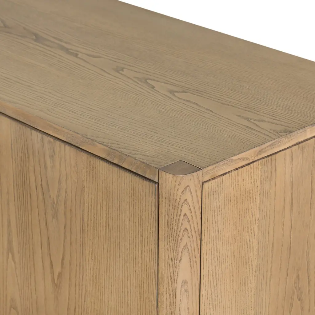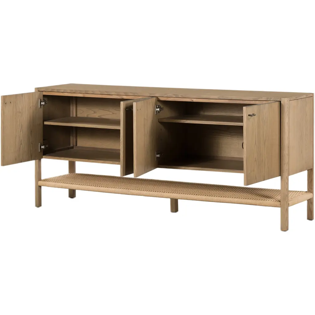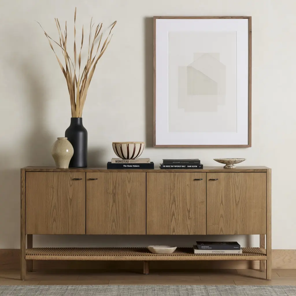 The Holly Sideboard embodies a simple yet refined aesthetic, drawing inspiration from Danish design. Crafted with meticulous attention to detail, this sideboard features a sophisticated combination of materials that exude elegance. The iron hardware, finished in a sleek gunmetal, complements the overall design, while the stretcher-style shelving, made from woven paper cord, adds a textural finishing touch. This piece seamlessly blends functionality with style, making it a versatile addition to any space.