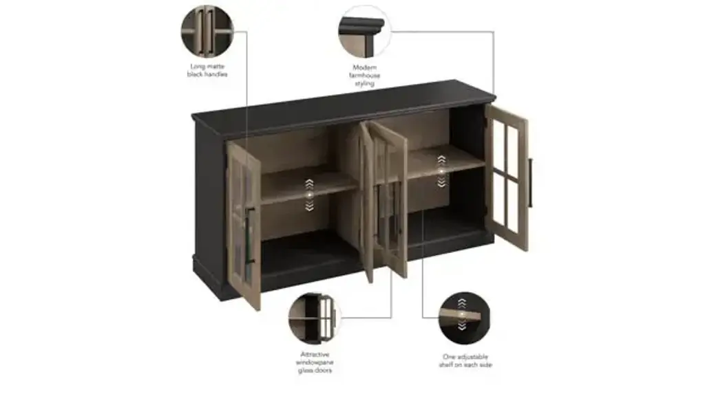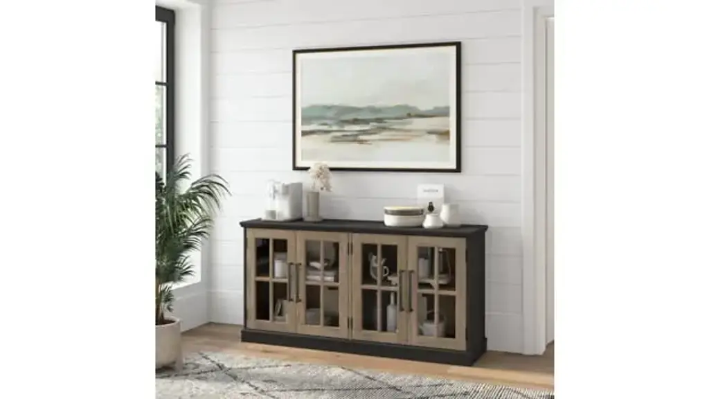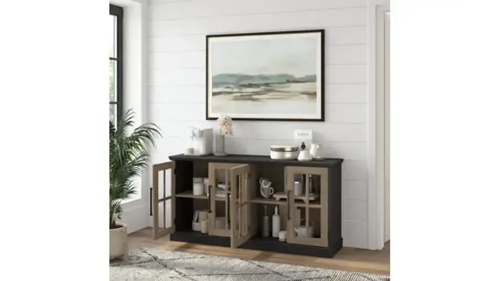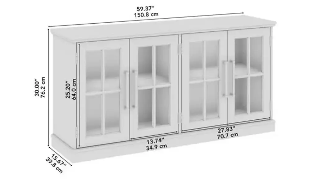 The Bush Furniture Westbrook 60" W Sideboard Cabinet is the perfect solution to keep your dining area, home office or living space beautifully organized. Lovely windowpane glass doors cover the cabinet's shelf on each side to keep your dinnerware, photo albums, or any other valuables safely tucked away. The adjustable shelves can support up to 50 lbs, so you can store bigger items with confidence. The cabinet doors are adorned with long matte black handles and exposed barrel hinges that reflect the best elements of modern and farmhouse styling for an elevated look. Thanks to its versatile style, this storage cabinet with doors suits a variety of home decor styles, from traditional, to contemporary. The sideboard's surface also makes a great serving station and can be used to display decorations. This buffet cabinet is a great choice to add a touch of style and practical storage to your dining room, home office, entryway, or any other living space. This farmhouse sideboard has been meticulously tested to meet or exceed industry standards for safety, durability, and performance. Create a cohesive living space with coordinating items from the Westbrook Collection, including home office desks, file cabinets, bookcases, media consoles, and more. Overall Dimensions: 59.37" W x 15.67" D x 30" H. Ships ready for easy assembly.