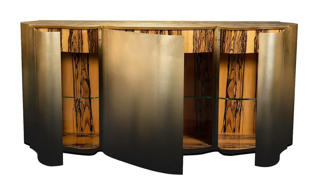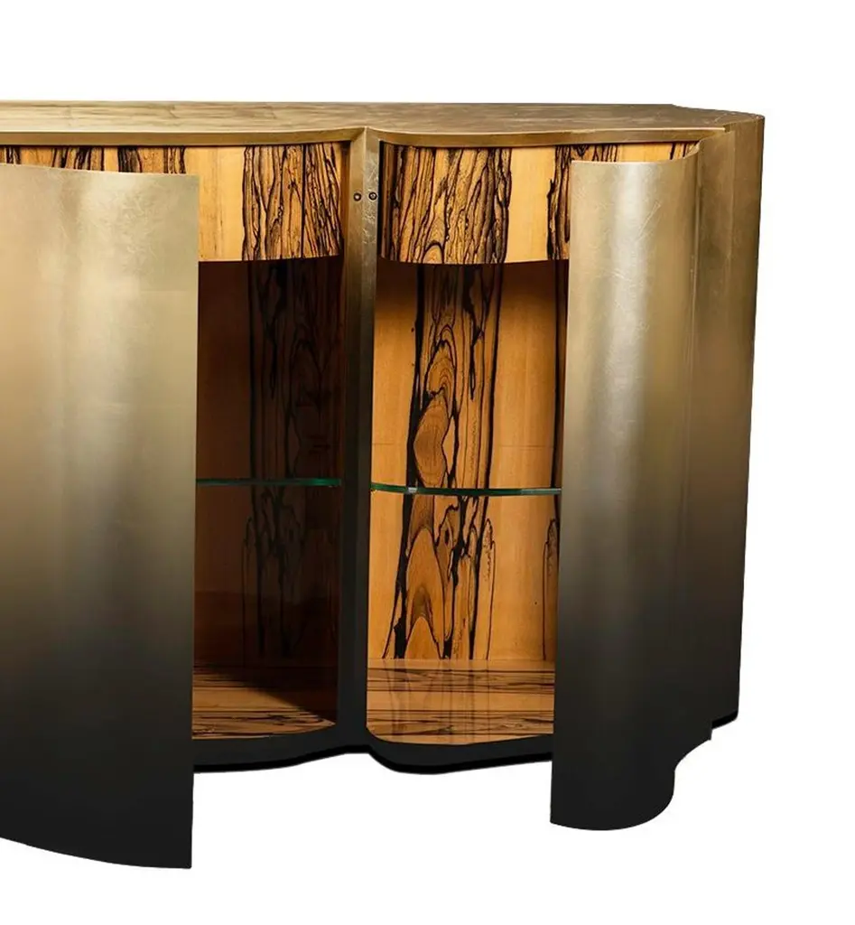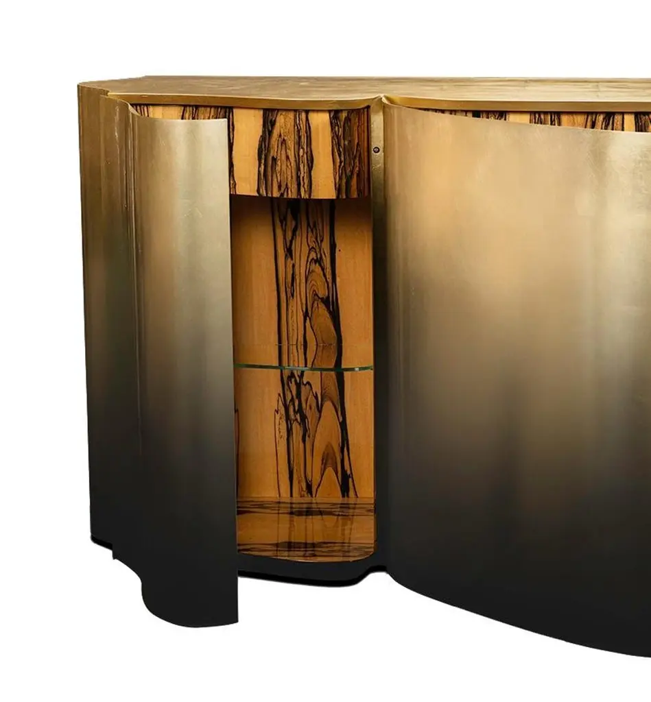 Honor Gradient Sideboard by Memoir EssenceDimensions: D 50 x W 200 x H 90 cm.Materials: Gold leaf, and royal ebony with black gradient.Also available with a lacquered interior. Please contact us.This stunning sideboard presents a curvilinear shape, is presented with 3 doors and with its gradient gold leaf fading from gold to black with high gloss varnish. Honor gradient interior is in royal ebony veneer that makes this sideboard even more special.Memoir Essence Interiors has been writing its memoirs day by day, inspired in every detail lived through a feminine world, this world brings the most delicate imaginary. Jewelry, fashion, architecture, music, art and materials are Memoir’s inspirations to materialize a collection of design pieces of furniture, upholstery, lighting and accessories.The use of noble materials like marble, brass, veneers, gold and silver leaf, Swarovski crystals as other decorative and fine materials, combined with handwork techniques as casted brass, hand-whickered fabric ribbons, gold leaf appliance, marble cutted and puzzled pieces, provide the needed essence to tell memoirs through the designed pieces and the interiors they fulfill.This collection mostly handmade and focused on details and material nobility is made in Portugal, bringing handwork techniques that are part of Portuguese history, applied in a current and differentiated way, delivering timeless pieces to your special projects. Acquire Memoir is the opportunity to travel through the feminine essence over design and experience a unique “memoir” of timelessness and exclusivity.Writing is first chapter in 2016, after a journey of inspirational research, forecasting and design, Memoir made its first appearance at Maison et Objet, Paris.Since then Memoir is “writing” memories adding new materials, designs, techniques and appearances around the world, as in Paris, London or UAE.Memoir will continue this journey, always motivated by the inspiration possibilities in the many delicate details found in feminine world.Tell your memoires with this collection and be a memorialist yourself…