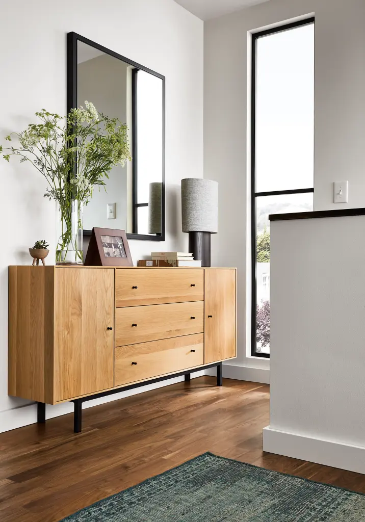 Built to be rock solid, this modern console cabinet is handcrafted in West Virginia by skilled artisans, who share their pride by signing the back of each piece. The natural grain of sustainably sourced U.S. solid wood is the perfect backdrop for the sleek, timeless design of this collection.