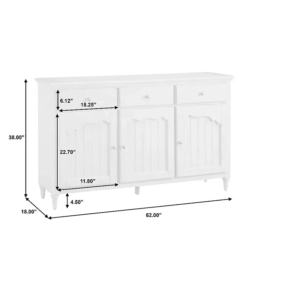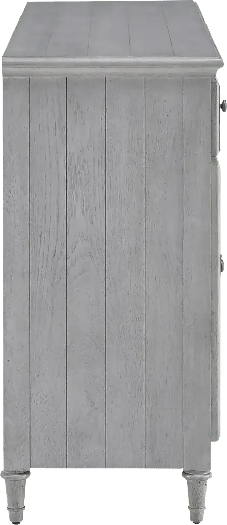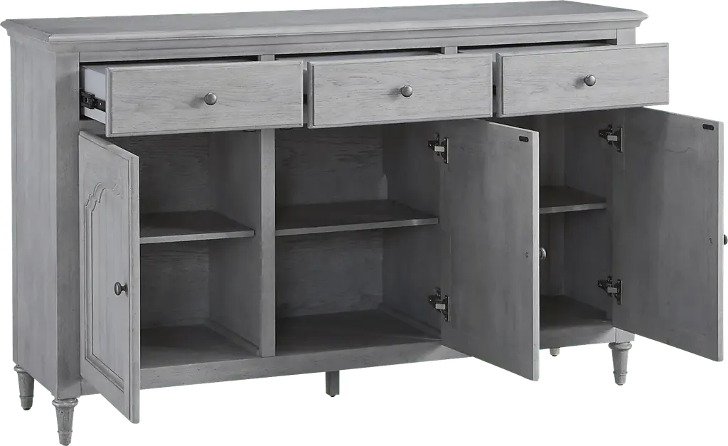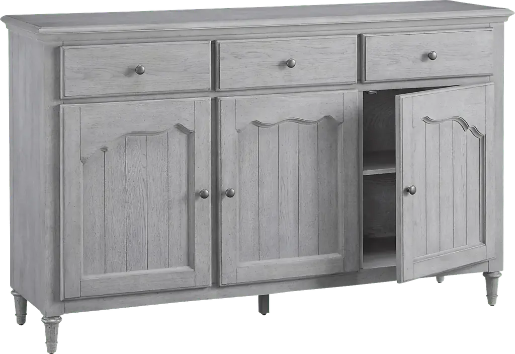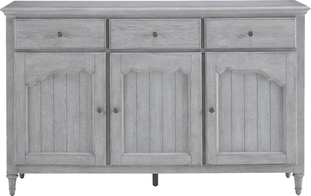 Enhance your home with the Icegate gray sideboard. Three upper drawers are perfect for organizing smaller items, like linens, cutlery, or office supplies, keeping essentials within reach. Behind the three doors below are spacious compartments with adjustable shelves, ideal for stowing larger items or keeping clutter out of sight. The light gray finish creates a gentle, weathered look that adds warmth without overpowering the room. This versatile piece made from high-quality hickory veneer and hardwood solids with a fully finished back exudes a sophisticated, calming vibe that elevates the ambiance of any room. Customer assembly is required.