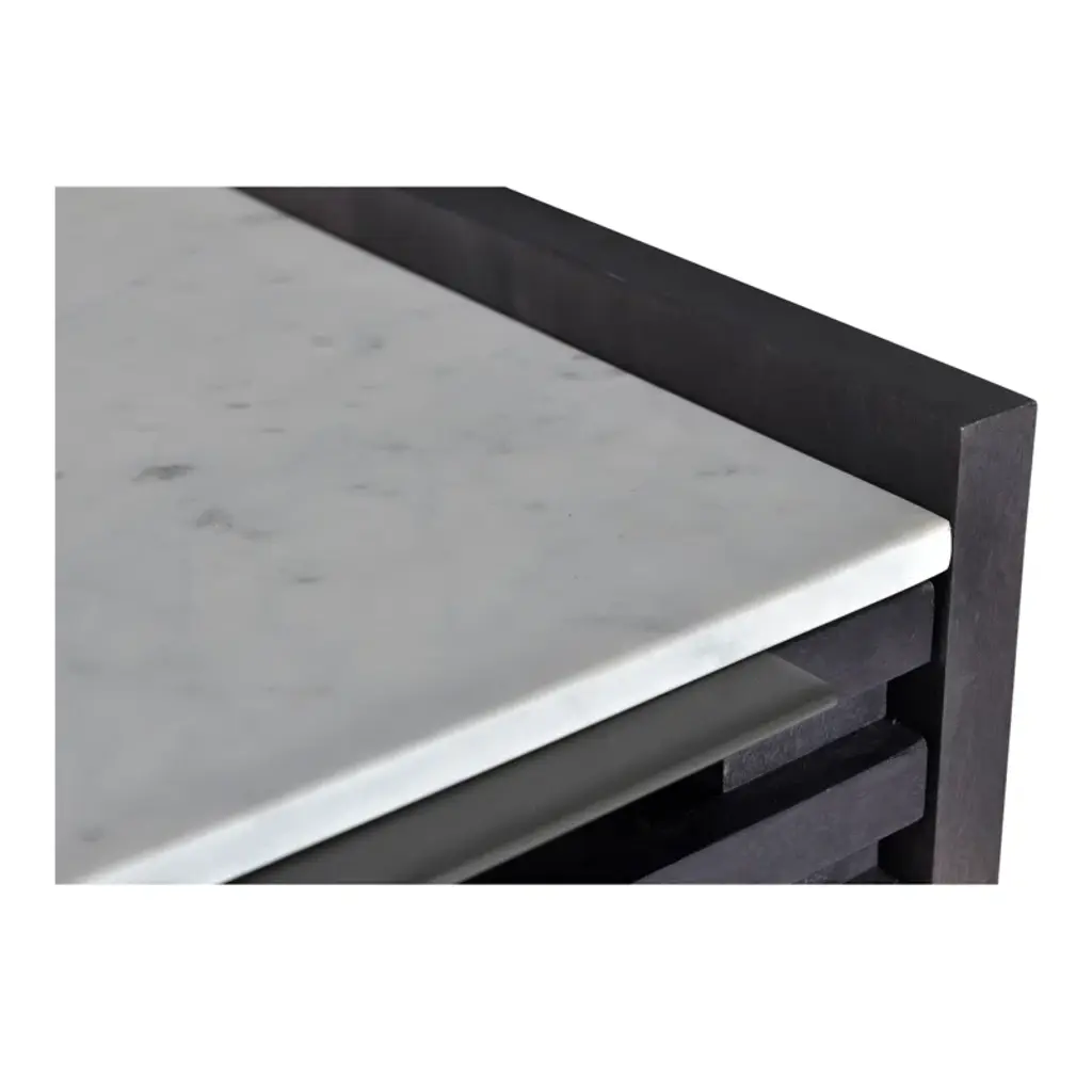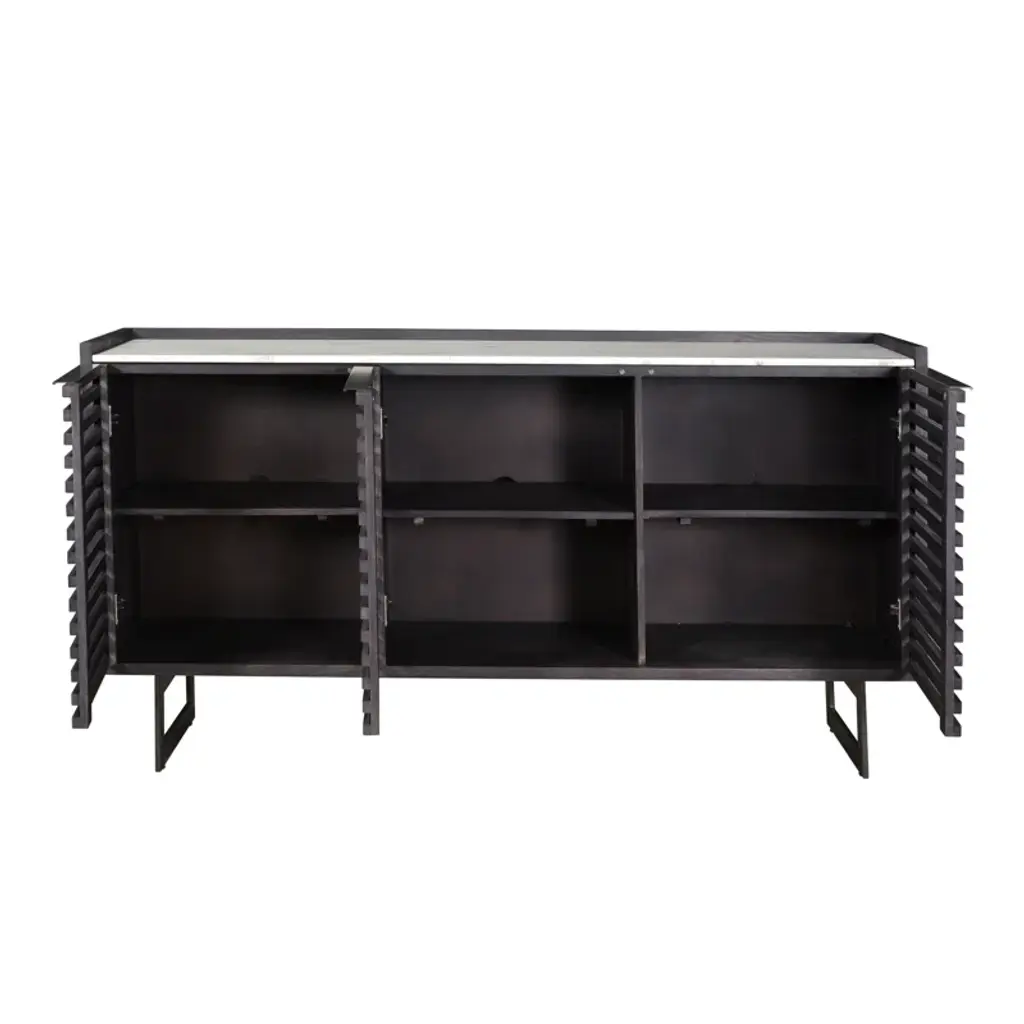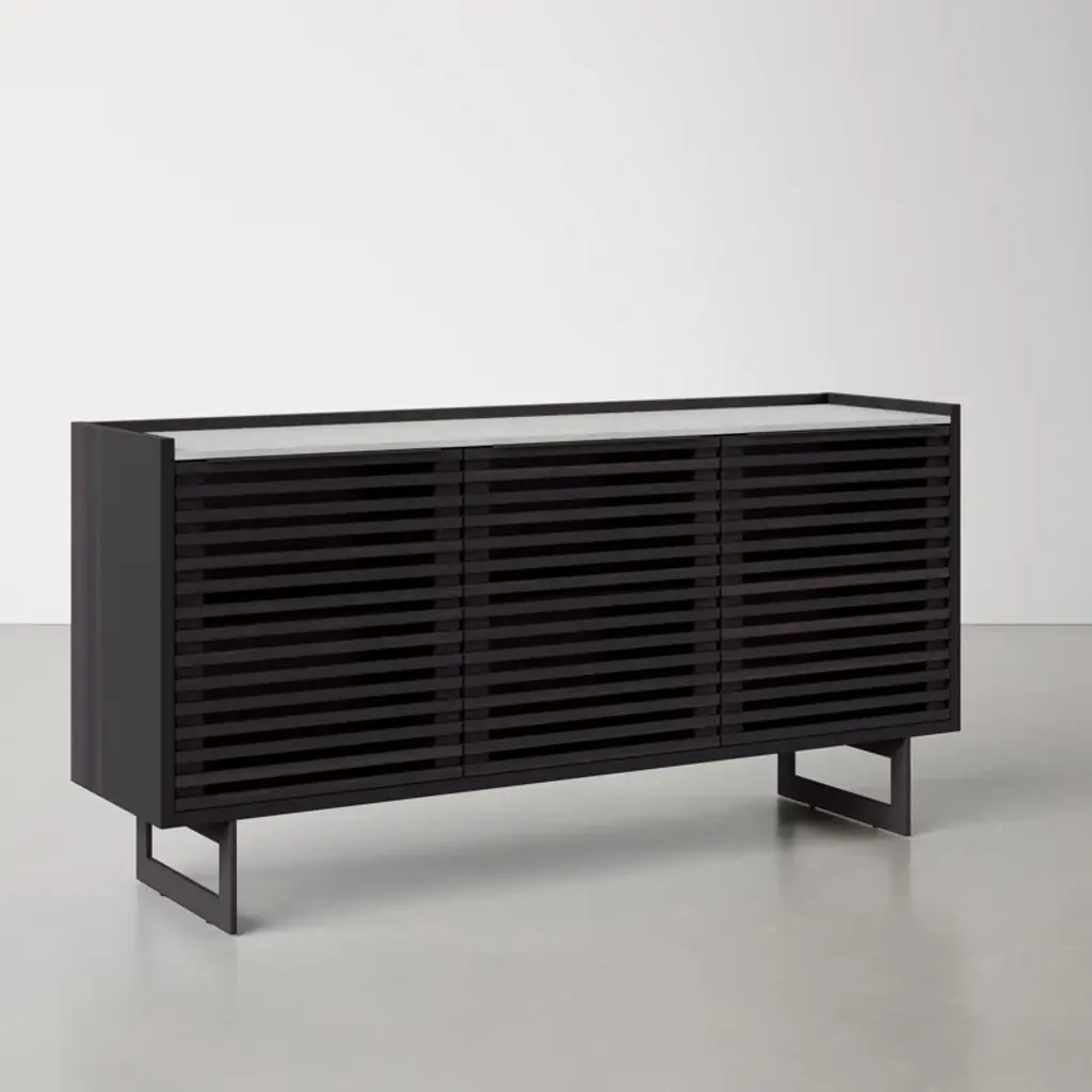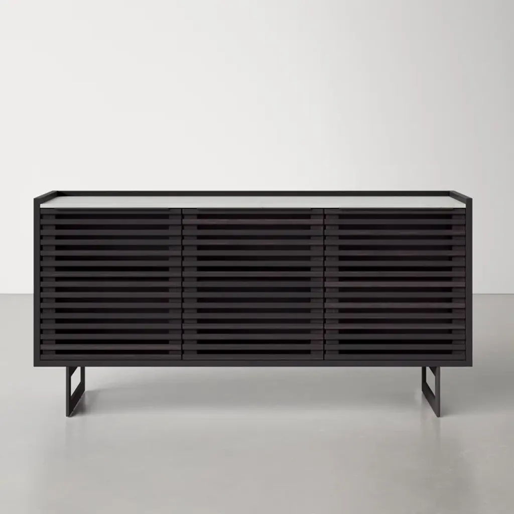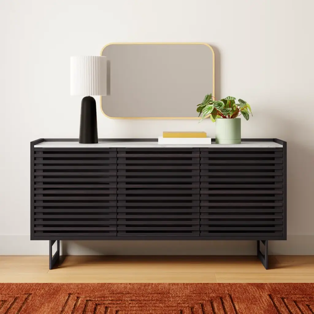 This sideboard’s minimalist lines are enlivened by textural and material contrasts. Three slatted doors screen the shelves from view, and magnetic catches hold them securely shut. Raised edges keep dishes and decor in place on the white marble tabletop, and slender sled legs add visual white space.