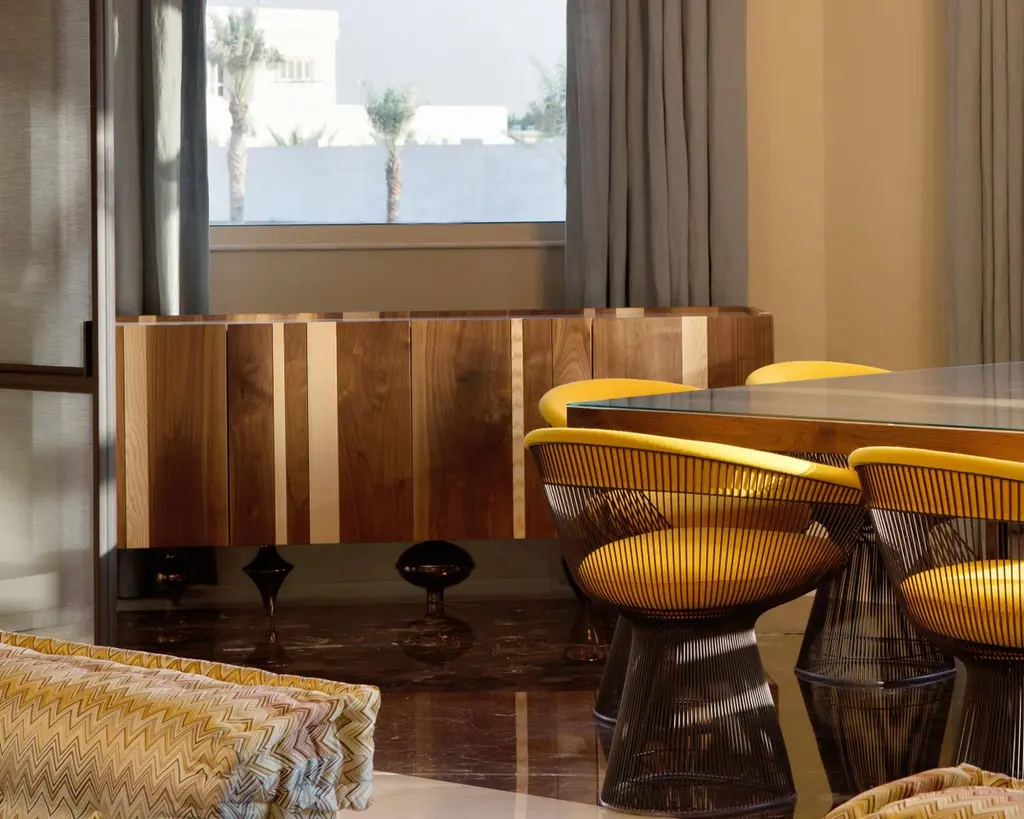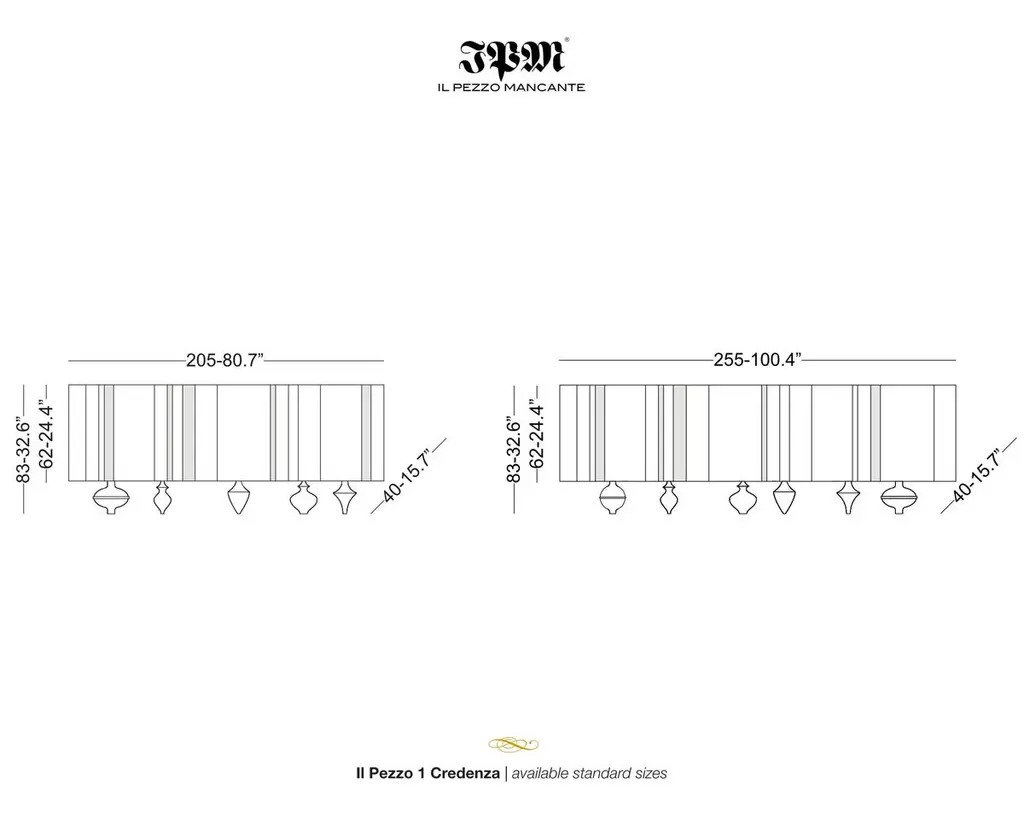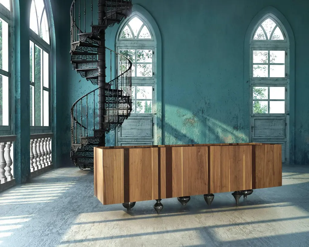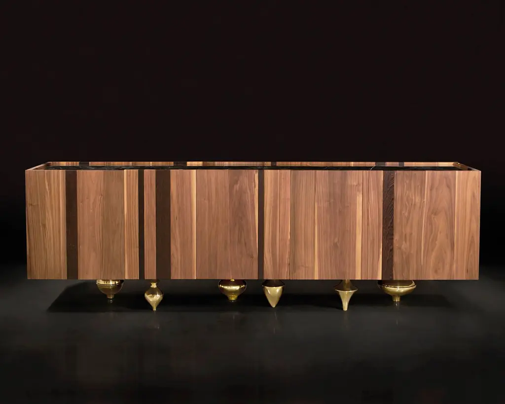 An alternation of rounded shapes and geometrical lines, reassuming discipline and freedom, a composite, multiethnic plan in which each component and each material contributes to the harmonious balance of the piece. Il Pezzo 1 Credenza is completely made of solid American walnut with contrasting stripes in solid ash or solid wenge. The wood is treated with a natural oil that both protects and allows it to breathe, preserving the extraordinary tactile sensation of this exquisite material. The tabletop features a stunning slab of either white Carrara or black Marquinia marble, while the feet are made of brass casting, according to the noblest Tuscan artisan tradition. Each product is adorned with the “Missing Piece” (“Pezzo Mancante” in Italian): a small brass cylinder containing a unique serial number, guaranteeing its authenticity and individuality. Custom sizes and finishes are also available to suit every preference.All our masterpieces are meticulously crafted in our Atelier located in Florence, Italy, from a small team of people driven by a shared passion for quality and beauty. We constantly strive to create unparalleled works of art, where each piece is a testament to our commitment tocraftsmanship and innovation.Structure: solid walnut and solid wenge stained oakTop: Marquinia marbleBase: gold finish brass castingSize: 255x40xH83 cm - 100.4"x15.7"xH32.6"
