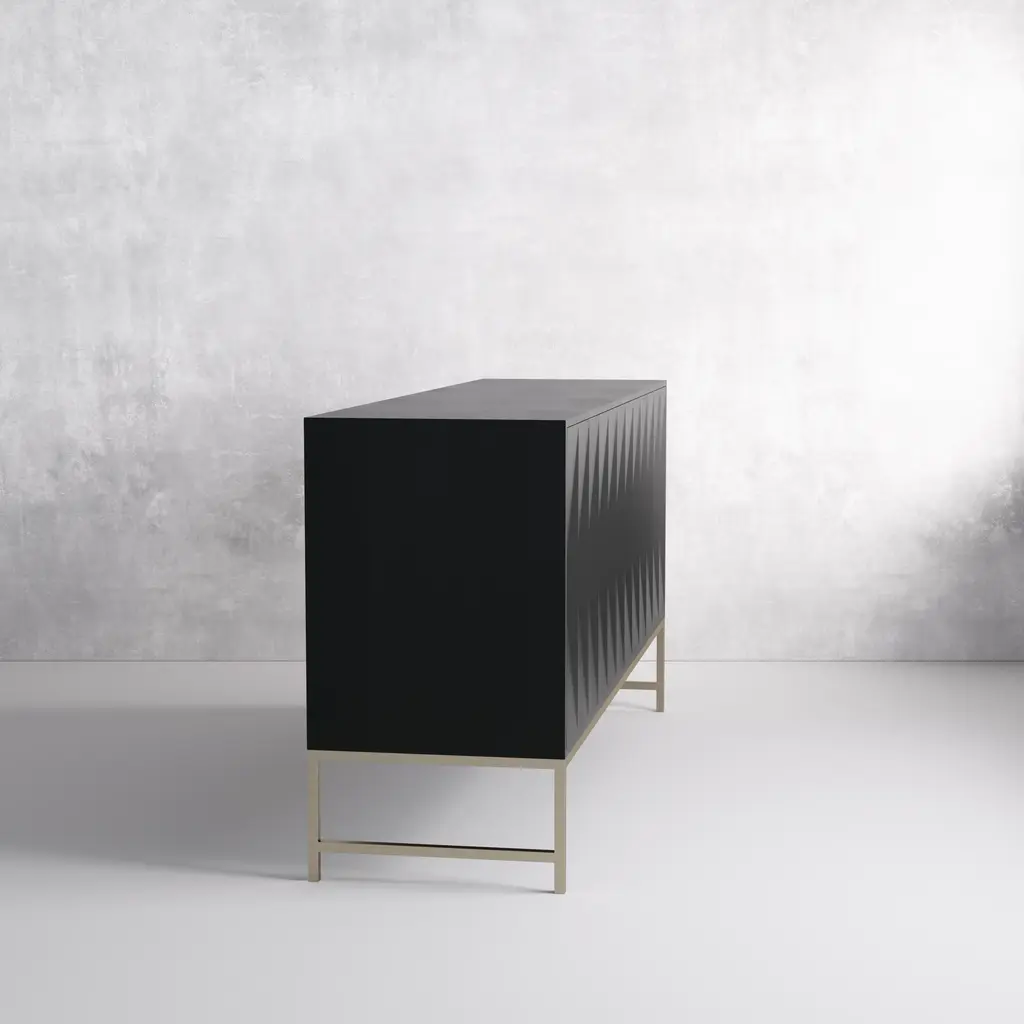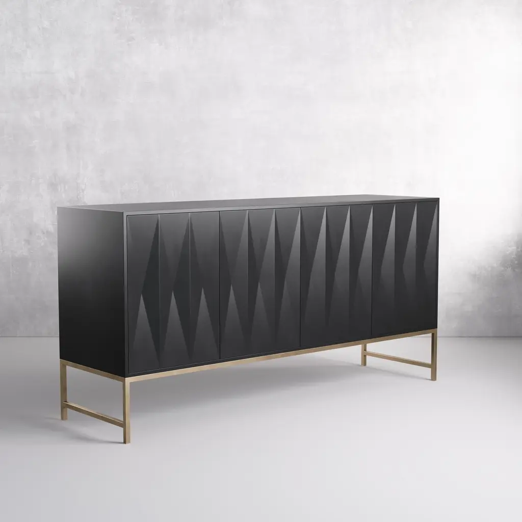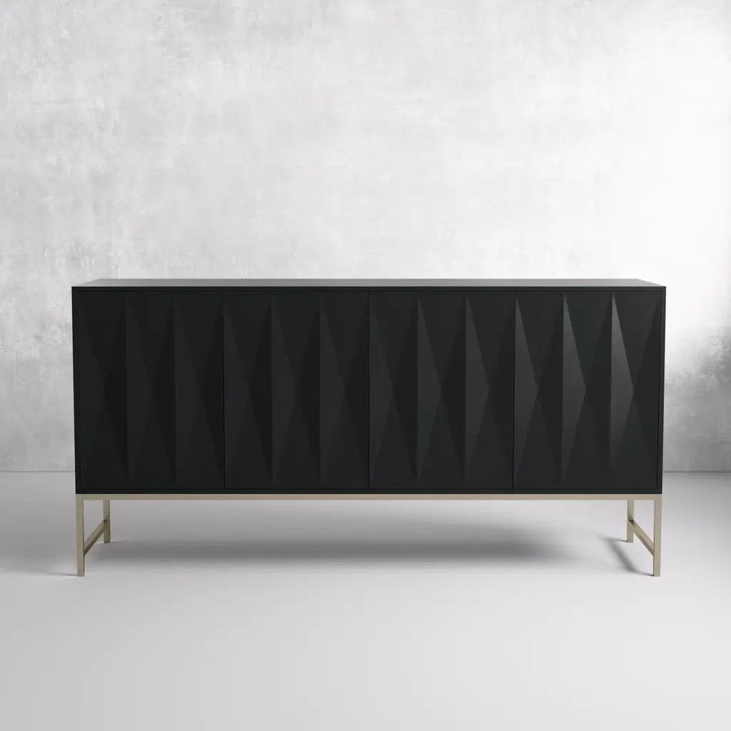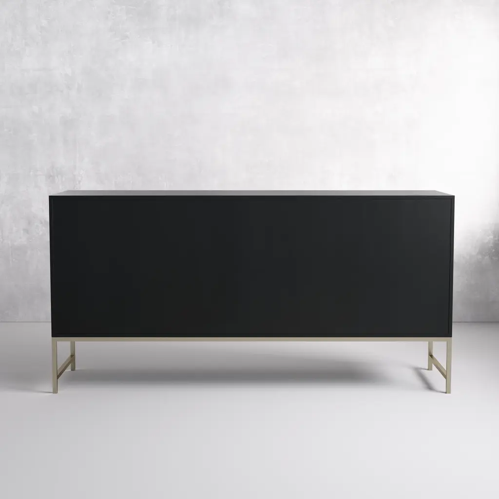 A matte finish puts a contemporary twist on this Mid-mod-style console. The stainless-steel frame in a brushed brass nickel shade creates a subtle visual contrast. Use our Indio console as a sideboard or entertainment center. If you're in love with Mid-century details but you want your interior to look up-to-date, this console is an ideal compromise. Perfect for your commercial or residential space, our Indio console is both elegant and eclectic. Dimensions: 72.0''W x 20.0''D x 35.8''H Tear Sheet