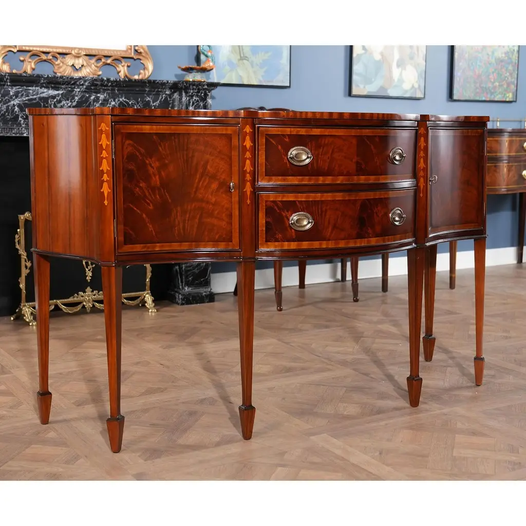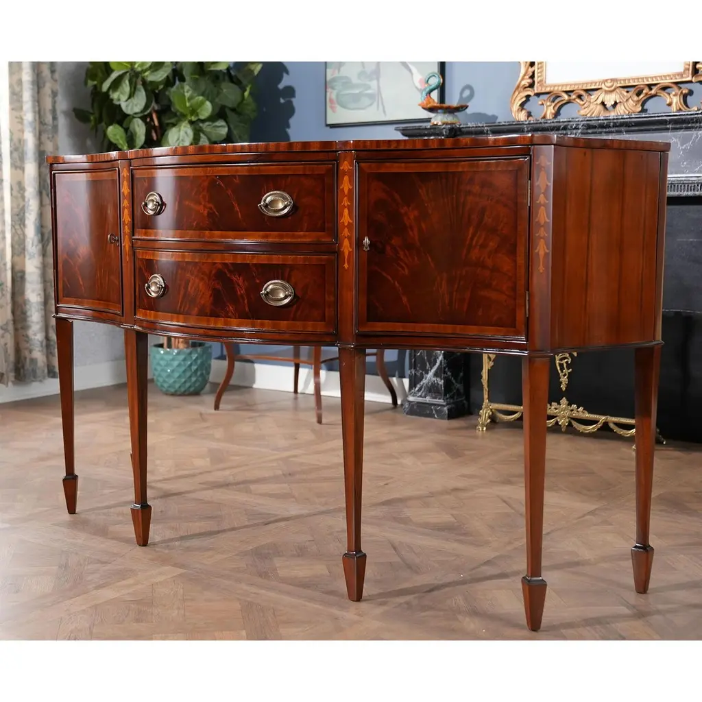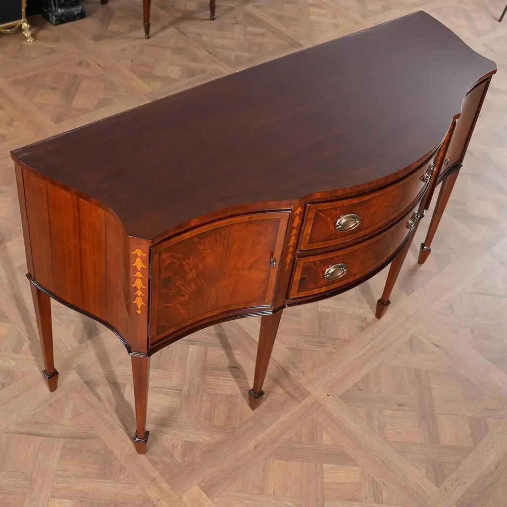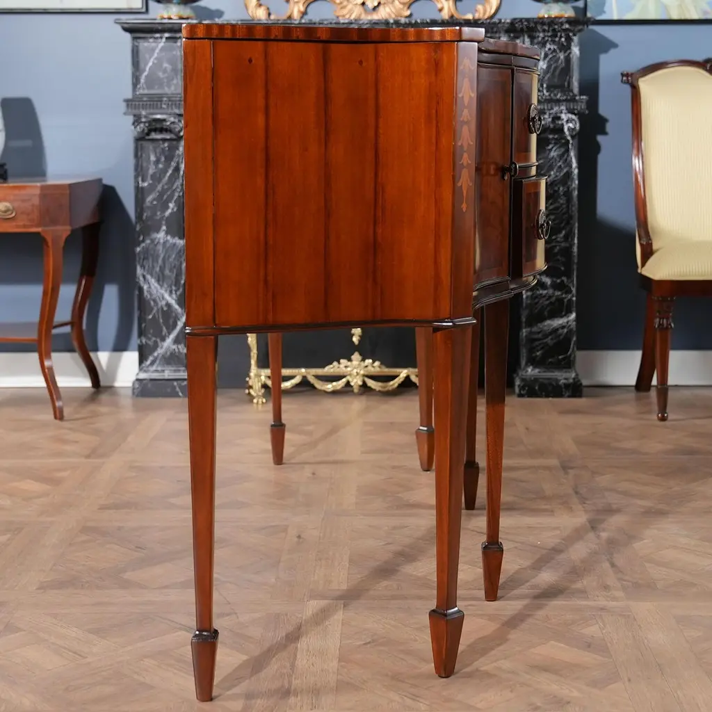 This sophisticated Inlaid Sideboard is beautifully appointed throughout and also boasts practical storage space. The serpentine shaped front is a classic design feature and this shape is highlighted on the top of the sideboard with lightly contrasting sapele banding. Continuing down the Inlaid Sideboard the two high quality dovetailed drawers and the two doors are curved as are the sides of the piece. The whole of the case resting on square double tapering legs ending in a classic spade foot design suitable for us with many of the chairs also on offer from Niagara Furniture. The top of the legs being hand inlaid with satinwood, bellflower designs.Measures 67?w x 24?d x 40?h metric: 170 x 61 x 102