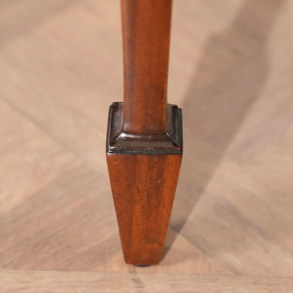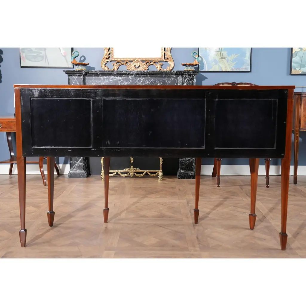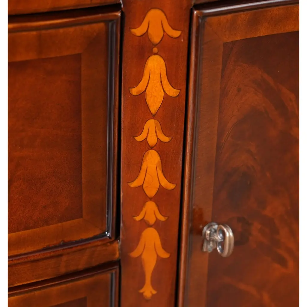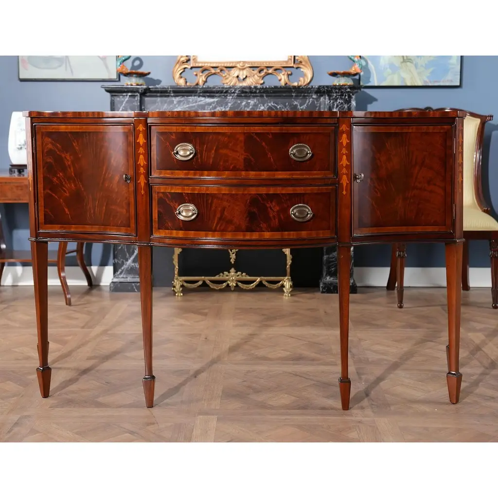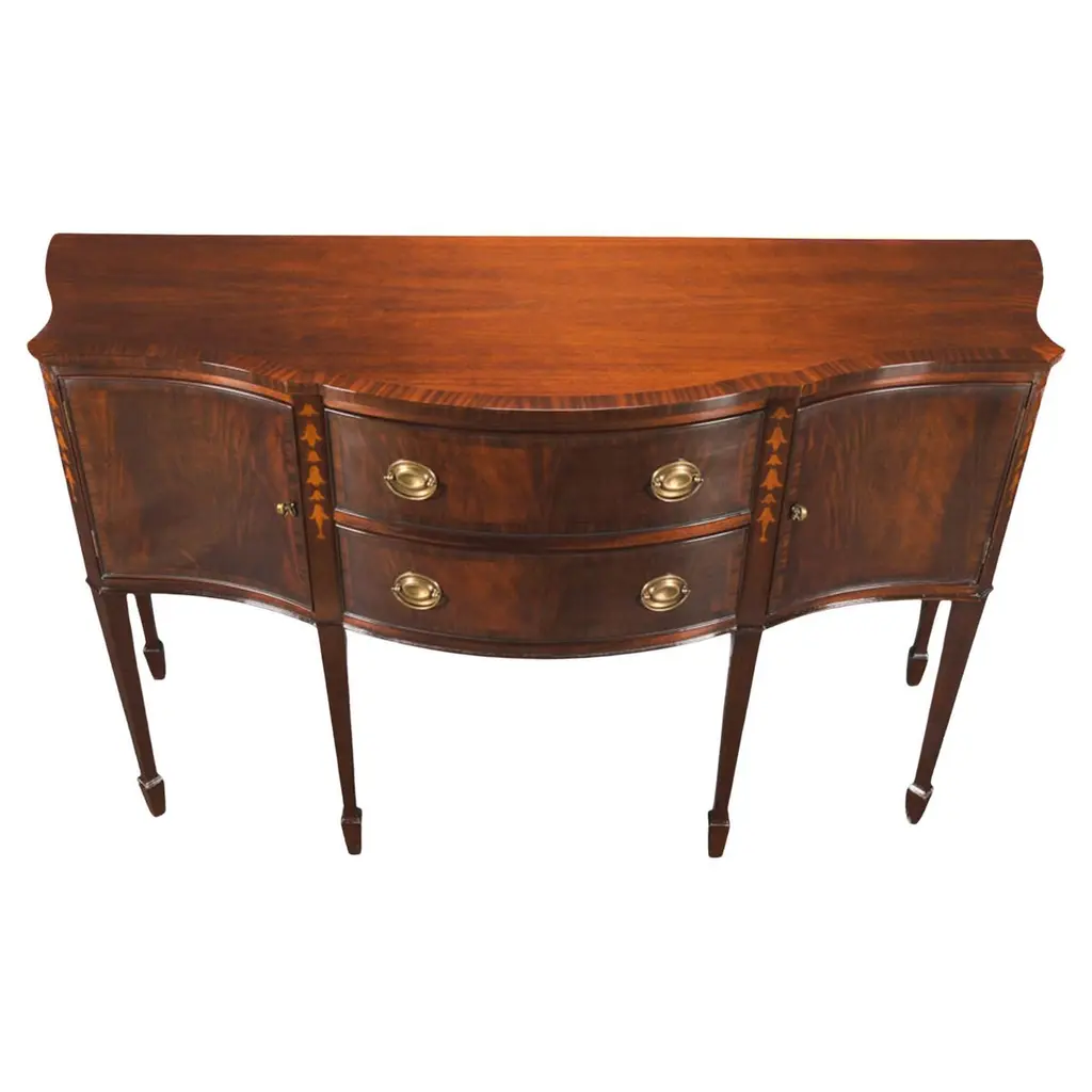 This sophisticated Inlaid Sideboard is beautifully appointed throughout and also boasts practical storage space. The serpentine shaped front is a classic design feature and this shape is highlighted on the top of the sideboard with lightly contrasting sapele banding. Continuing down the Inlaid Sideboard the two high quality dovetailed drawers and the two doors are curved as are the sides of the piece. The whole of the case resting on square double tapering legs ending in a classic spade foot design suitable for us with many of the chairs also on offer from Niagara Furniture. The top of the legs being hand inlaid with satinwood, bellflower designs.Measures 67?w x 24?d x 40?h metric: 170 x 61 x 102