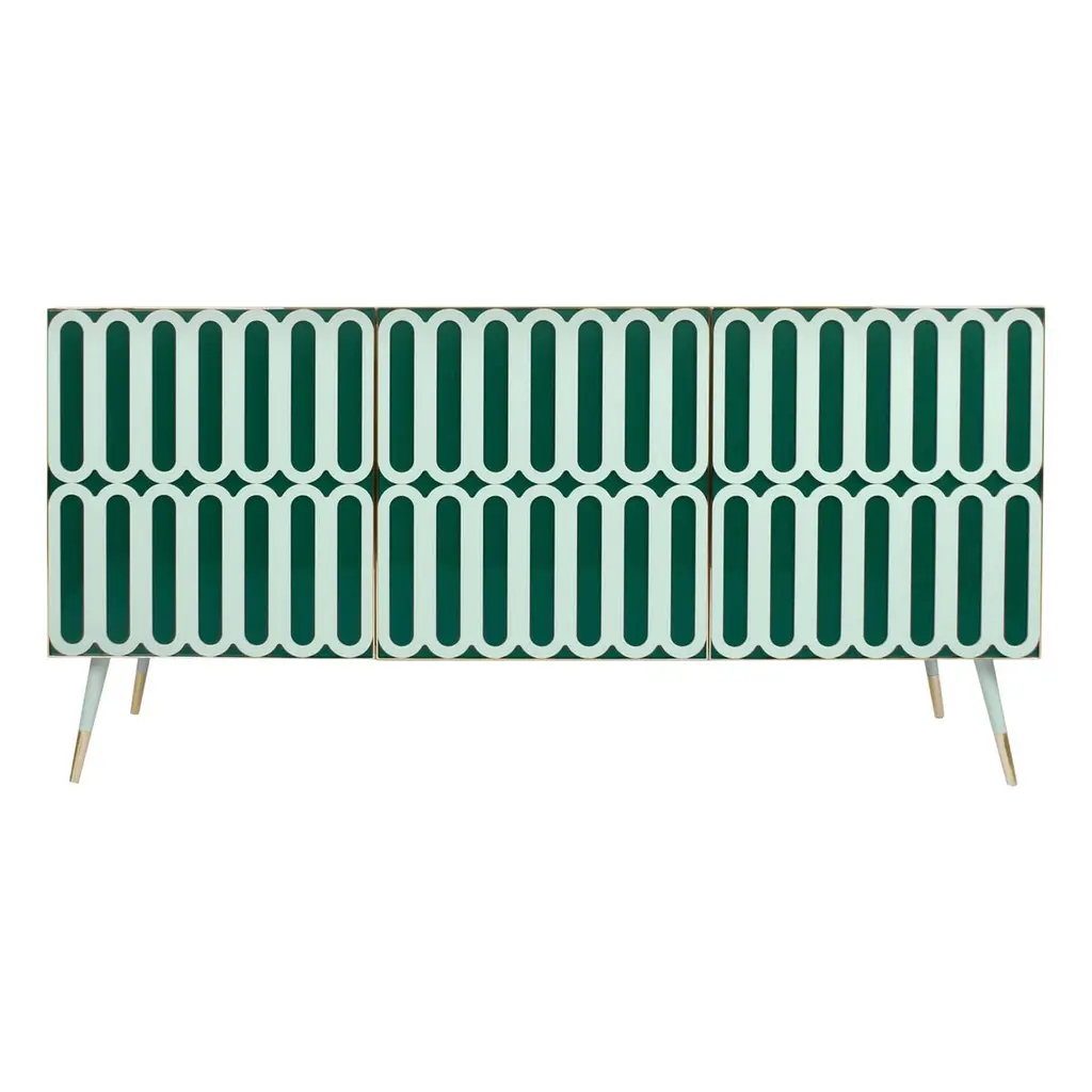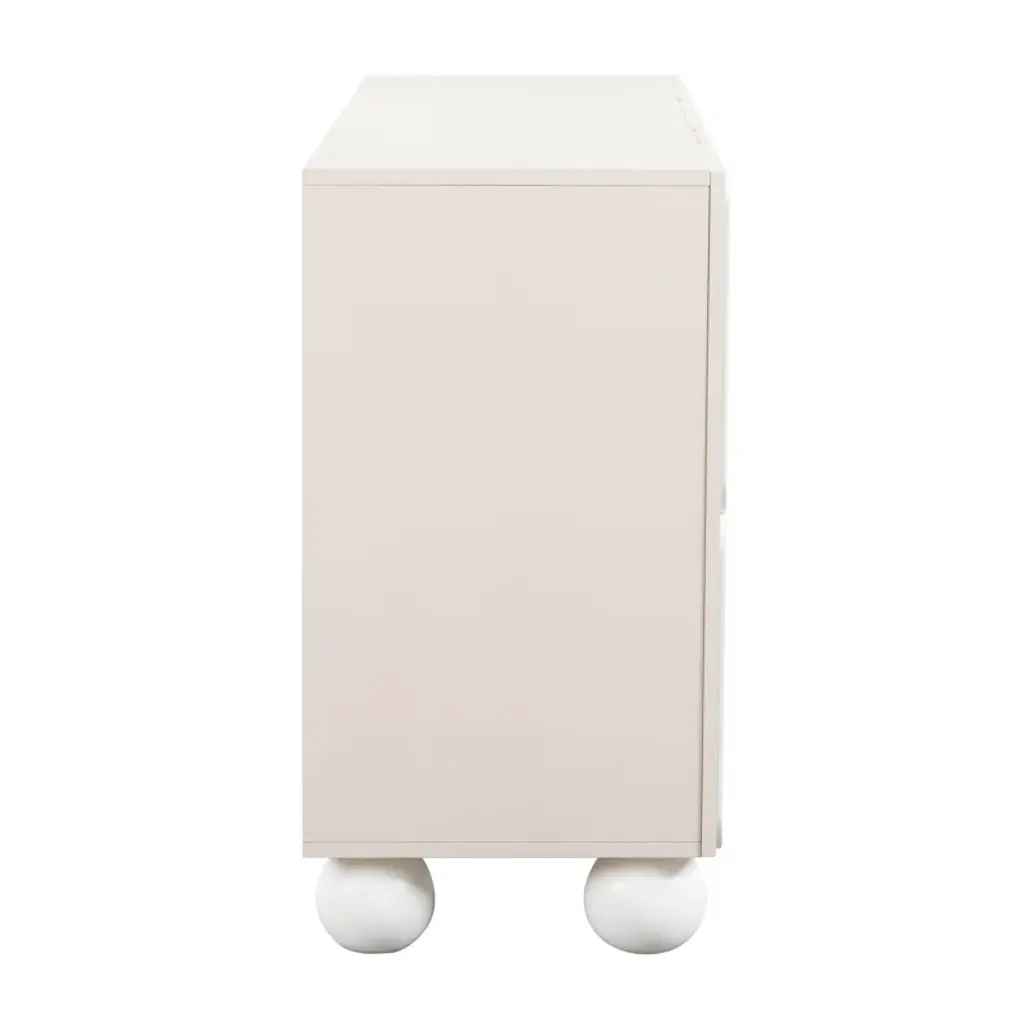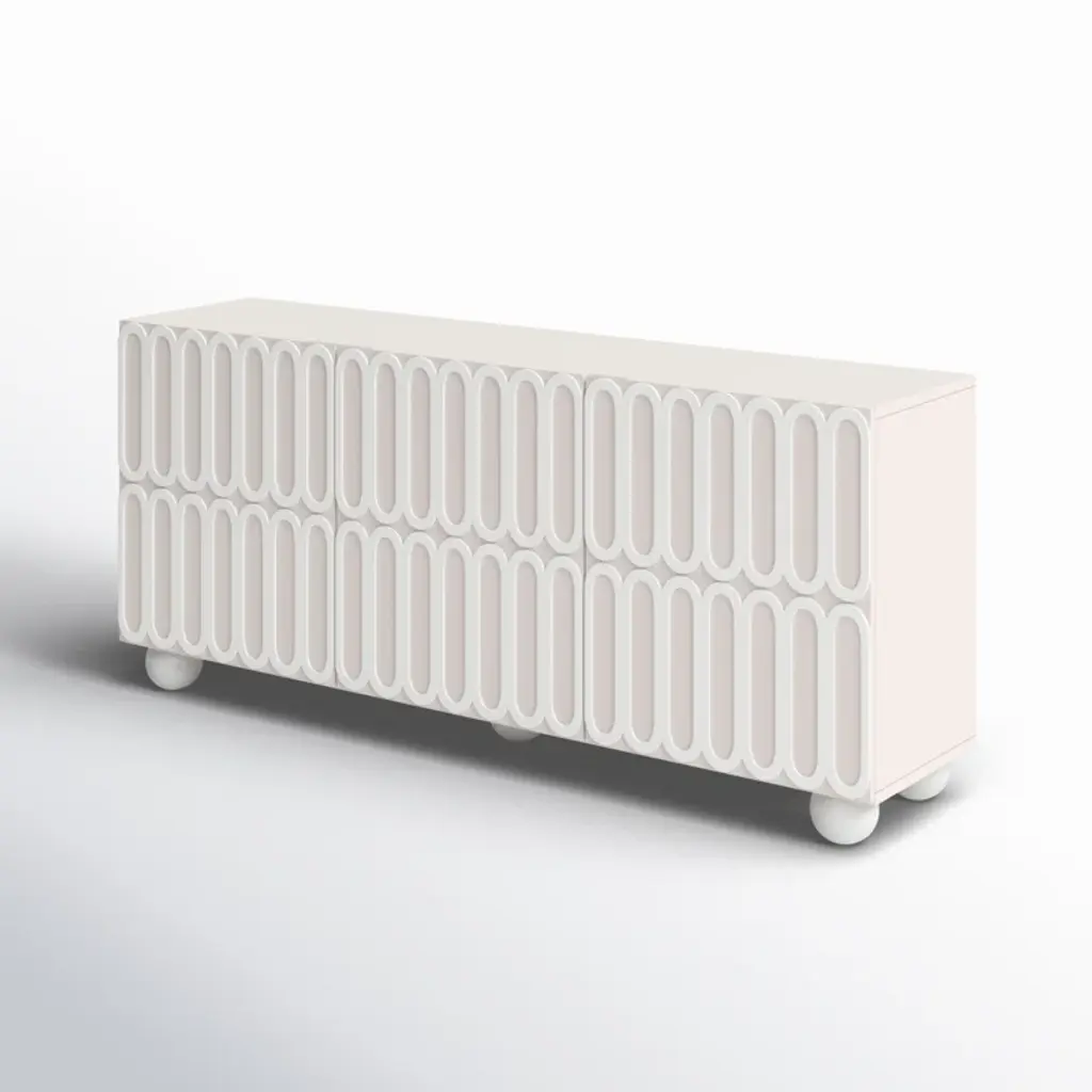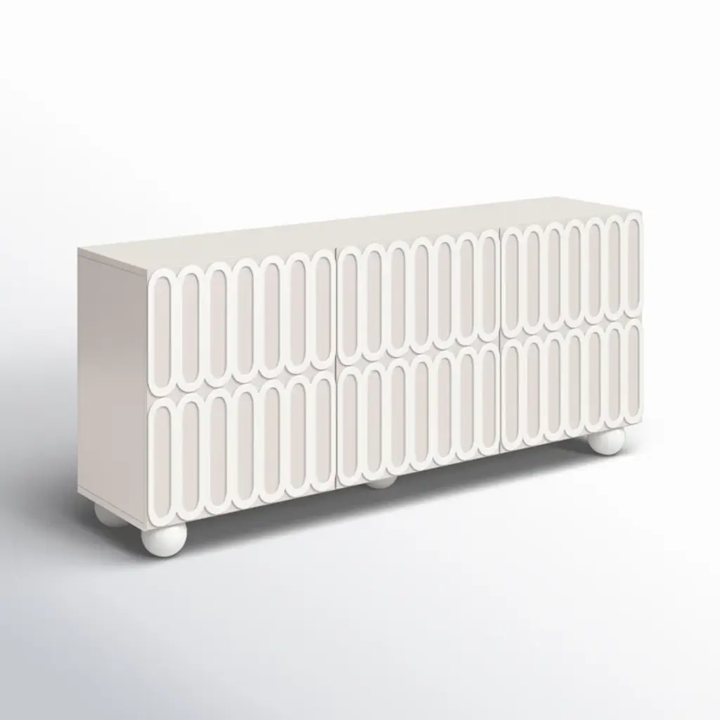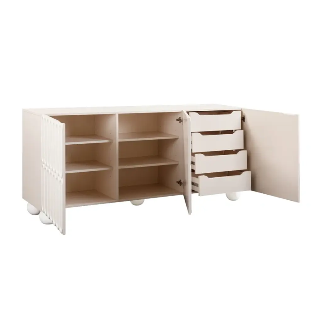 Steal the spotlight with this motif taupe buffet, where a dynamic façade plays the lead role without overshadowing its practical brilliance. Behind the scenes, four discreet drawers offer a storage ensemble fit for the most discerning collector, all perched upon solid wood, spherical legs that bring a sculptural, Hollywood-esque flair. This buffet dazzles with a medium sheen that makes cleanup a breeze, paired with soft-close hinges that salute quality, and adjustable shelves that flex to fit your function with a dash of finesse.