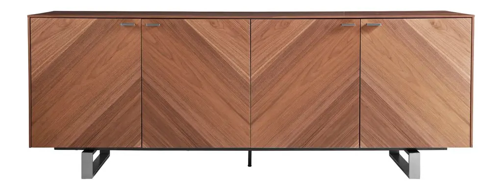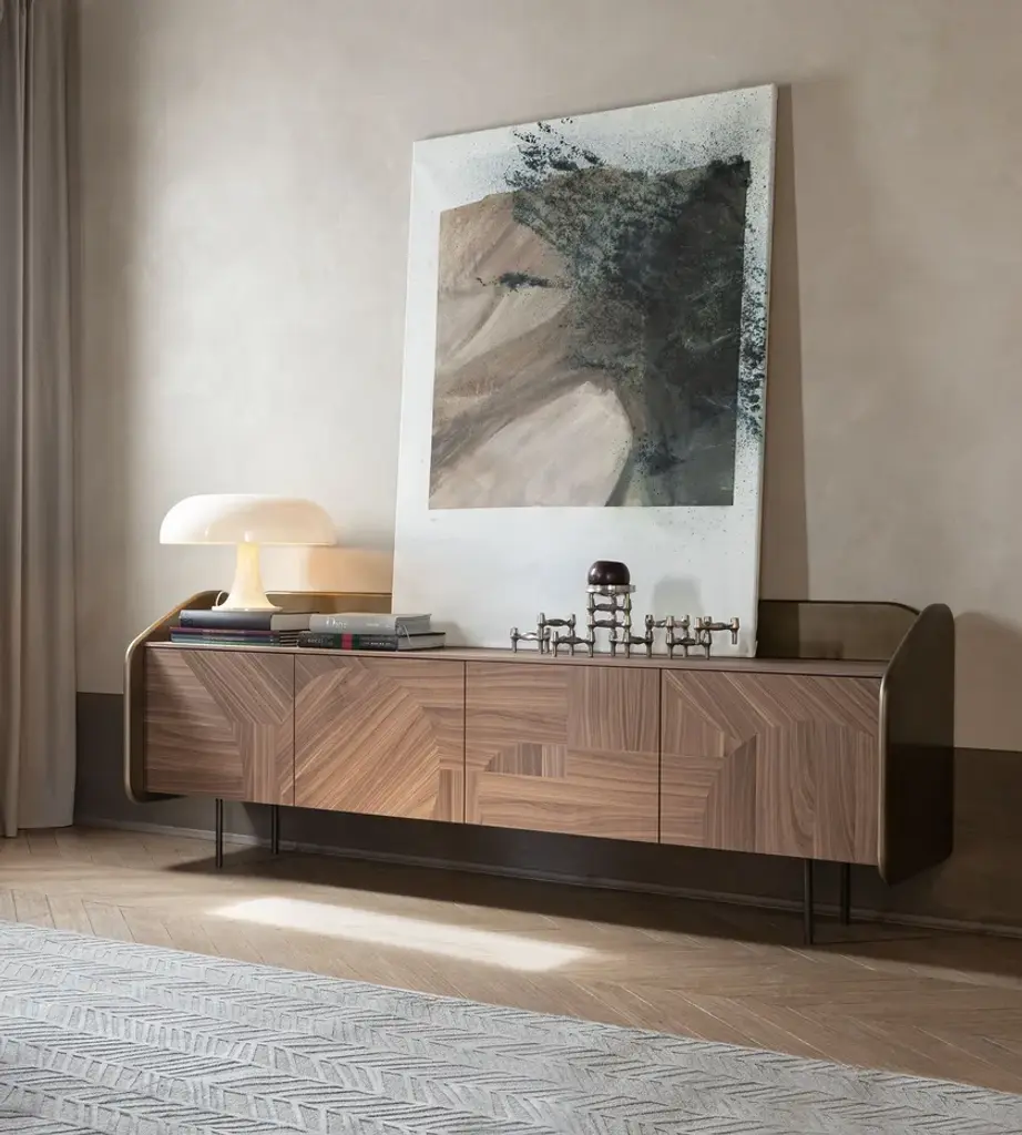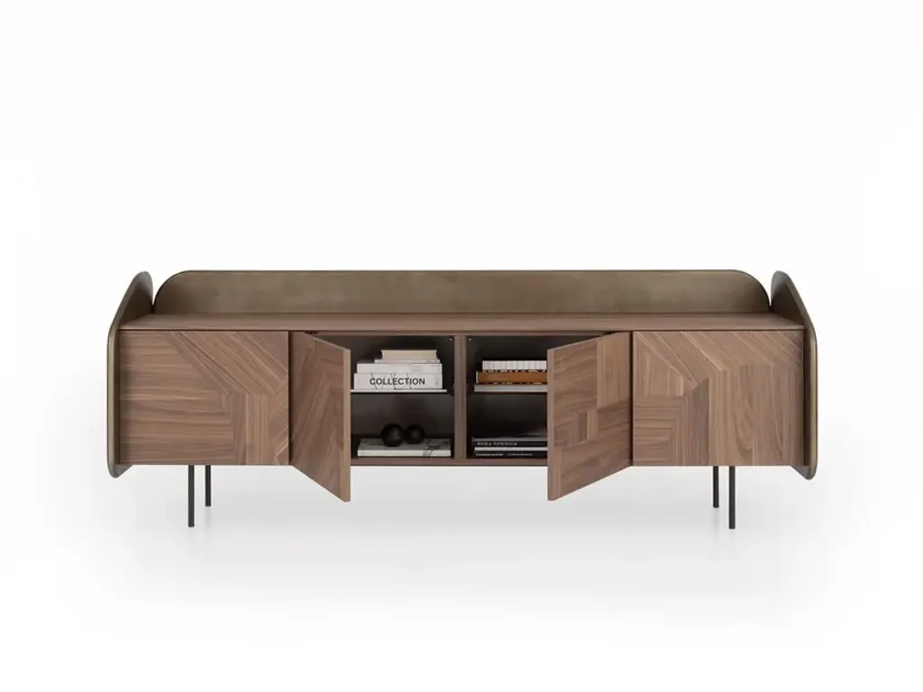 The Intarsio sideboard is a synthesis of craftsmanship and design, a tribute to the mastery of marquetry craftsmen who, since the Renaissance, have created delicate geometries and plays of grain. A timeless piece that celebrates the tradition of marquetry with a contemporary aesthetic, perfect to embellish the living area or the living room.FeaturesSideboard with a top in MDF veneered in Canaletto walnut and 4 doors in MDF veneered in Canaletto walnut with an inlay pattern. Structure in MDF with Oxidized Bronze water-based finish, interior in matching color. Base in powder-coated metal with a dark bronzed finish. The sideboard features 4 shelves made of 6 mm smoked transparent glass, with adjustable height brackets.Additional shelves available upon request.Haute Couture gets its inspiration from high fashion, where stitching, workmanship and materials are at the core of the design. Dressers are outfitted using hand-crafted leather, the furniture is embellished using precious marble, and the wood is selected on the basis of its grain. The synthesis of this collection is a modern line with a contemporary slant that is embodied in a luxury that is not overly flashy but grounded in sophistication. Timeless products made with high quality materials and handcrafted in Italy.