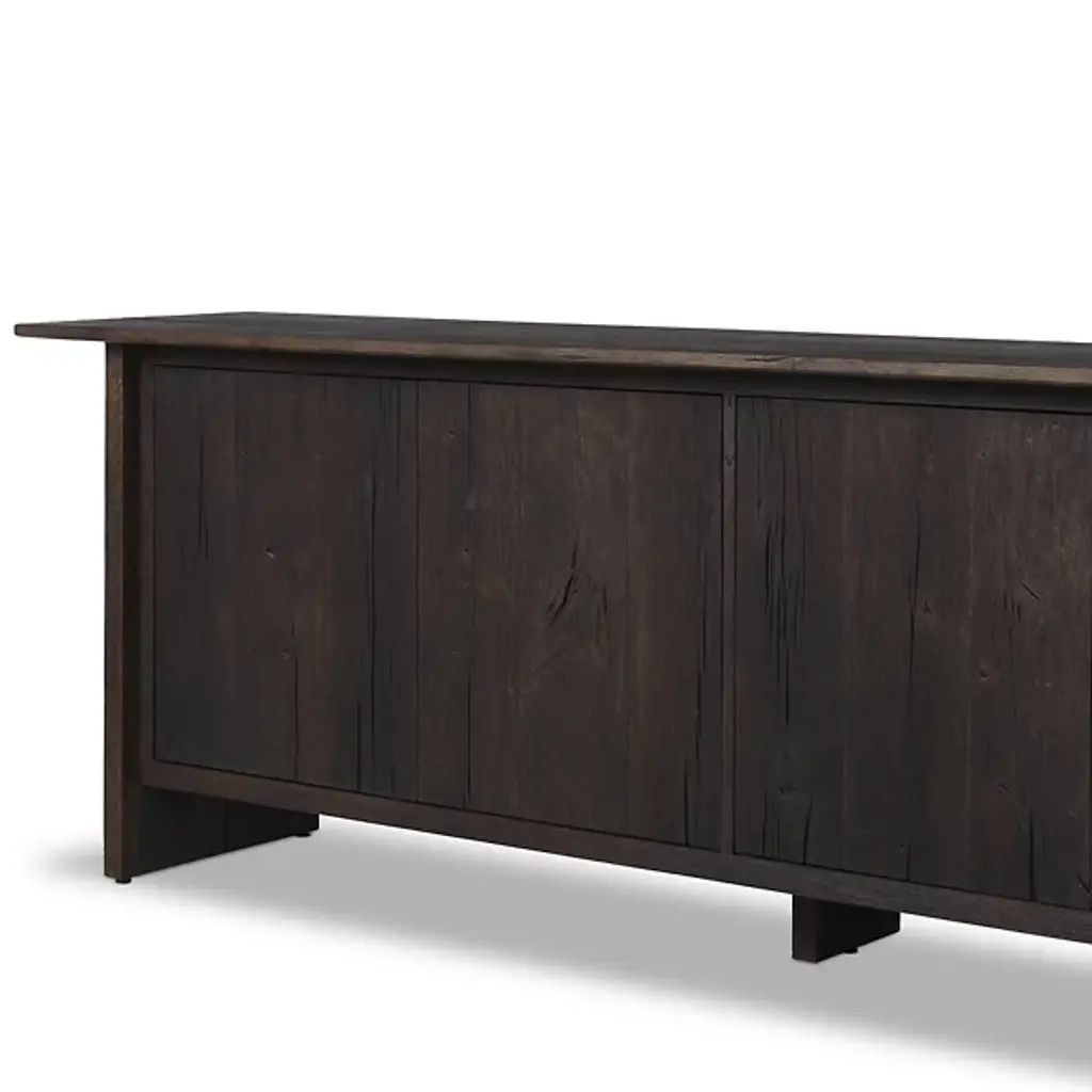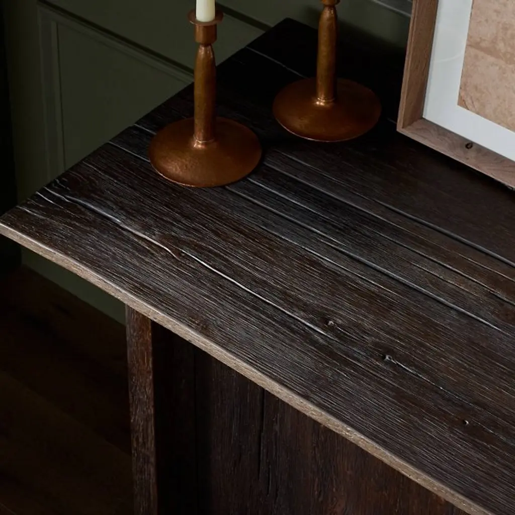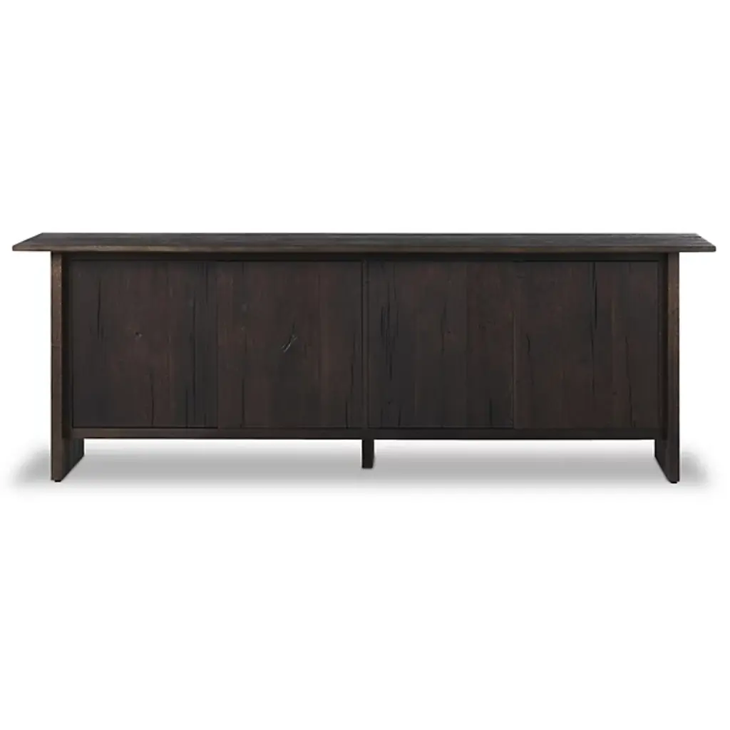 The Irina Sideboard from Four Hands draws inspiration from Japanese teahouse architecture through its re-sawn oak construction and distinctive burnt finish treatment. Light maple veneer accents contrast beautifully with the darker oak surfaces while simple panel legs support an oversized top that creates visual balance through careful proportional relationships. The burnt finish adds depth and character to the wood grain patterns, enhancing the natural material expression throughout.