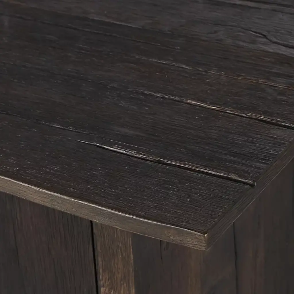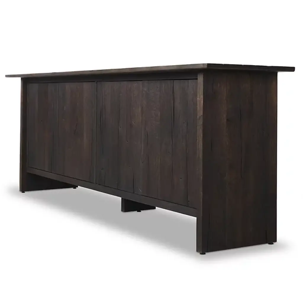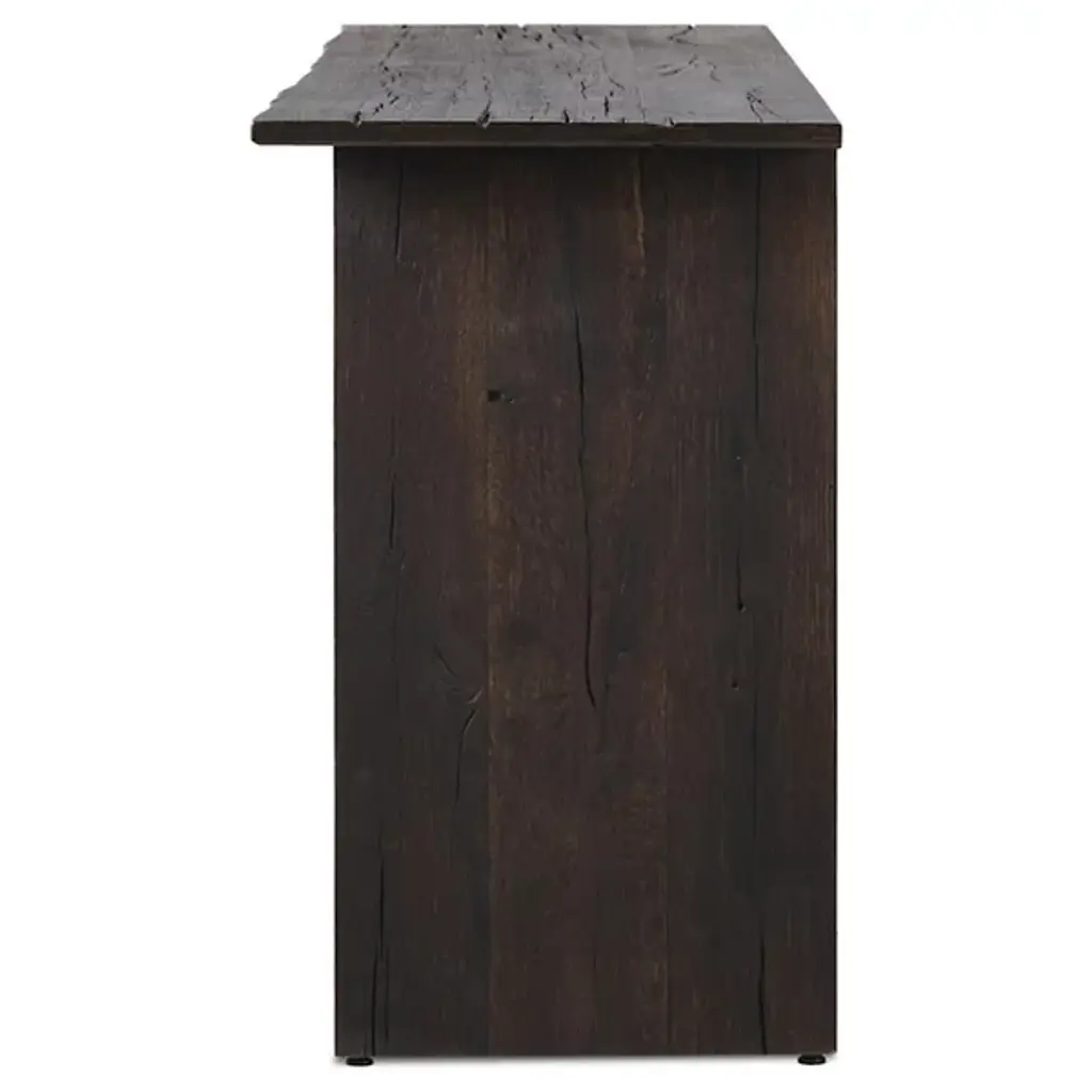 The Irina Sideboard from Four Hands draws inspiration from Japanese teahouse architecture through its re-sawn oak construction and distinctive burnt finish treatment. Light maple veneer accents contrast beautifully with the darker oak surfaces while simple panel legs support an oversized top that creates visual balance through careful proportional relationships. The burnt finish adds depth and character to the wood grain patterns, enhancing the natural material expression throughout.