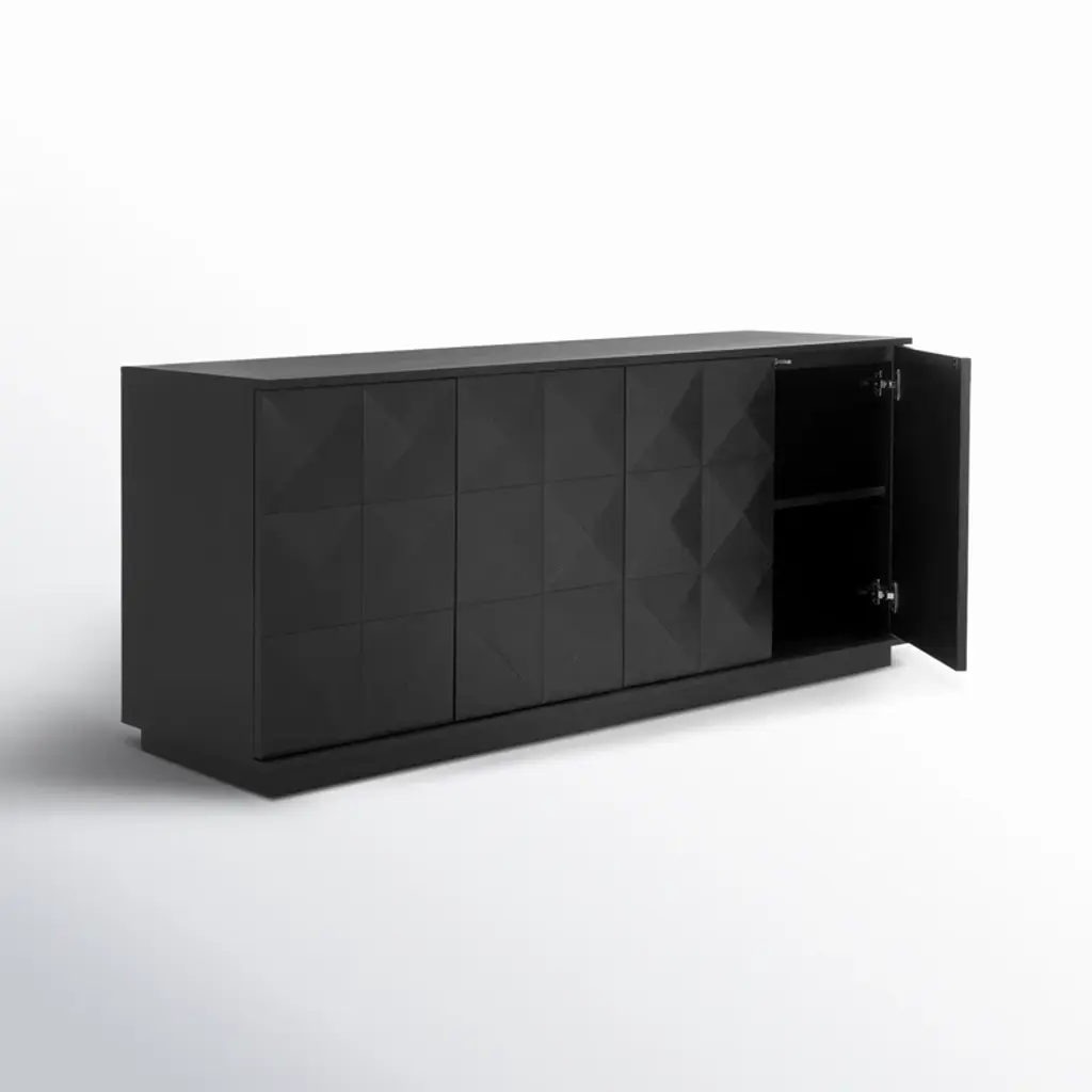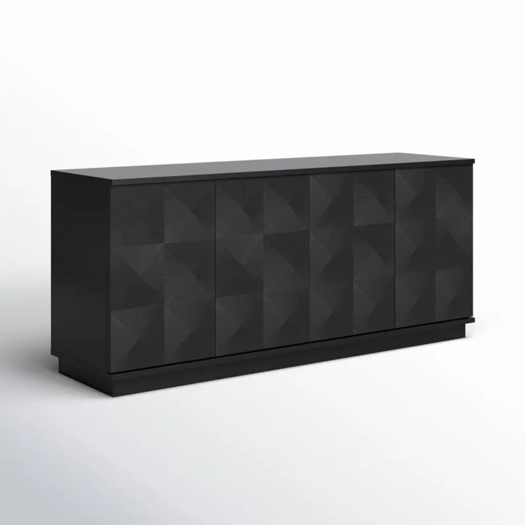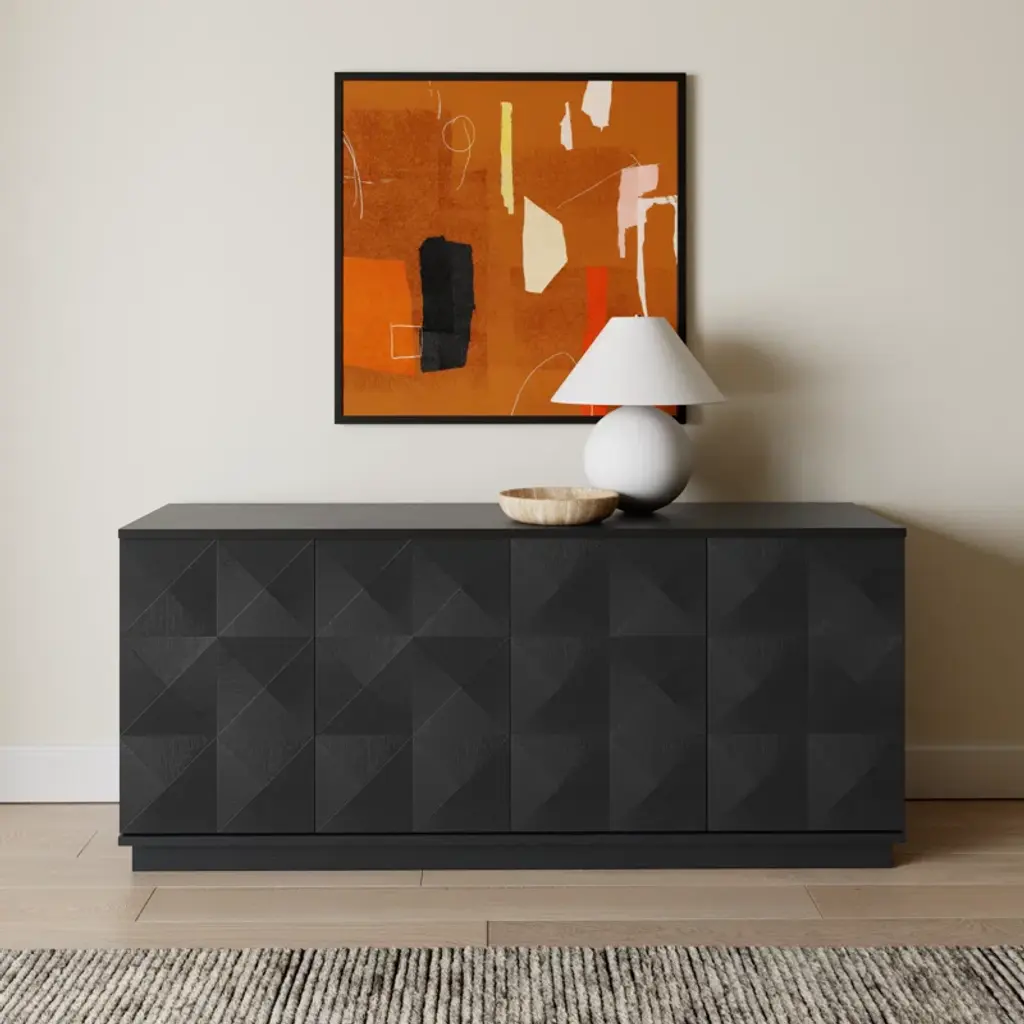 This sideboard features a bold black finish and geometric detailing. Crafted from kiln-dried wood, it includes four cabinet doors and interior shelves for plenty of storage. The dovetail joinery ensures stability, and the finished back allows flexible placement. Use the shelves to store dishes or linens, and top with a pair of accent lamps.