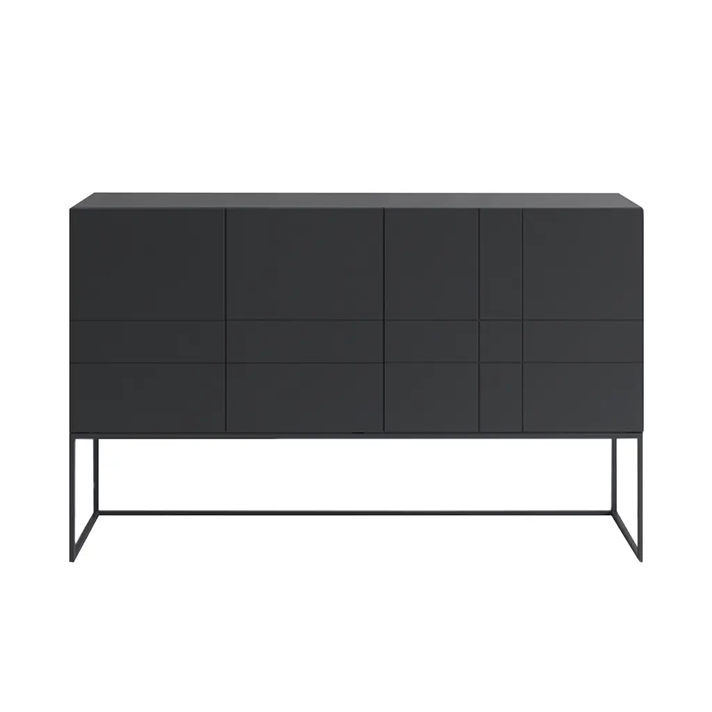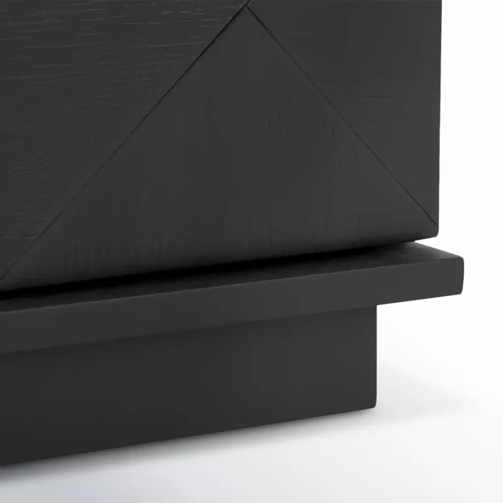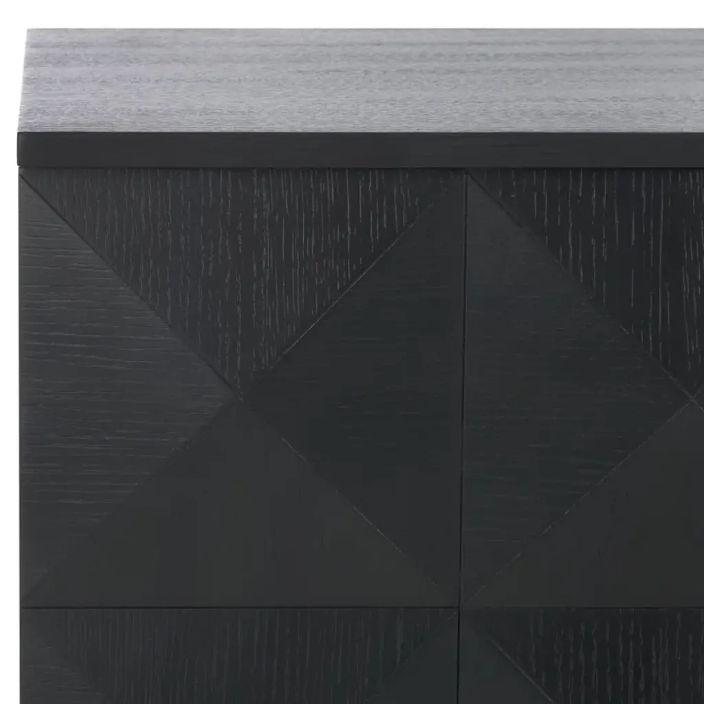 This sideboard features a bold black finish and geometric detailing. Crafted from kiln-dried wood, it includes four cabinet doors and interior shelves for plenty of storage. The dovetail joinery ensures stability, and the finished back allows flexible placement. Use the shelves to store dishes or linens, and top with a pair of accent lamps.