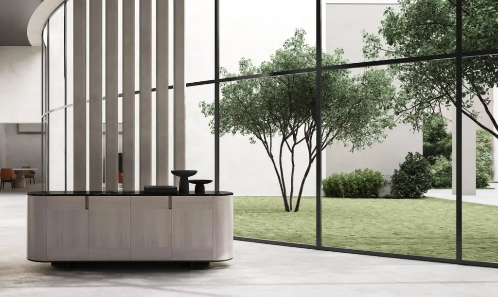 This is a low sideboard, designed to combine elegance and functionality. The structure is made of high-quality wood, offering durability and a timeless aesthetic. The top surface can be crafted from wood for a warm, natural look or from marble for a more luxurious and refined touch.