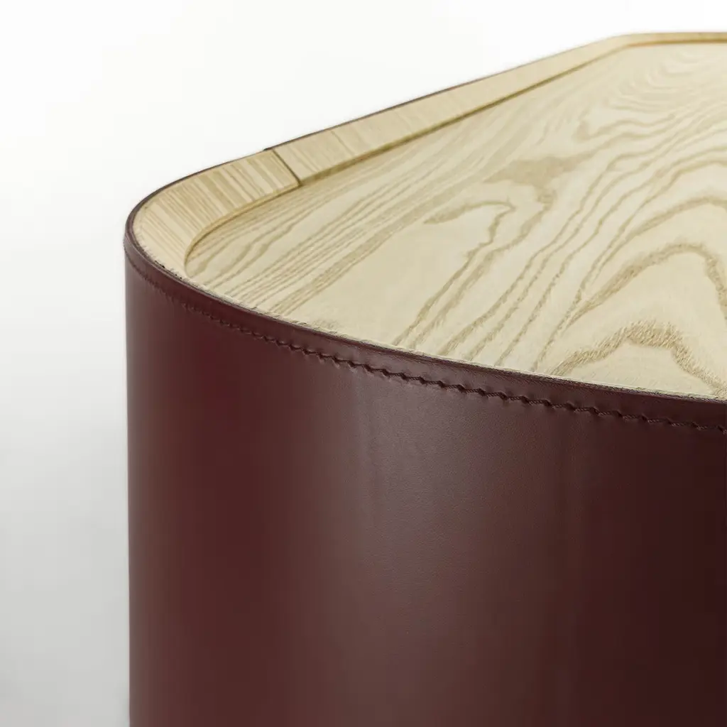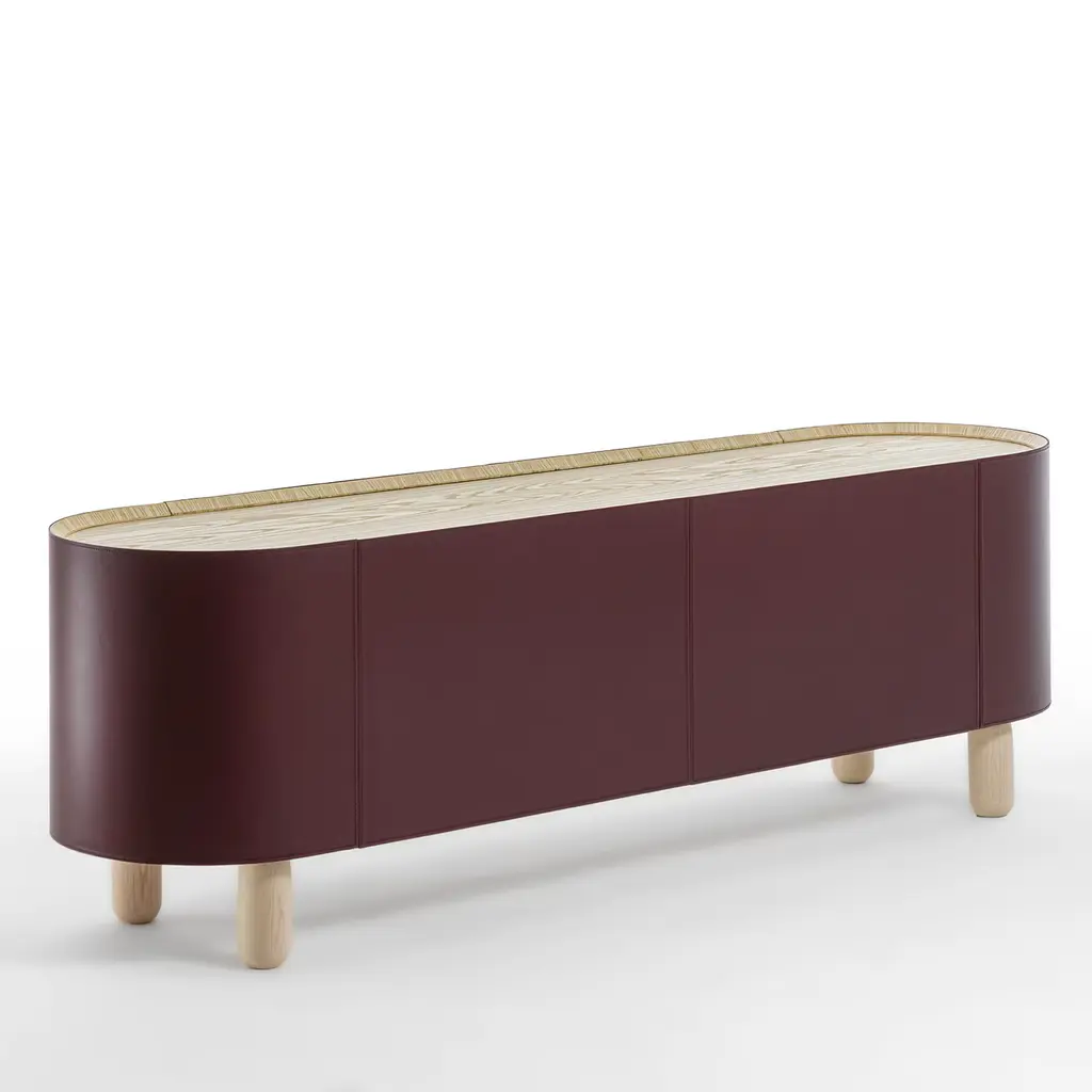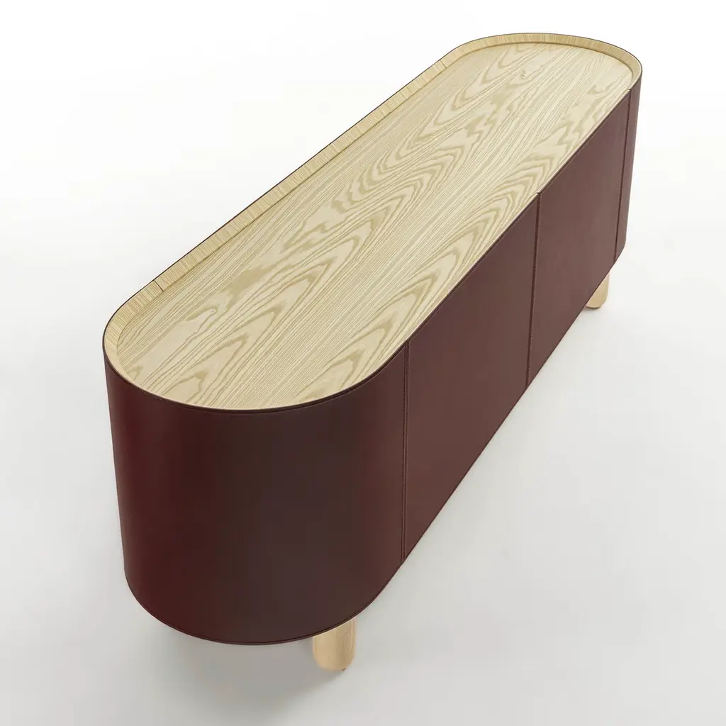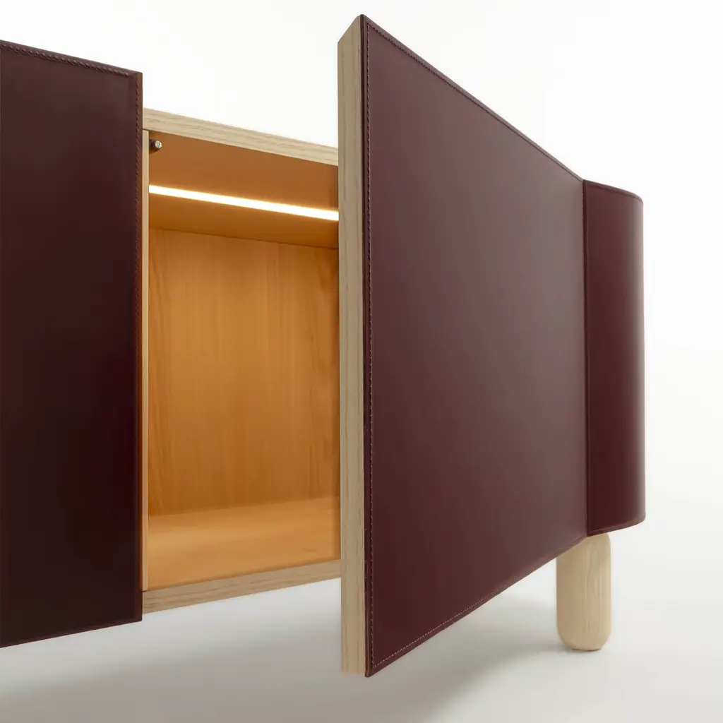 Sideboard with a structure available in ash or Canaletto walnut, featuring two hinged doors, an internal divider, built-in LED lighting, and leather covering. Four-leg turned wood base available in ash or Canaletto walnut. Perfect for adding a touch of elegance to any room, it combines contemporary design and functionality.