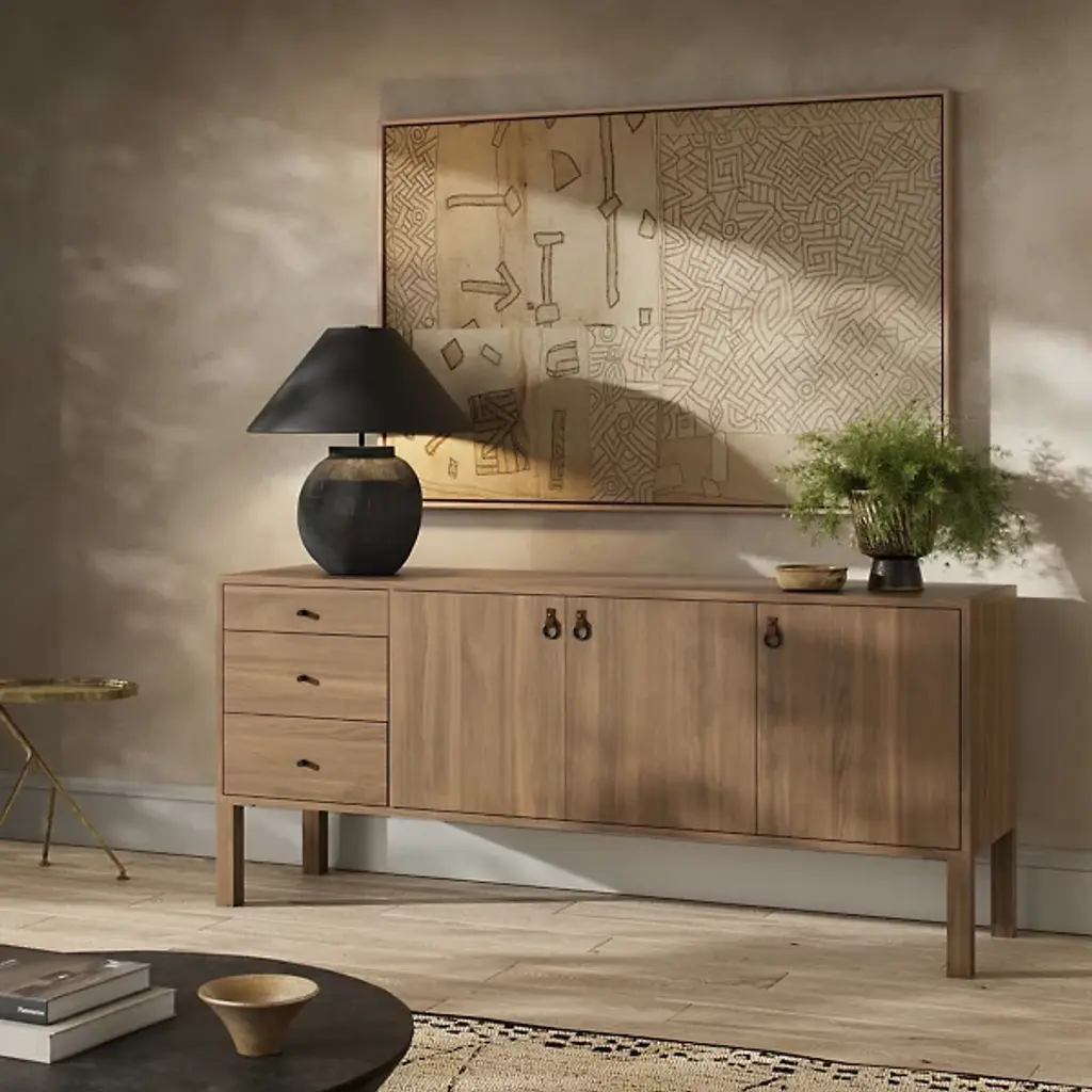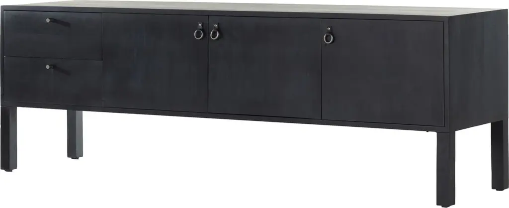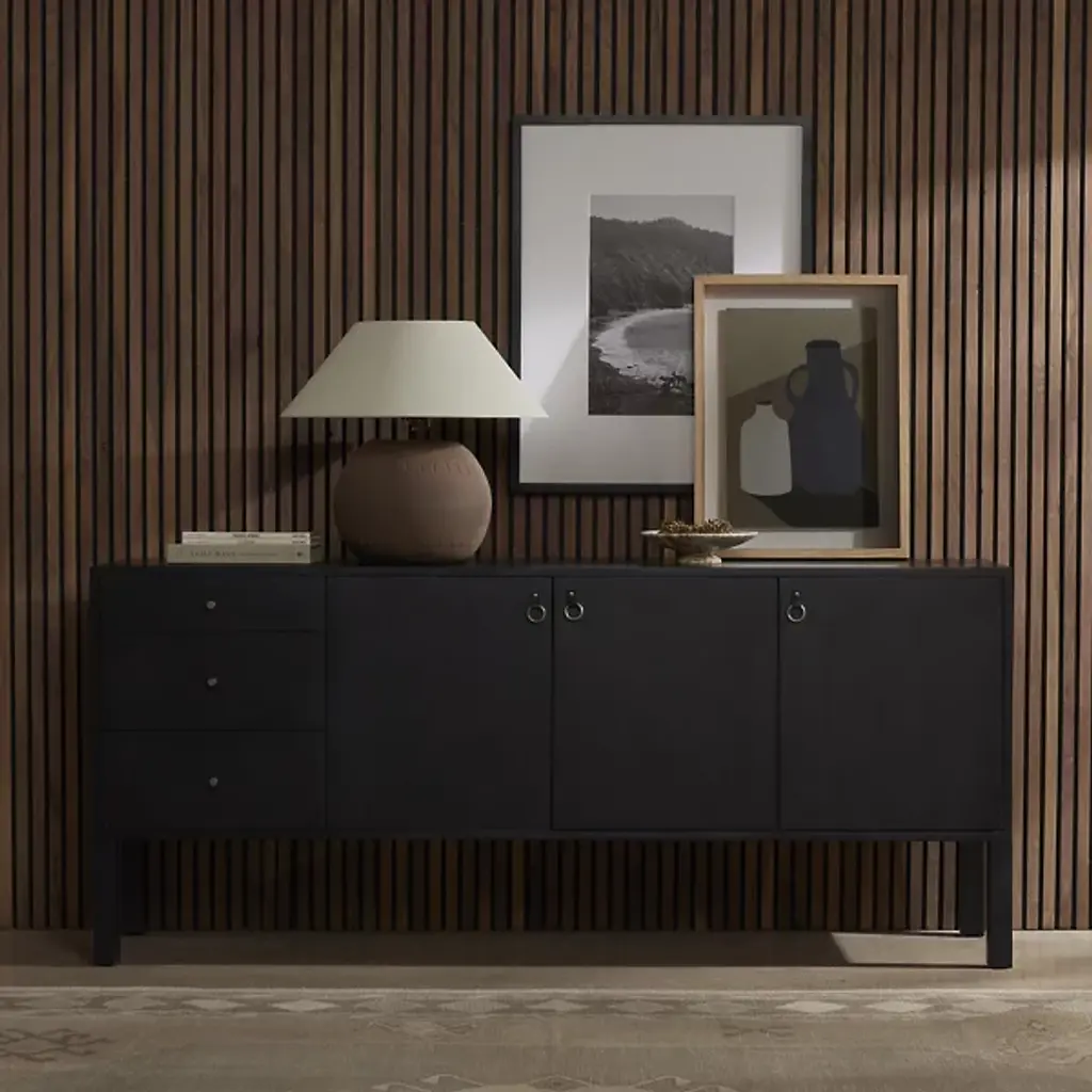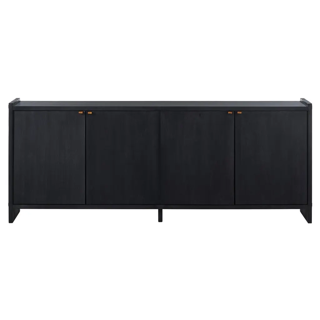 The Isador Sideboard from Four Hands captures a beautifully simple, Shaker-inspired design with a modern twist. Crafted from black-washed solid poplar, it features faux dovetail joinery, enhancing its minimalist appeal. The addition of iron and leather hardware brings a material-driven update, blending rustic and industrial elements for a fresh look. Designed for style and functionality, the sideboard includes rear cutouts for easy cord management, making it a versatile and refined storage solution for any space.