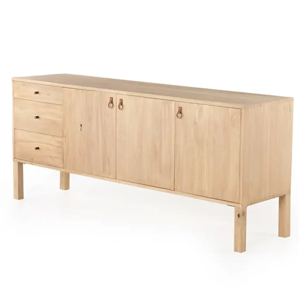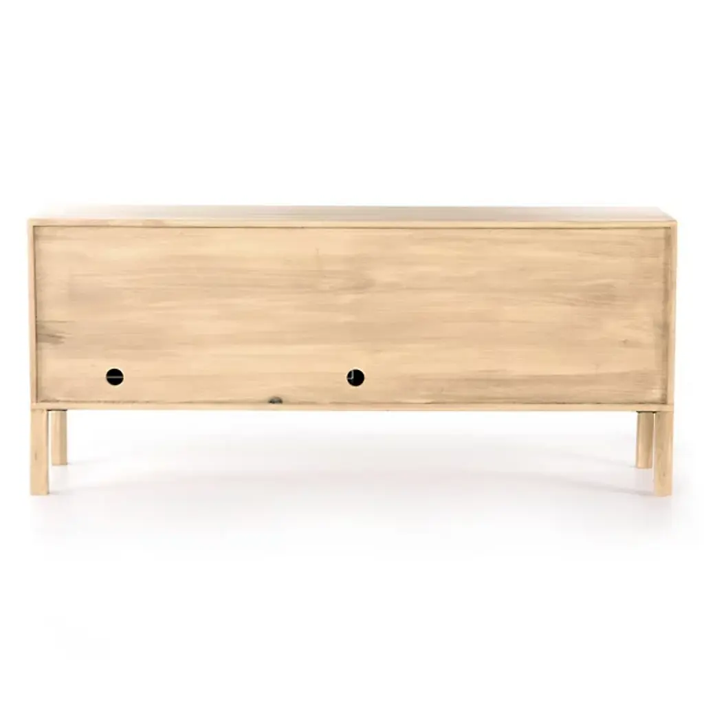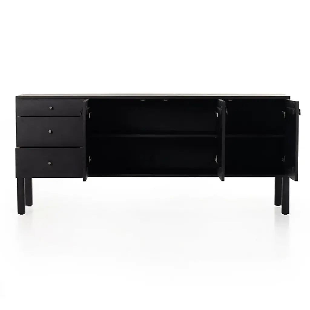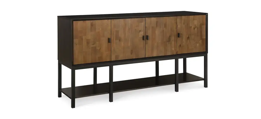 The Isador Sideboard from Four Hands captures a beautifully simple, Shaker-inspired design with a modern twist. Crafted from black-washed solid poplar, it features faux dovetail joinery, enhancing its minimalist appeal. The addition of iron and leather hardware brings a material-driven update, blending rustic and industrial elements for a fresh look. Designed for style and functionality, the sideboard includes rear cutouts for easy cord management, making it a versatile and refined storage solution for any space.