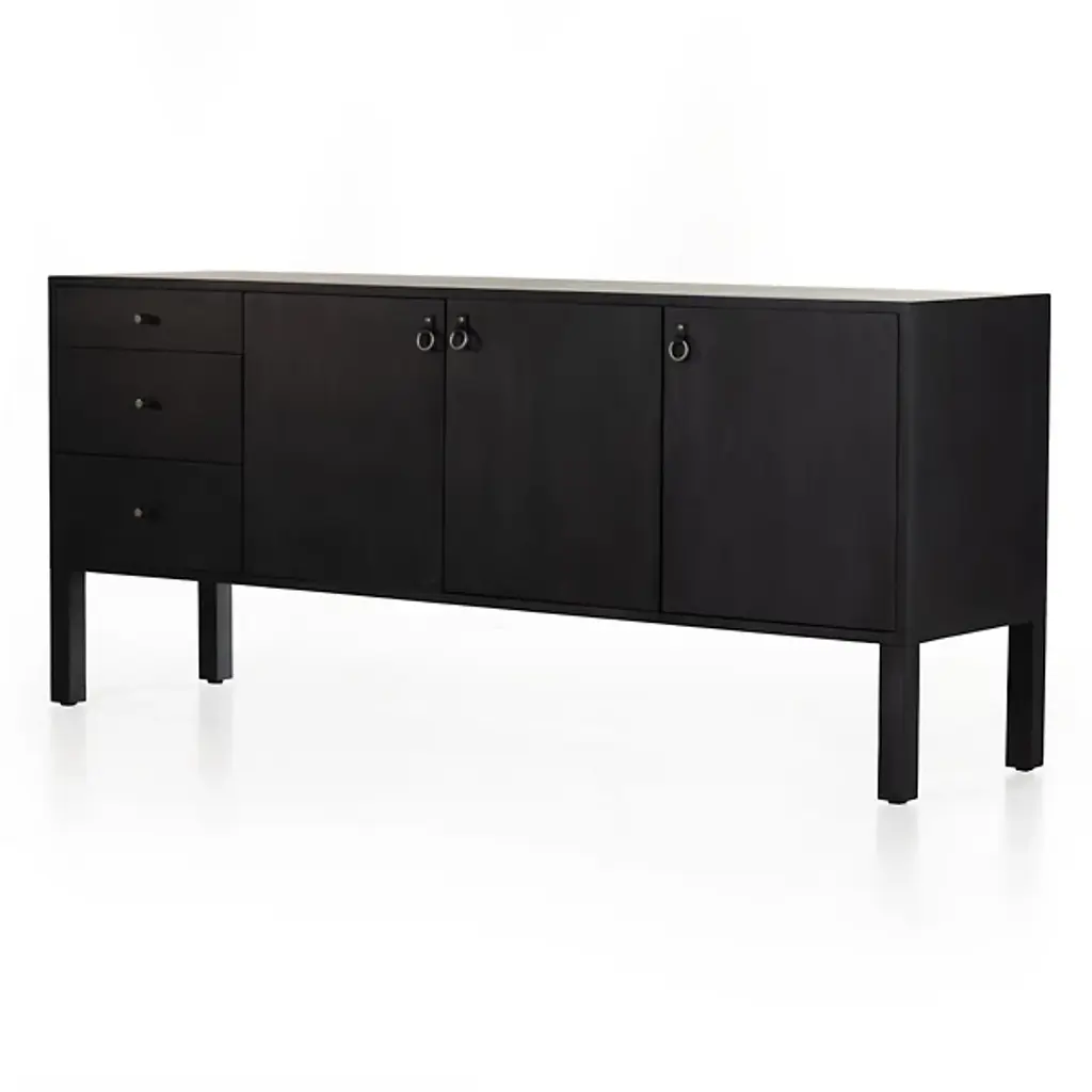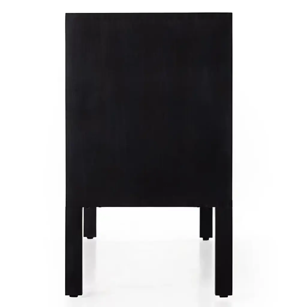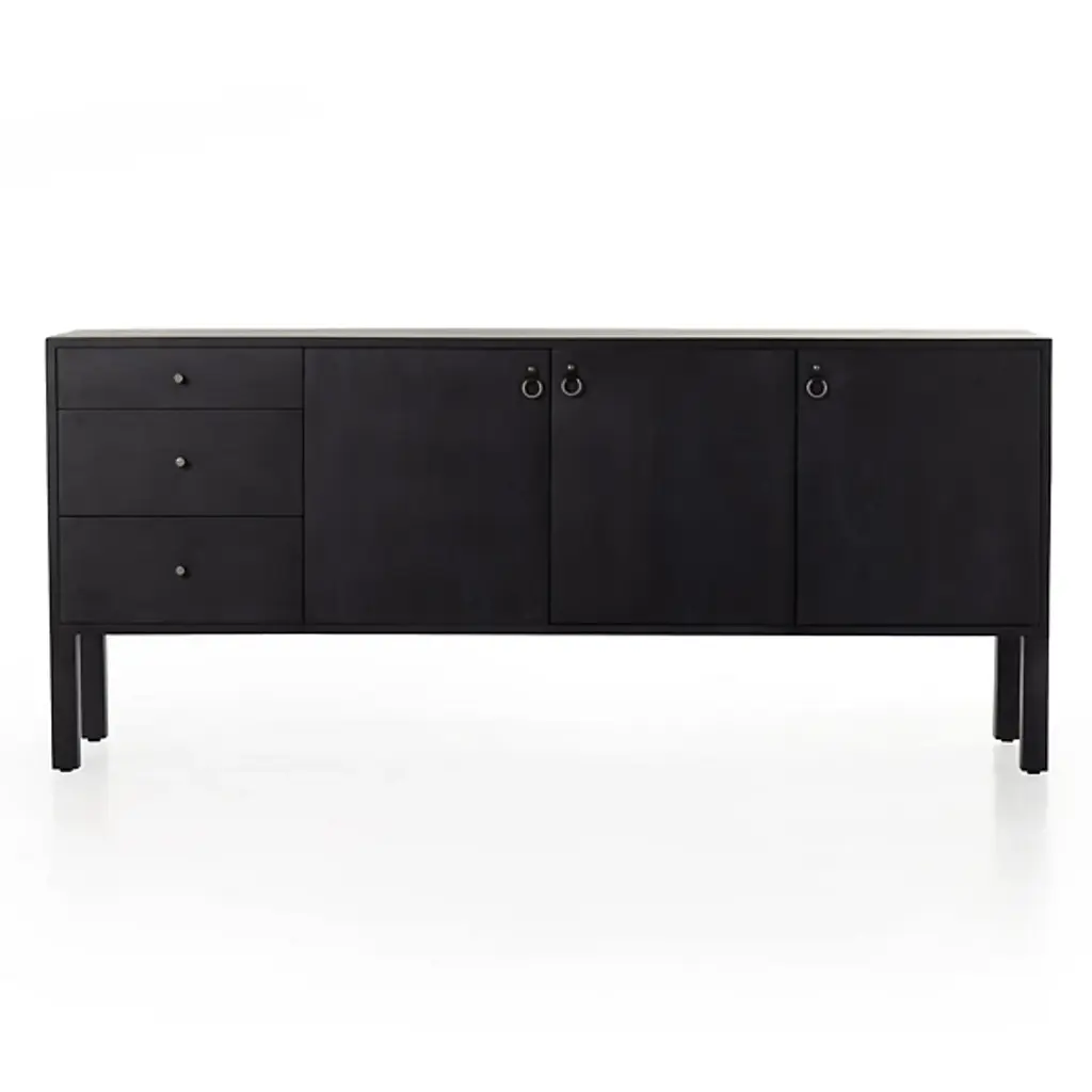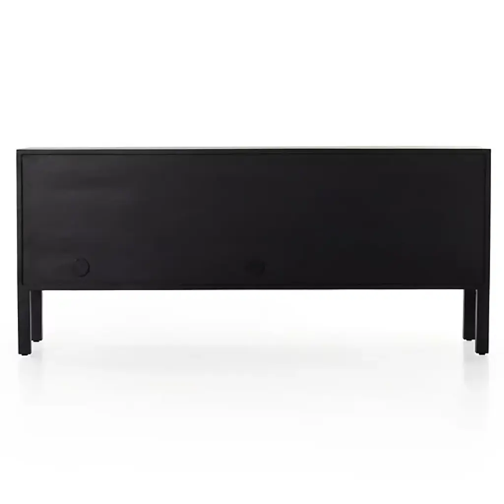 The Isador Sideboard from Four Hands captures a beautifully simple, Shaker-inspired design with a modern twist. Crafted from black-washed solid poplar, it features faux dovetail joinery, enhancing its minimalist appeal. The addition of iron and leather hardware brings a material-driven update, blending rustic and industrial elements for a fresh look. Designed for style and functionality, the sideboard includes rear cutouts for easy cord management, making it a versatile and refined storage solution for any space.